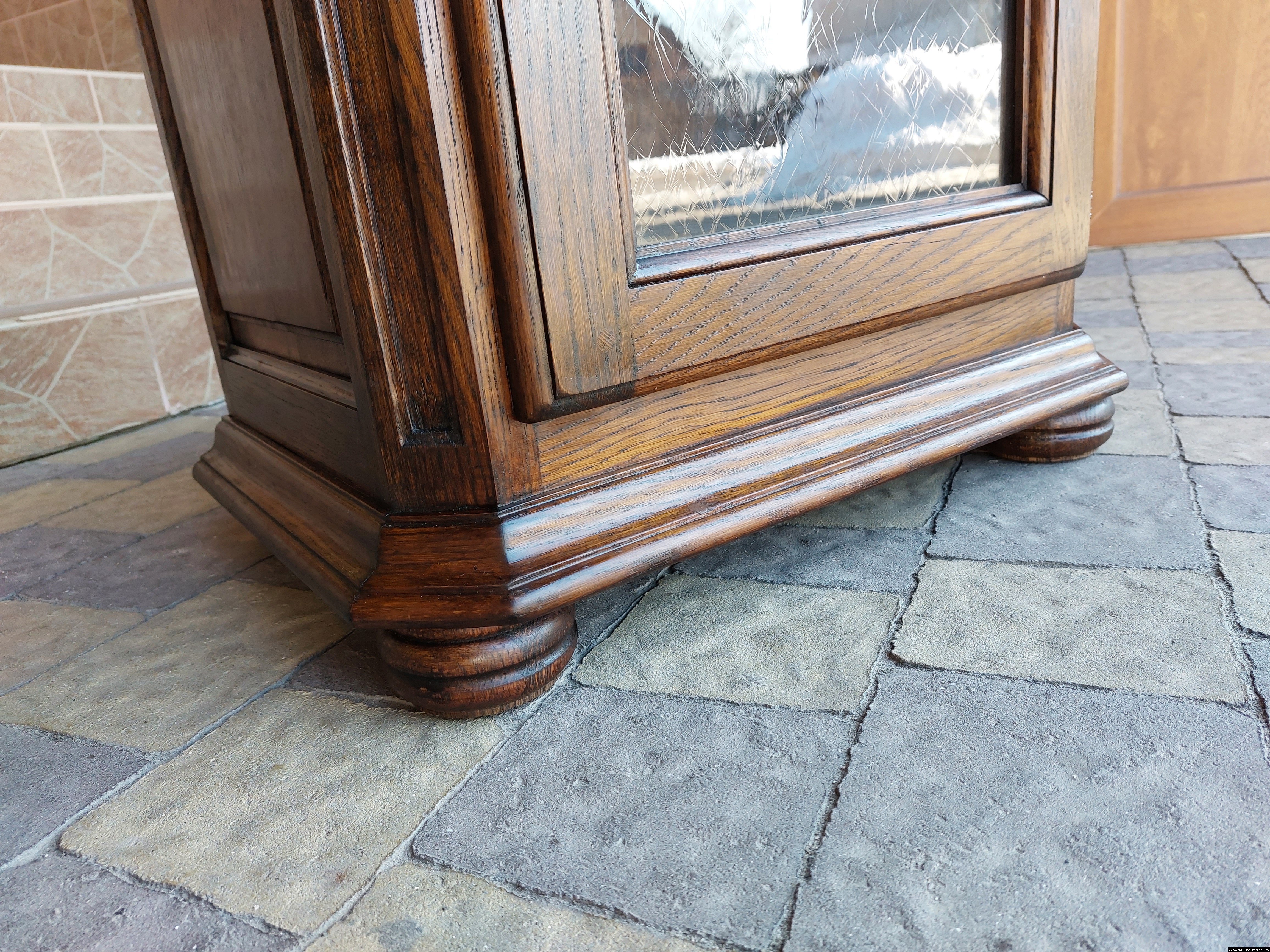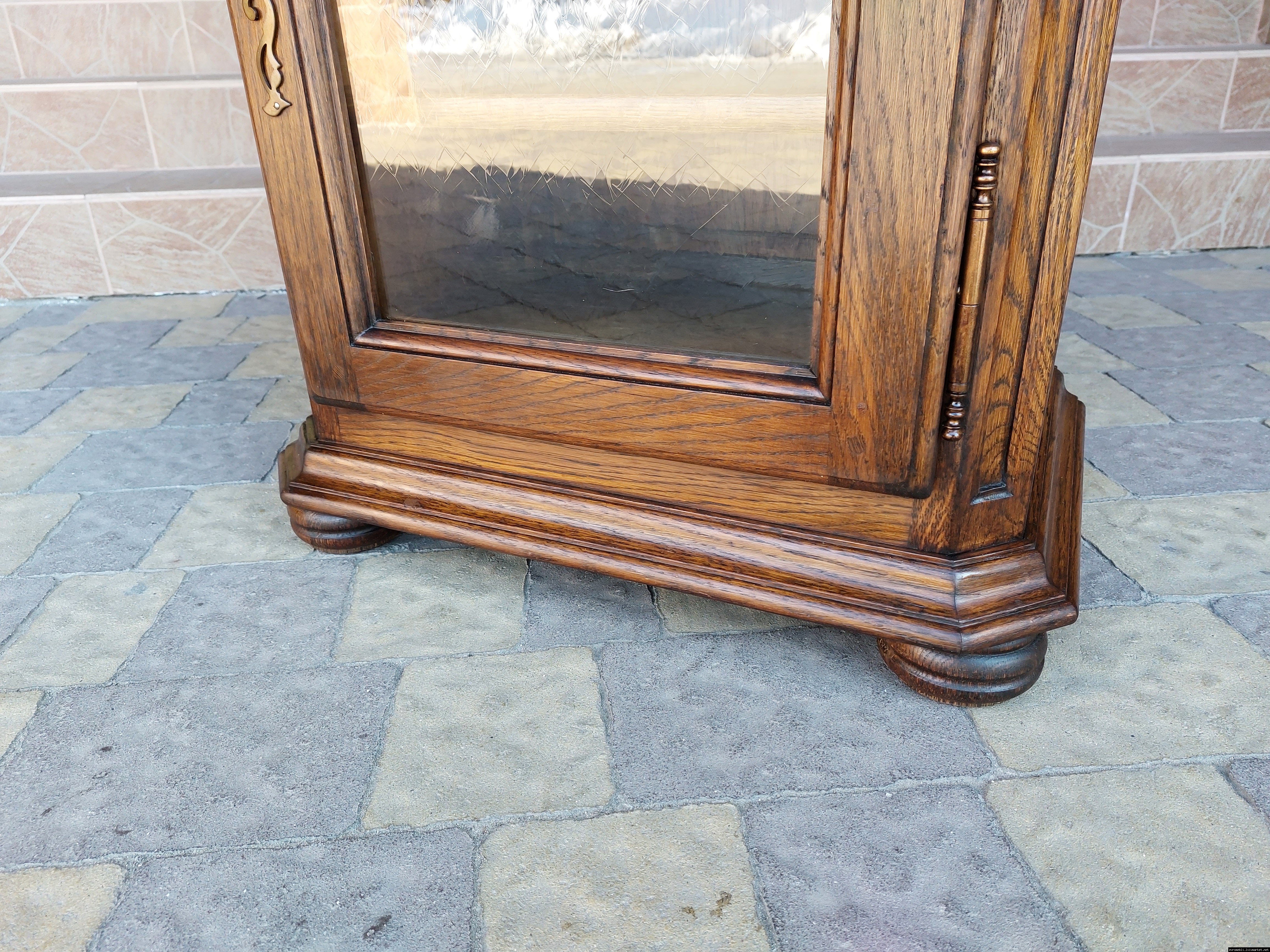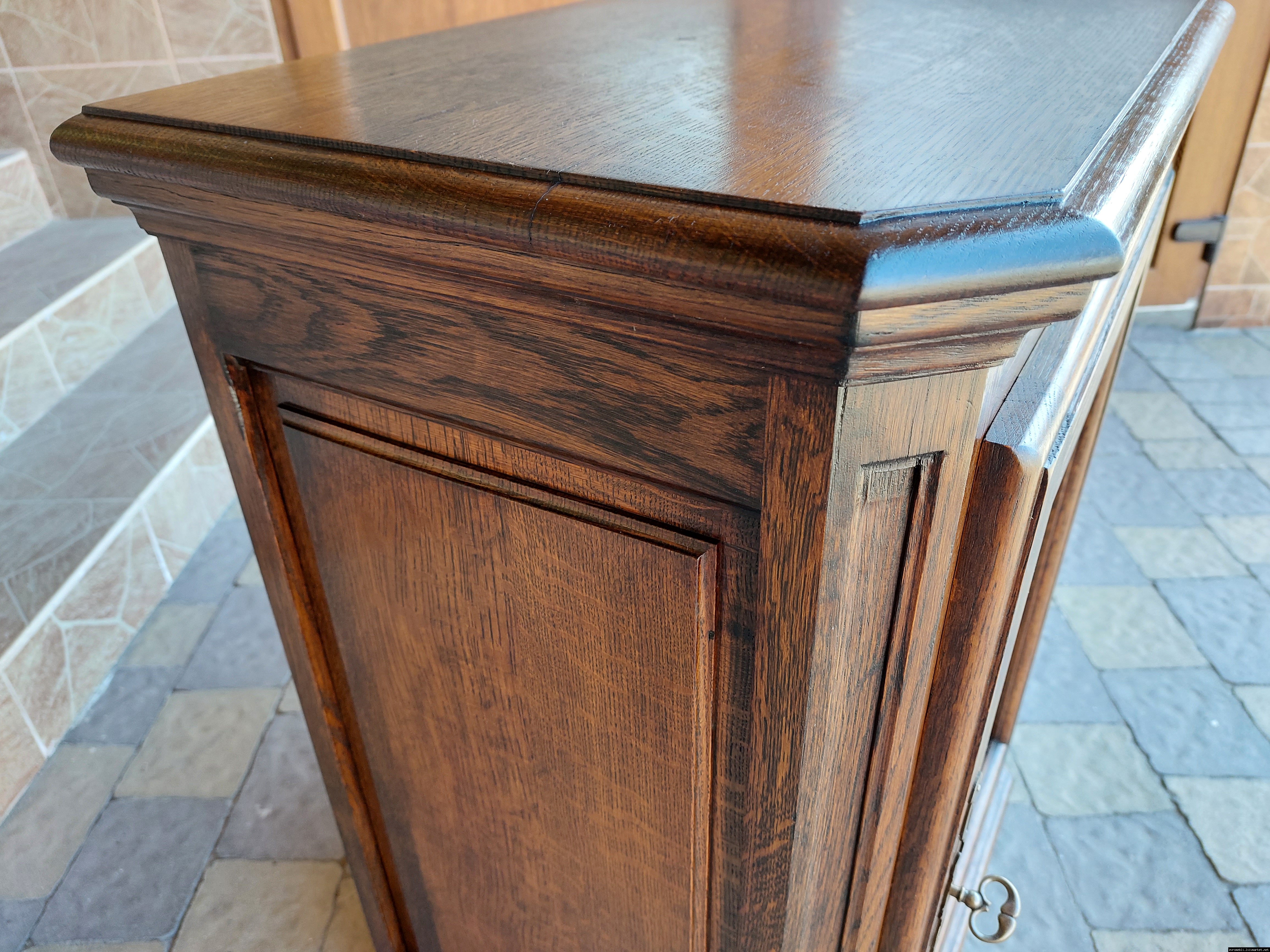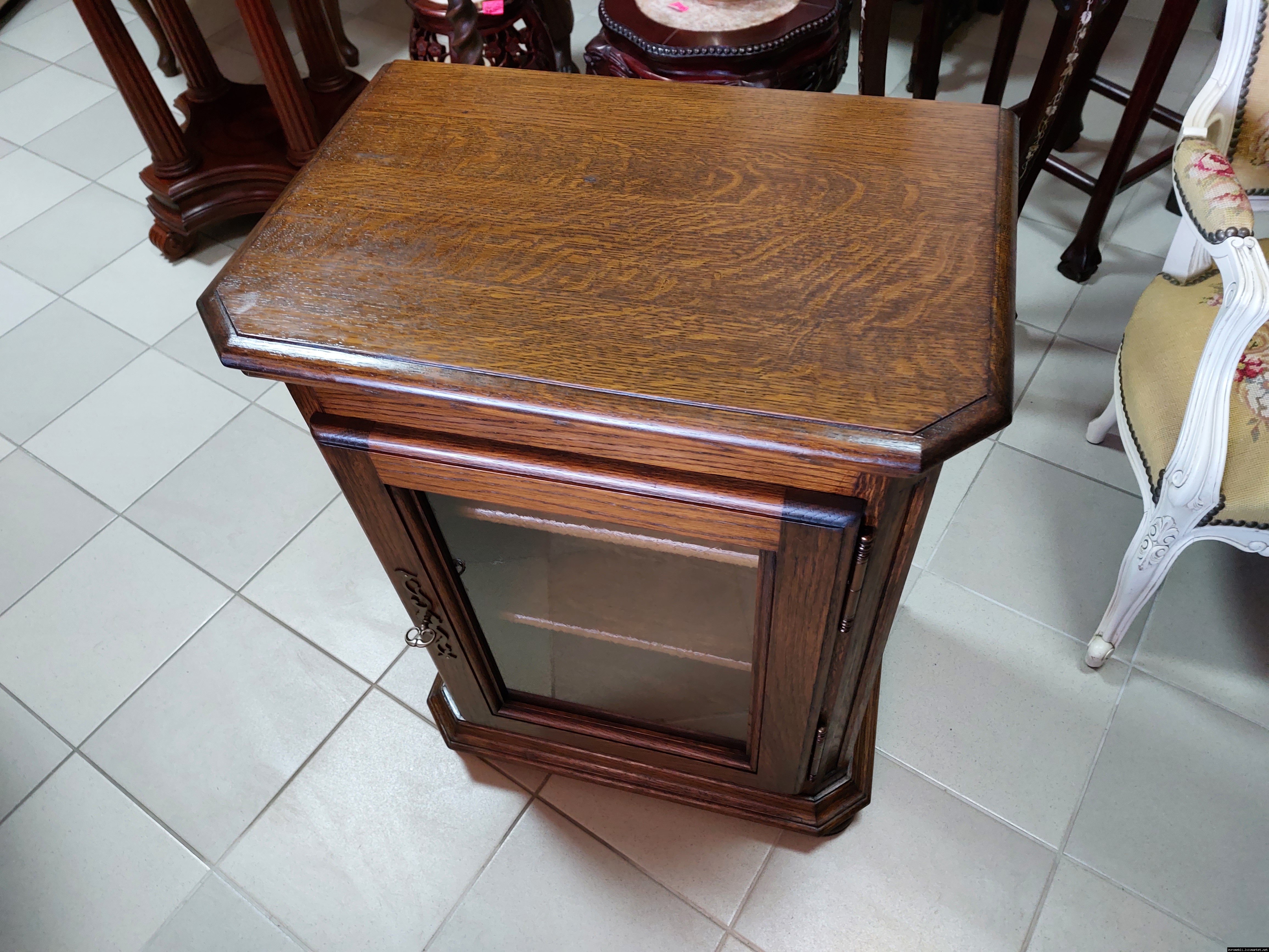 Дуже красива деревяна тумба в класичному стилі. Тумба виготовлена з натурального дерева, темний дуб, масив, має одну дверку зі склом, дверка зачиняється на ключ, всередині є деревяні полиці, висота полиць регулююється. Тумба в хорошому стані, проста та вишукана, повністю масивна, привезена з Бельгії.
