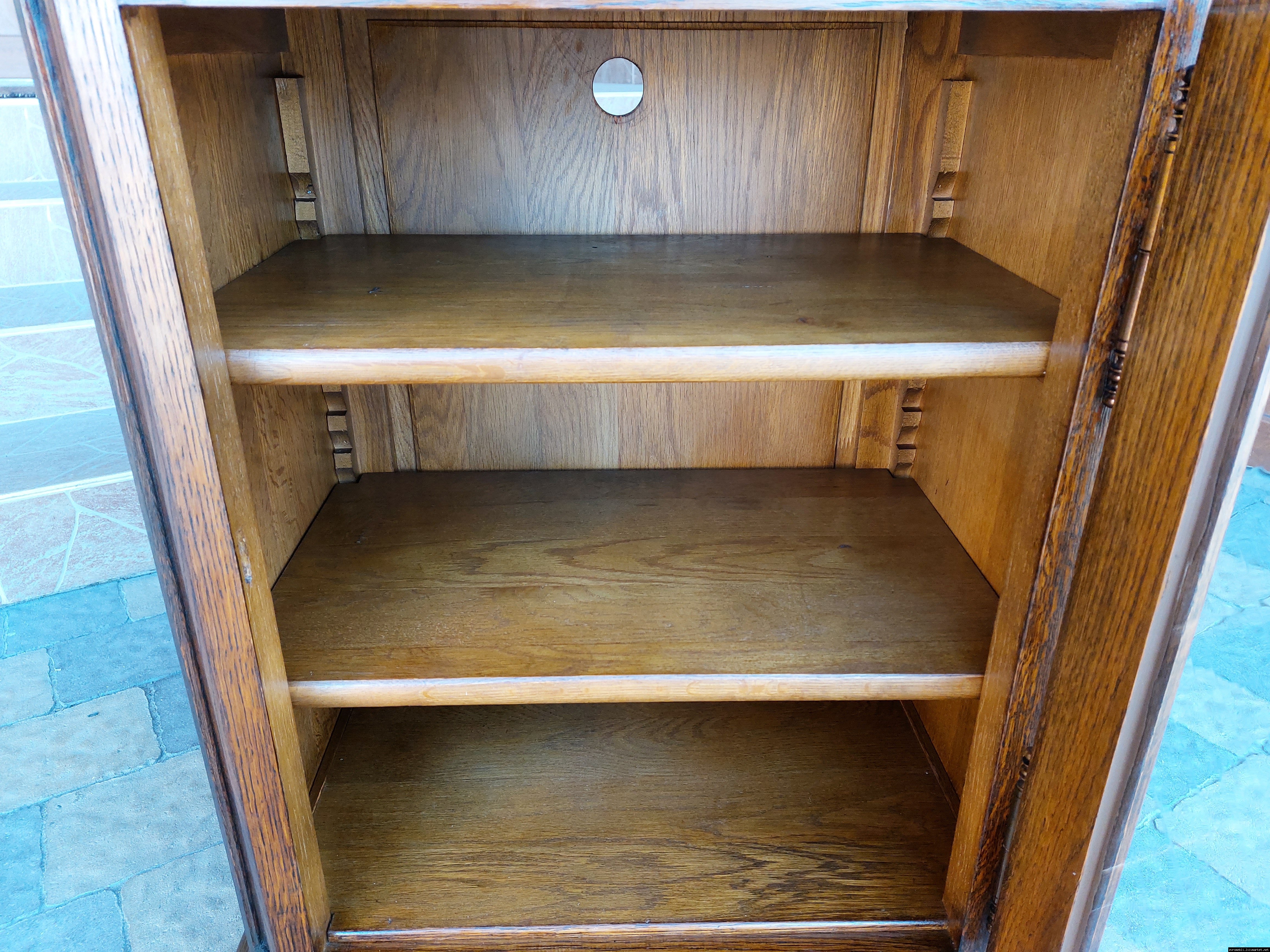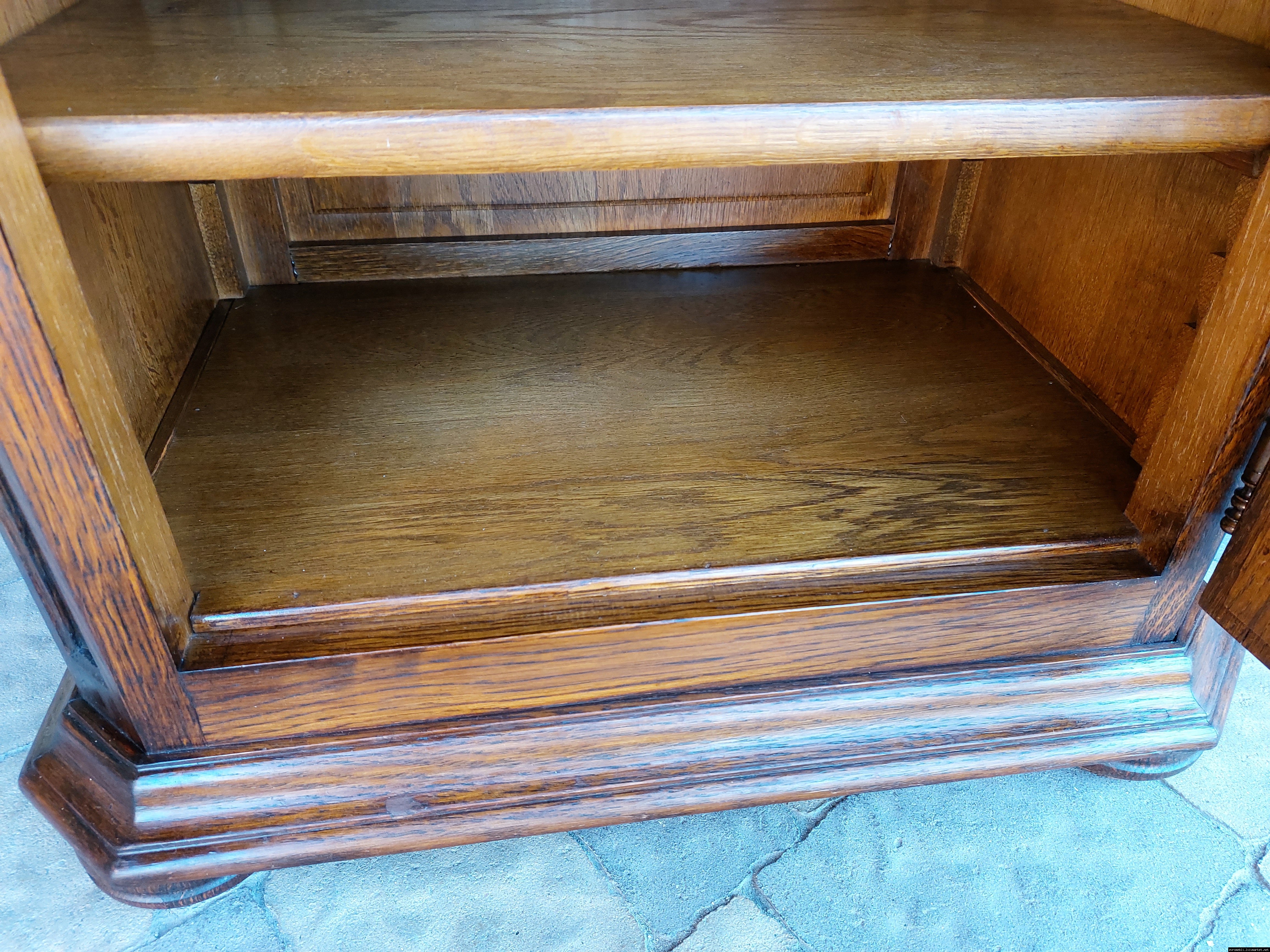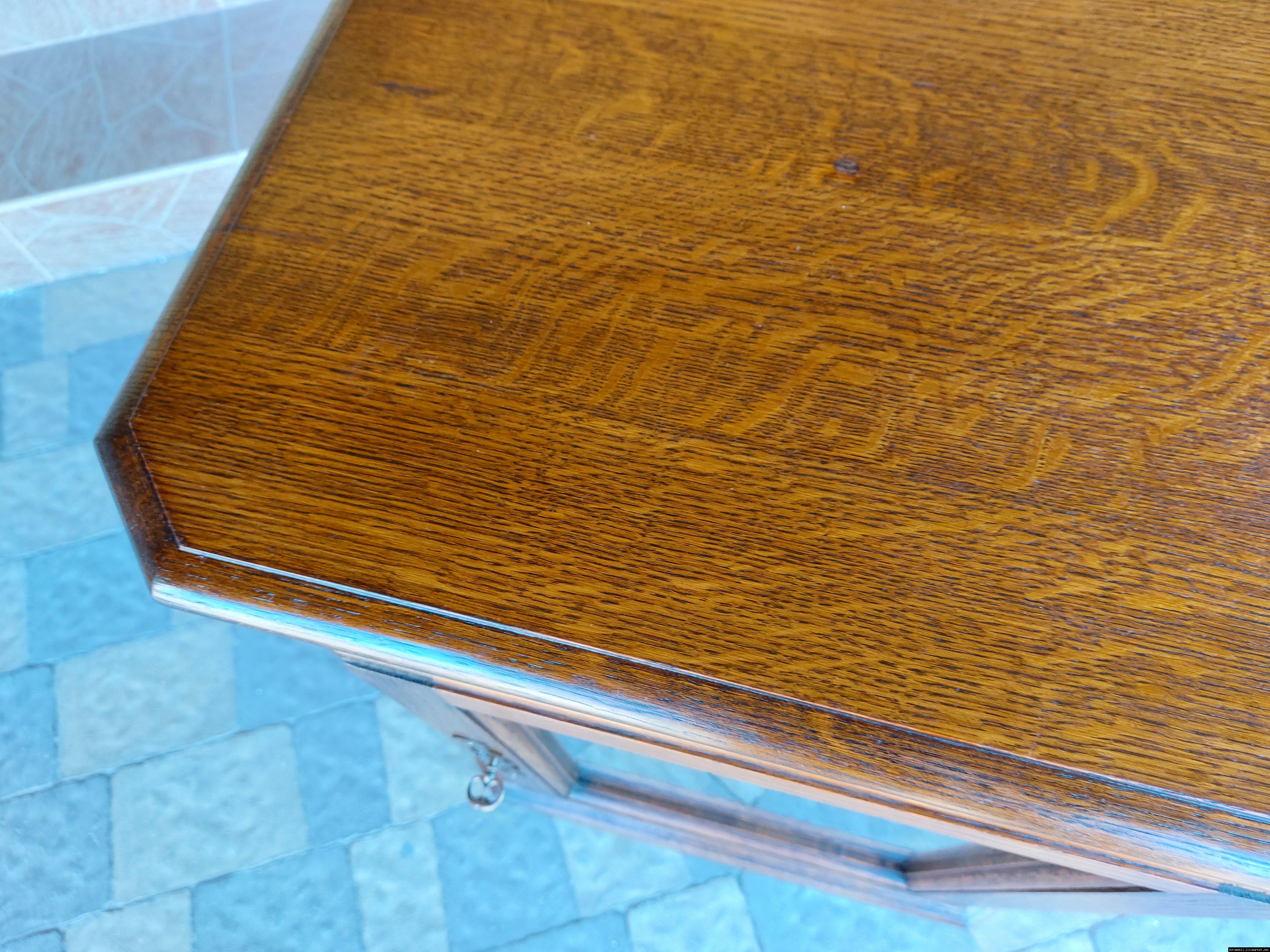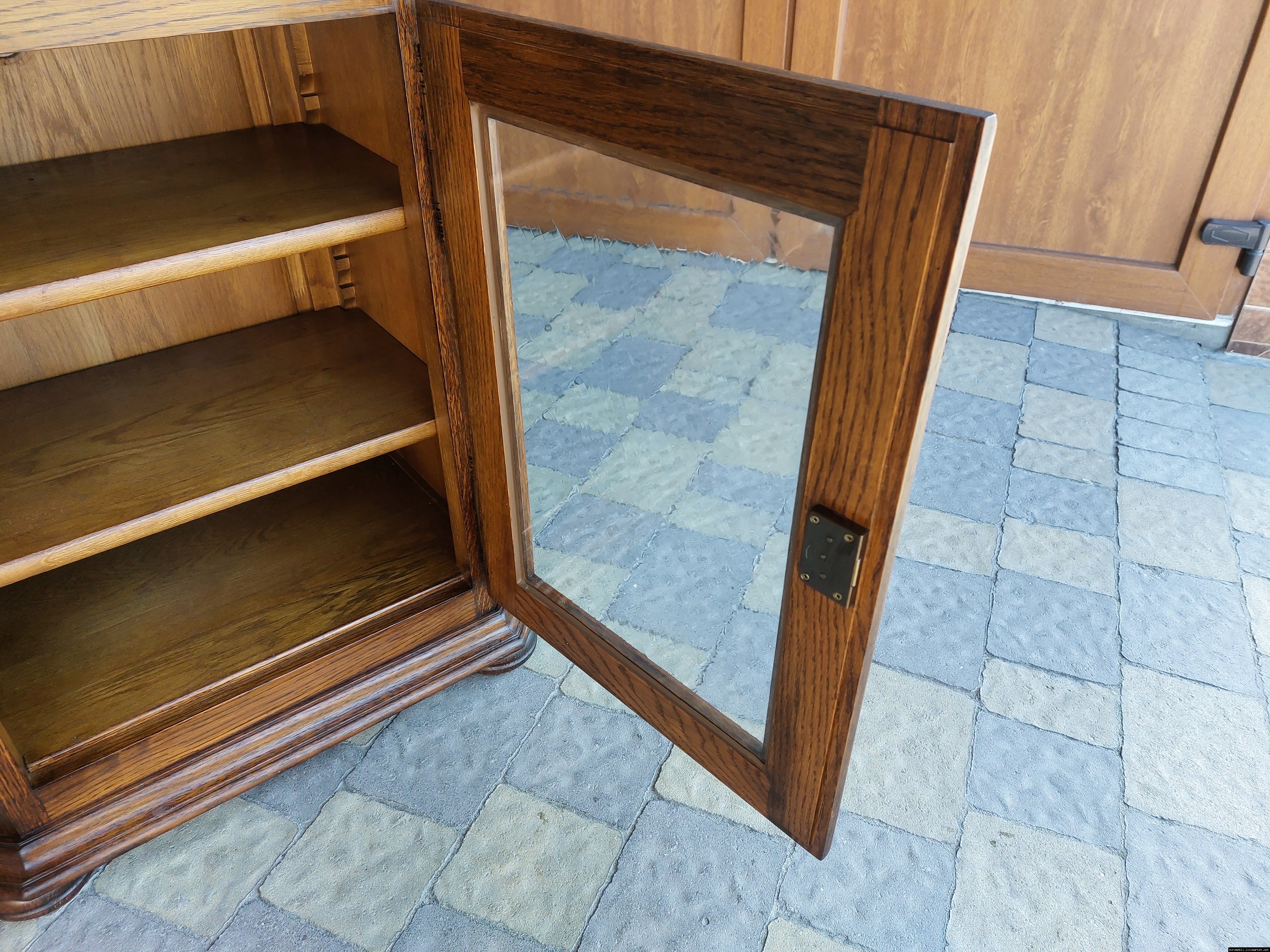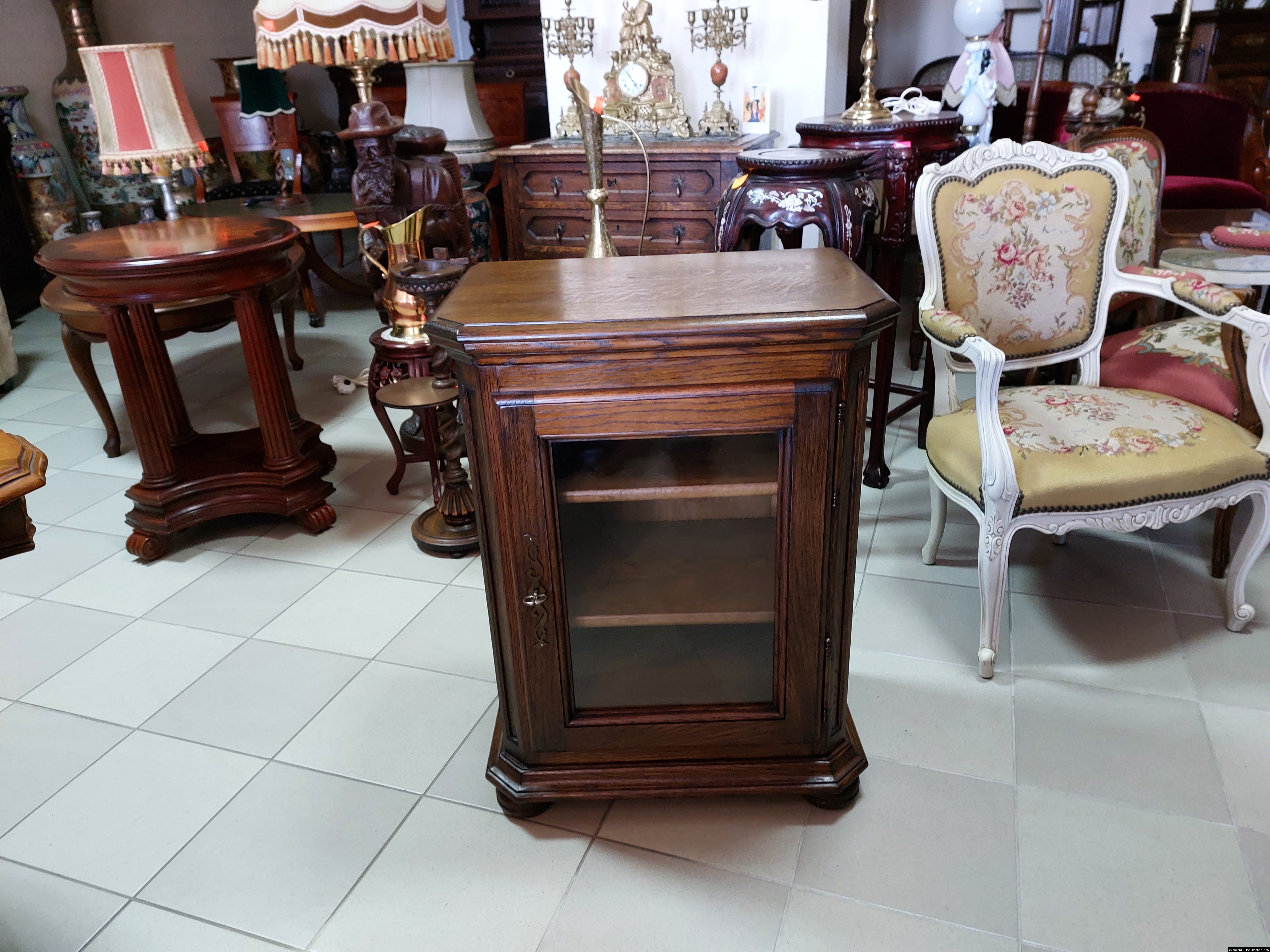 Дуже красива деревяна тумба в класичному стилі. Тумба виготовлена з натурального дерева, темний дуб, масив, має одну дверку зі склом, дверка зачиняється на ключ, всередині є деревяні полиці, висота полиць регулююється. Тумба в хорошому стані, проста та вишукана, повністю масивна, привезена з Бельгії.