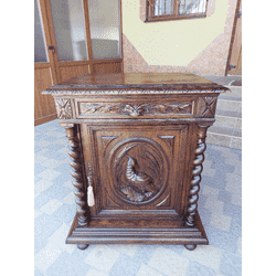 Велика, старовинна, антикварна, деревяна тумба в мисливському стилі Яхт. Тумба виготовлена з масиву натурального дерева, темний дуб, має одну дверку та одну шухляду, всередині є деревяна полиця. Тумба в мисливському стилі, декорована витими колонами та різьбою ручної роботи, різьба у вигляді тетерева. Тумба в хорошому стані, привезена з Бельгії.