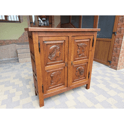 Дуже красива деревяна тумба- комод в стилі Ренесанс. Тумба виготовлена з натурального дерева, темно- золотистий дуб, масив, декорована елементами різьби, має дві дверки, дверки зачиняються на ключ, всередині є деревяні полиці. Тумба в хорошому стані, велика, повністю масивна, декорована латунними ручками та металевими петлями, привезена з Бельгії.