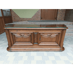 Дуже велика, деревяна, антикварна тумба- комод під телевізор в класичному стилі. Тумба виготовлена з натурального дерева, темний дуб, масив, ручна робота. Тумба має дві дверки, в середині є деревяна полиця. Стільниця тумби покрита склом з фацетом*, що захищає від подряпин, вологи та бруду. Тумба в дуже хорошому стані, зручна і практична в використанні, привезена з Бельгії.