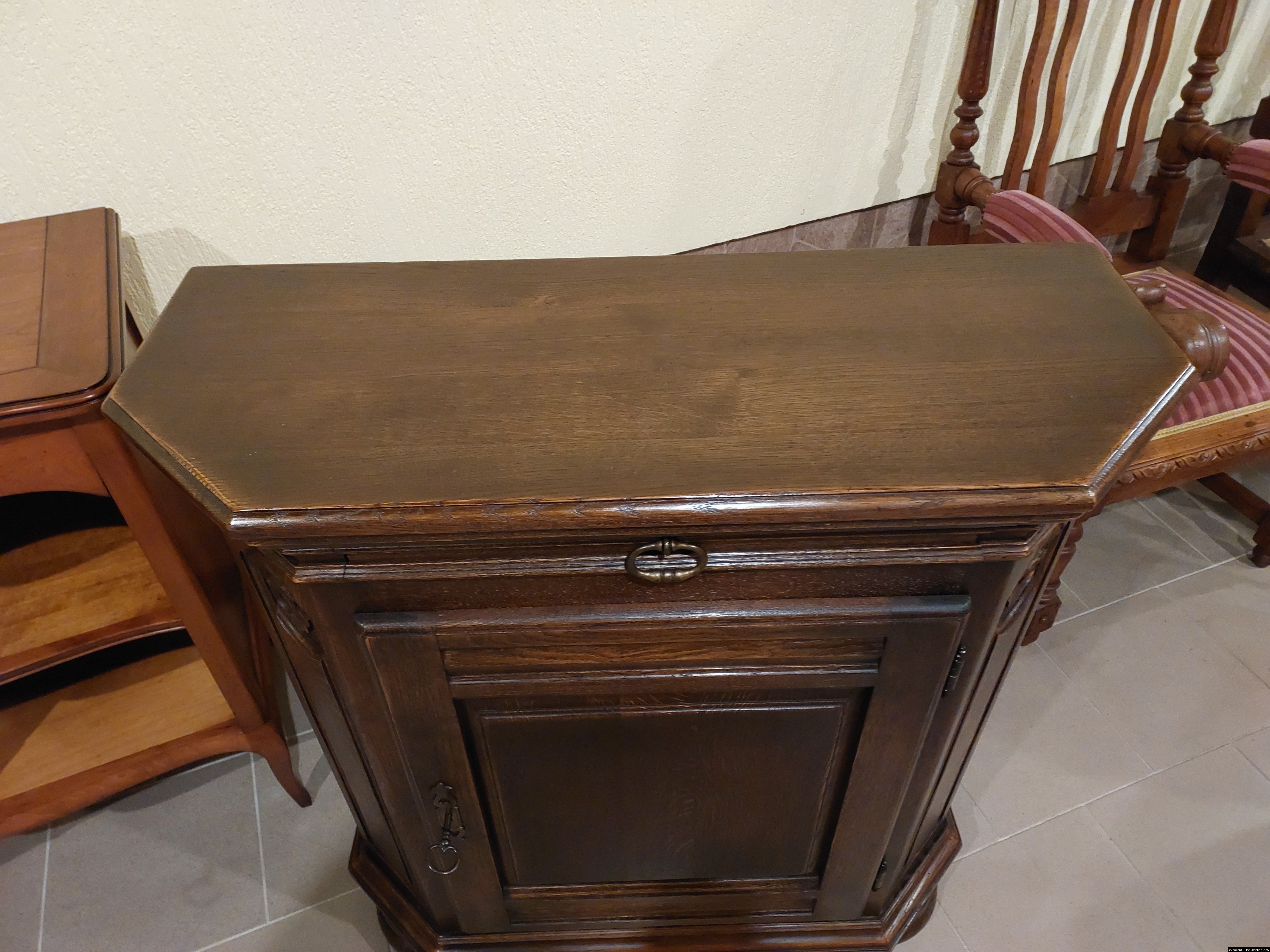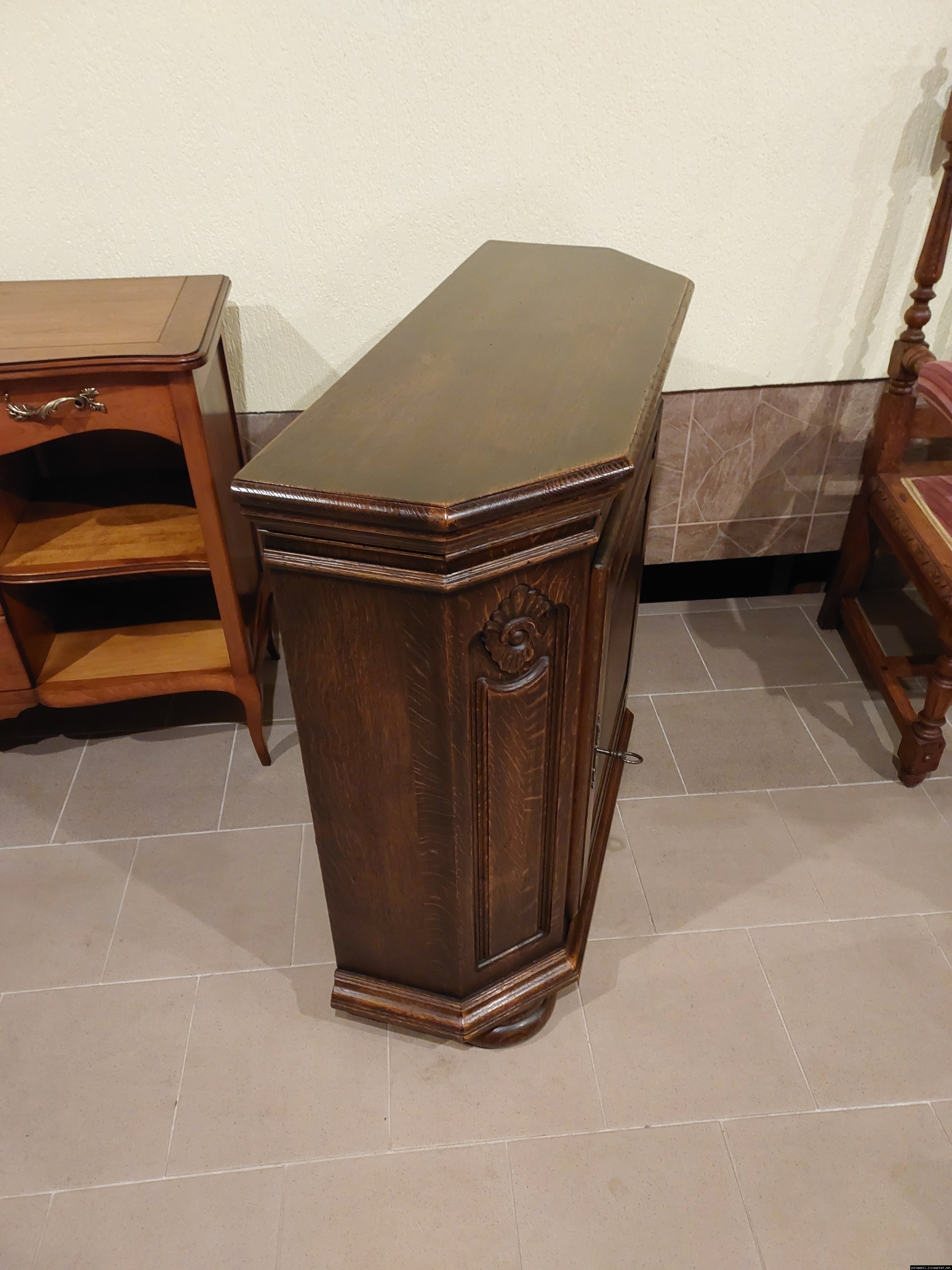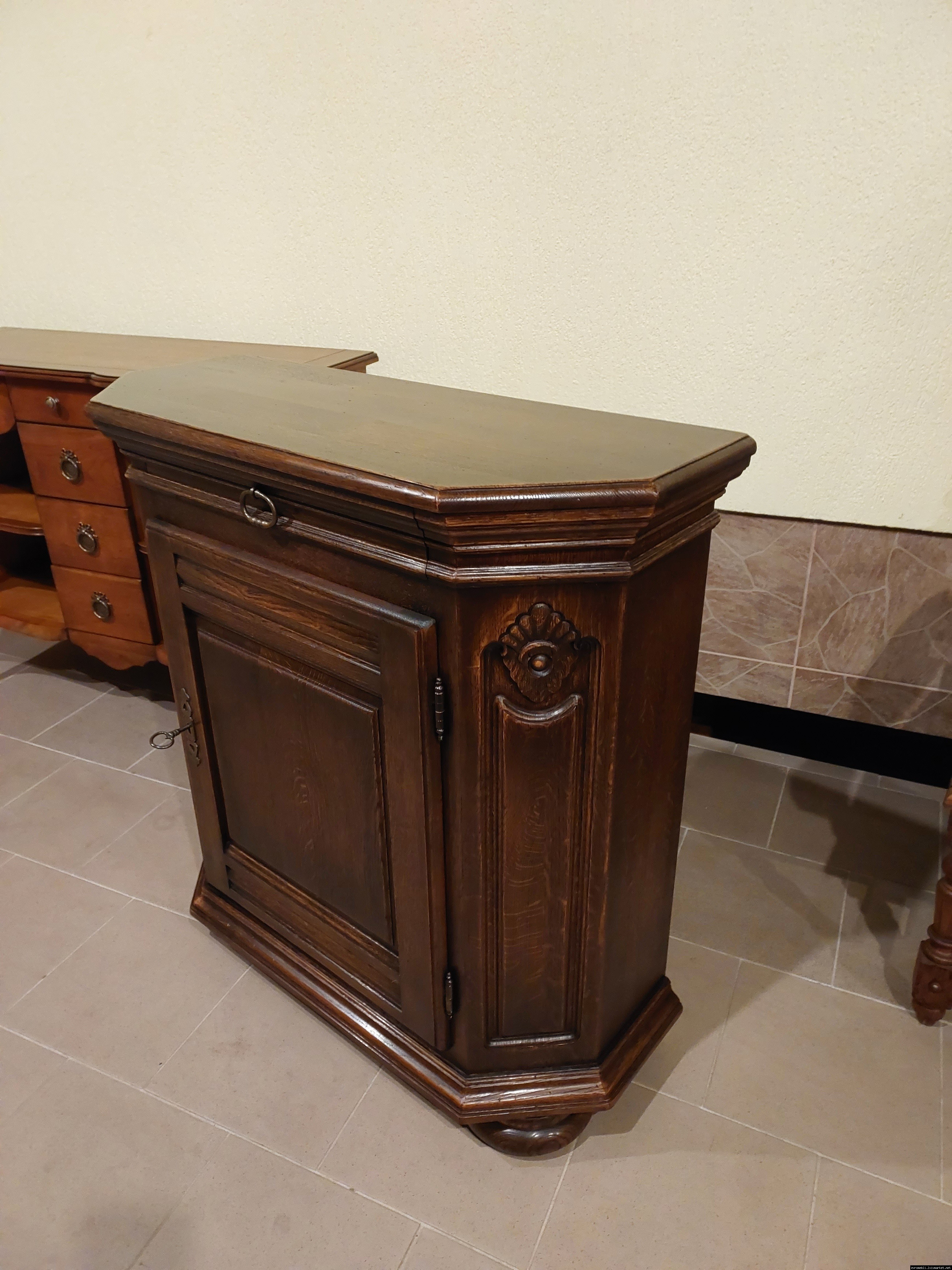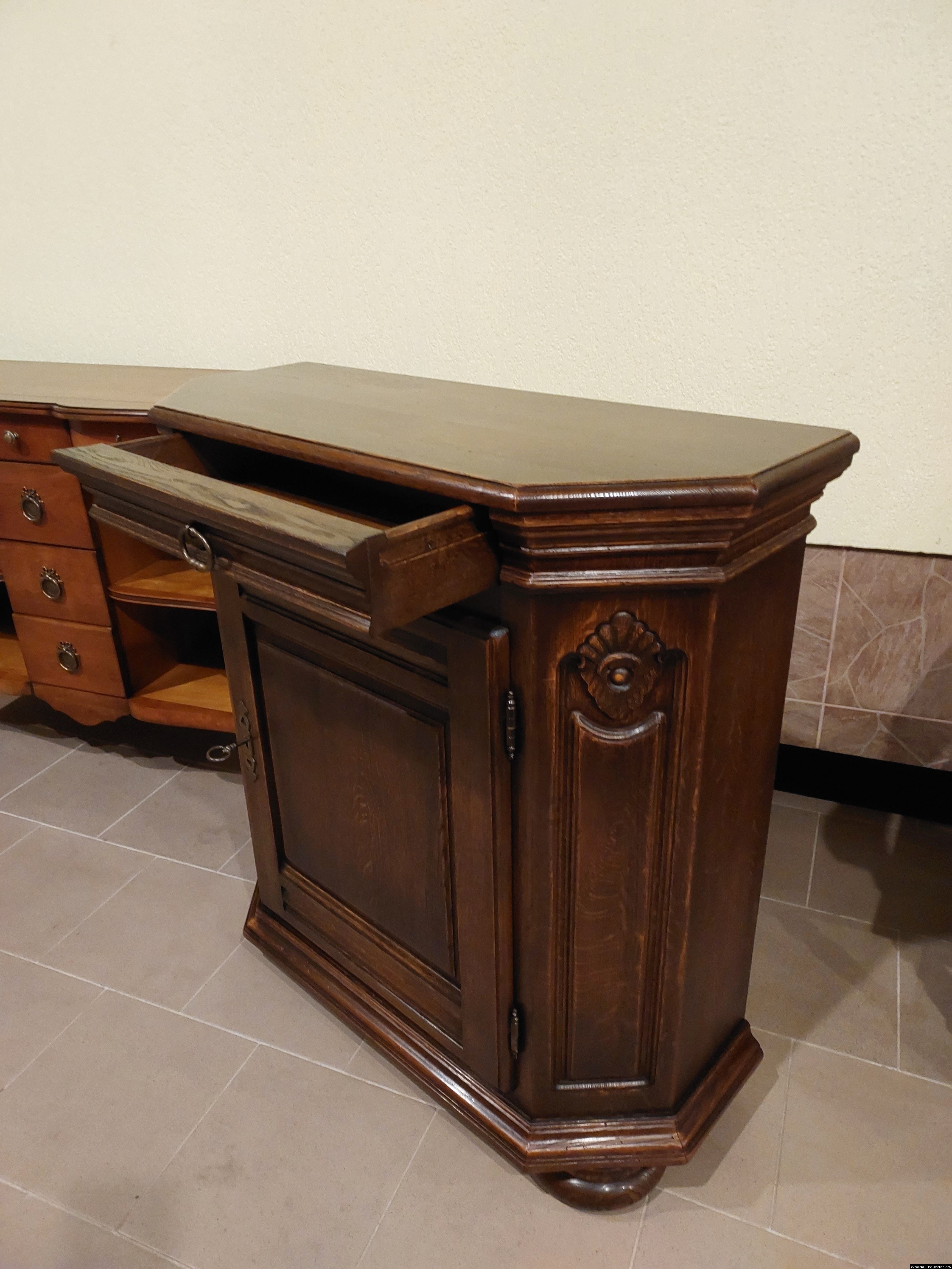 Красива, деревяна, класична тумбочка. Тумбочка виготовлена з натурального дерева, темно- золотистий дуб, масив, має одну дверку та одну шухляду, в середині є деревяна поличка. Тумбочка в хорошому стані, декорована елементами різьби, привезена з Бельгії.