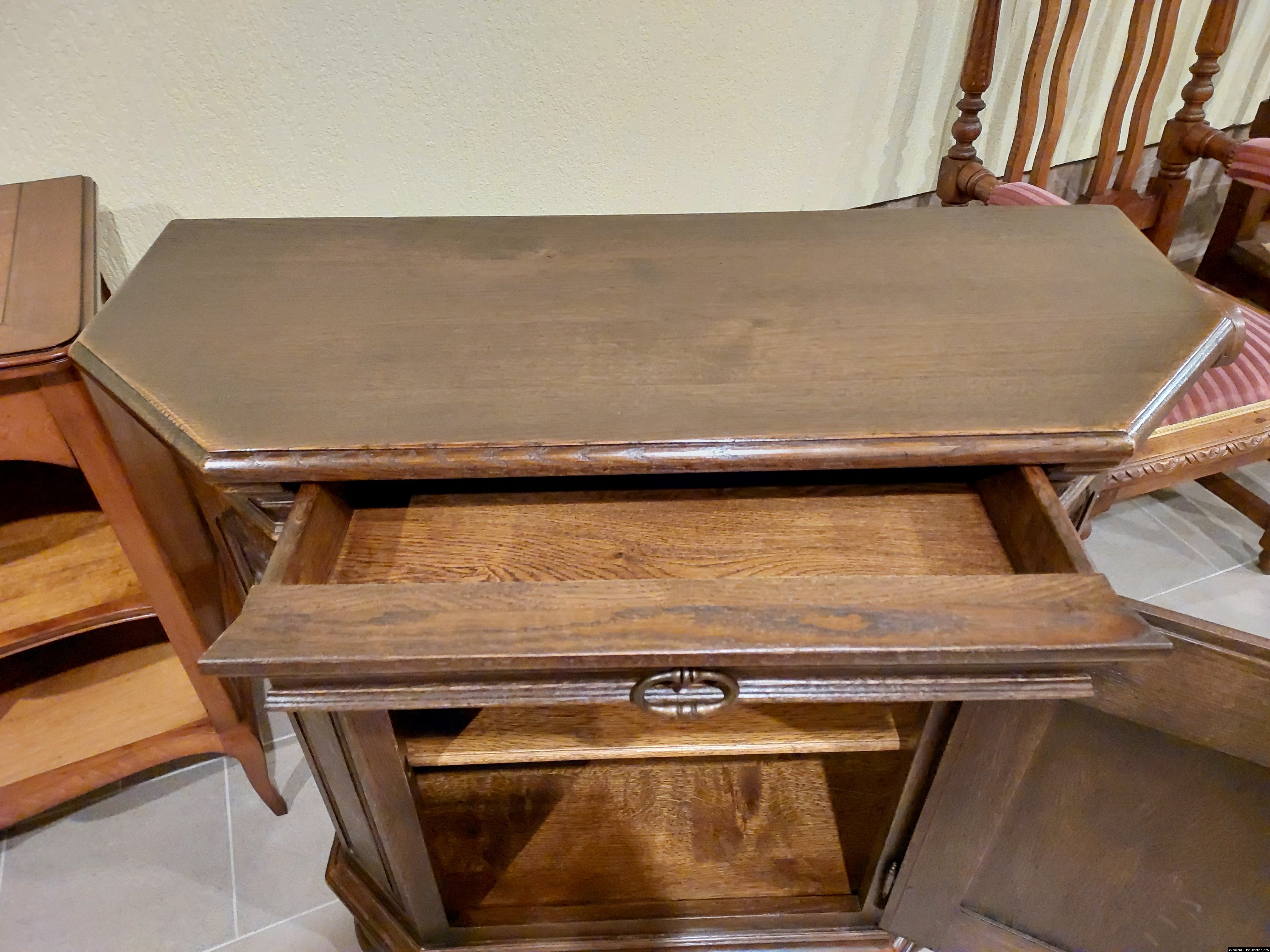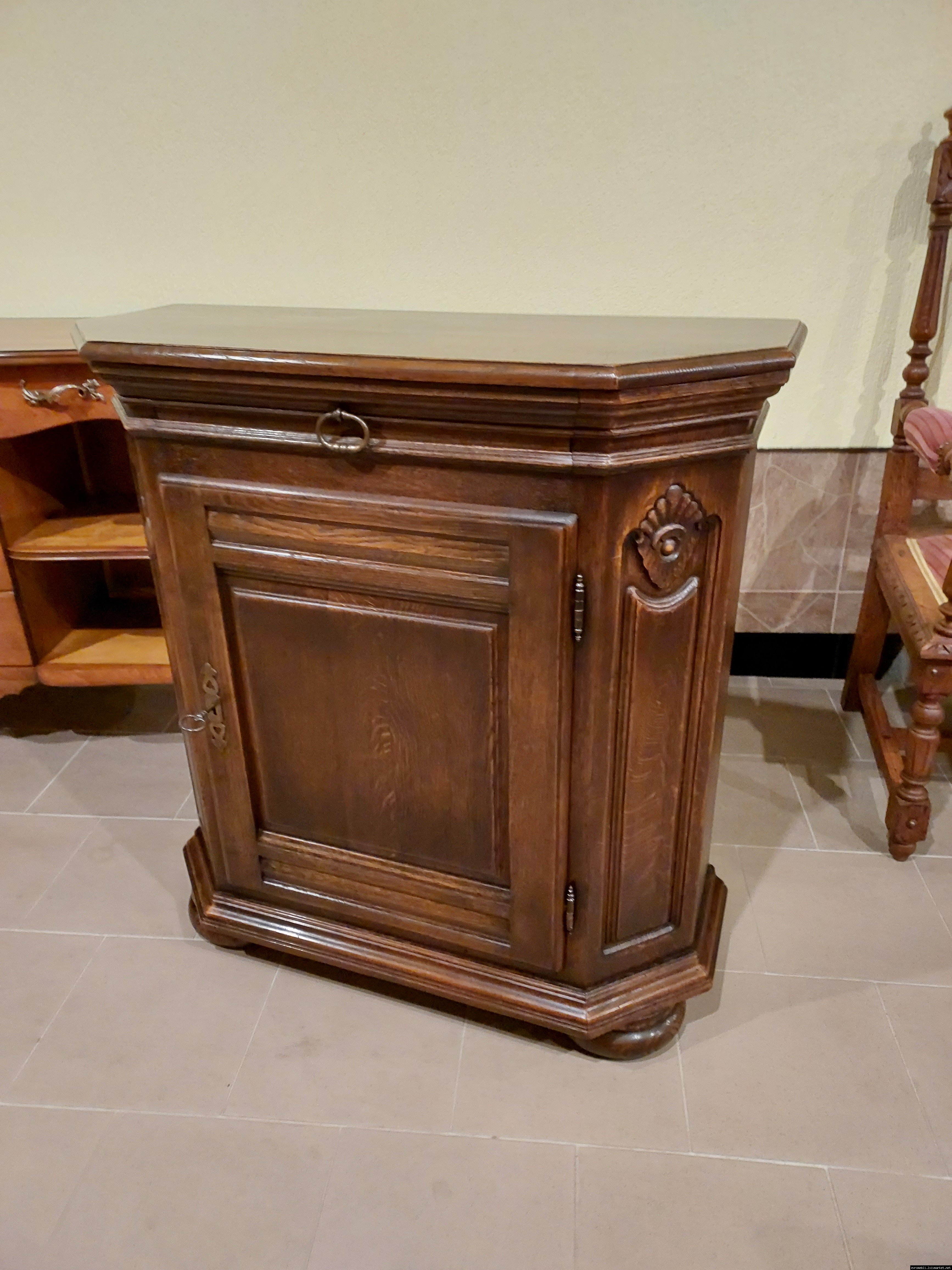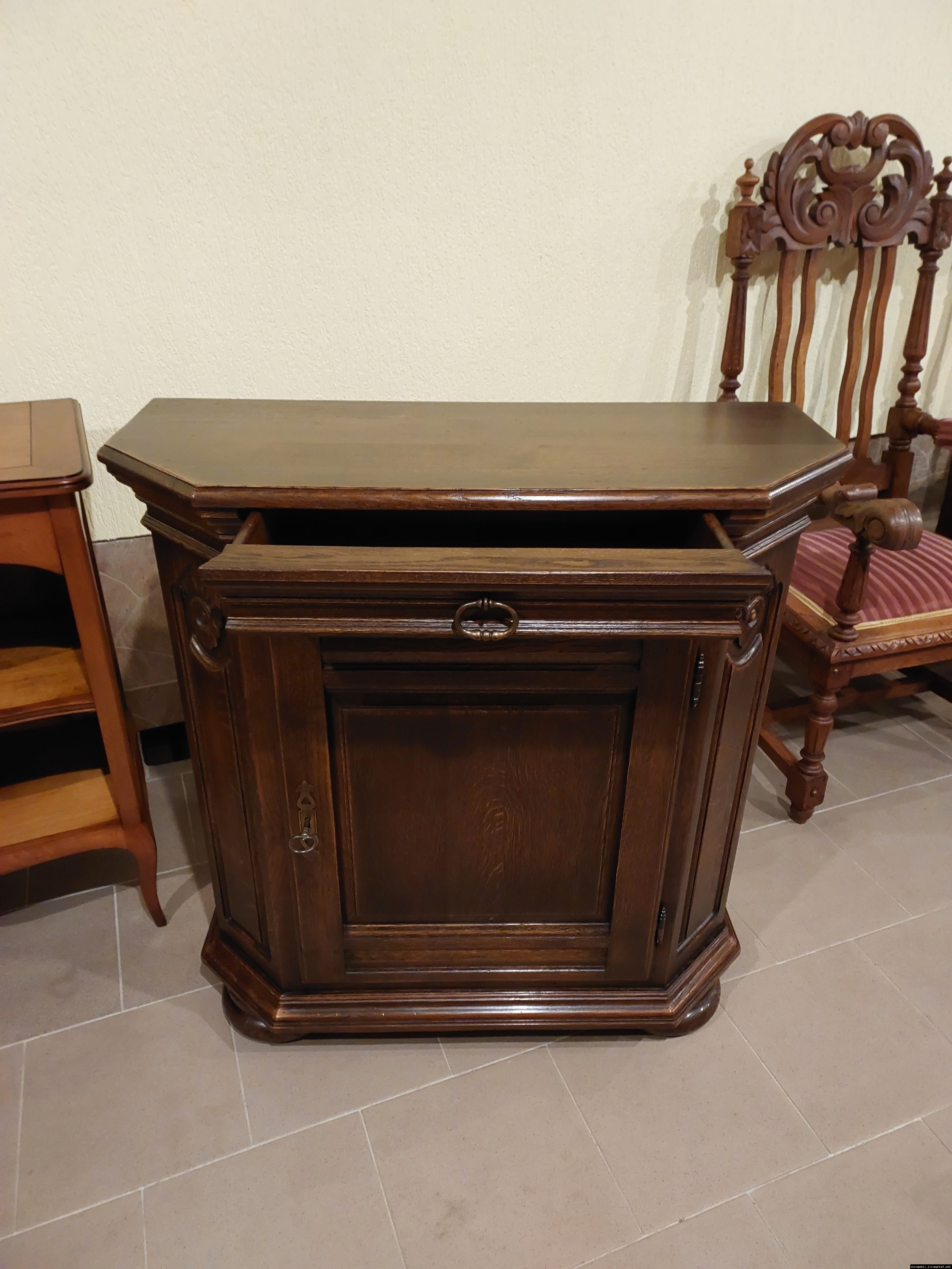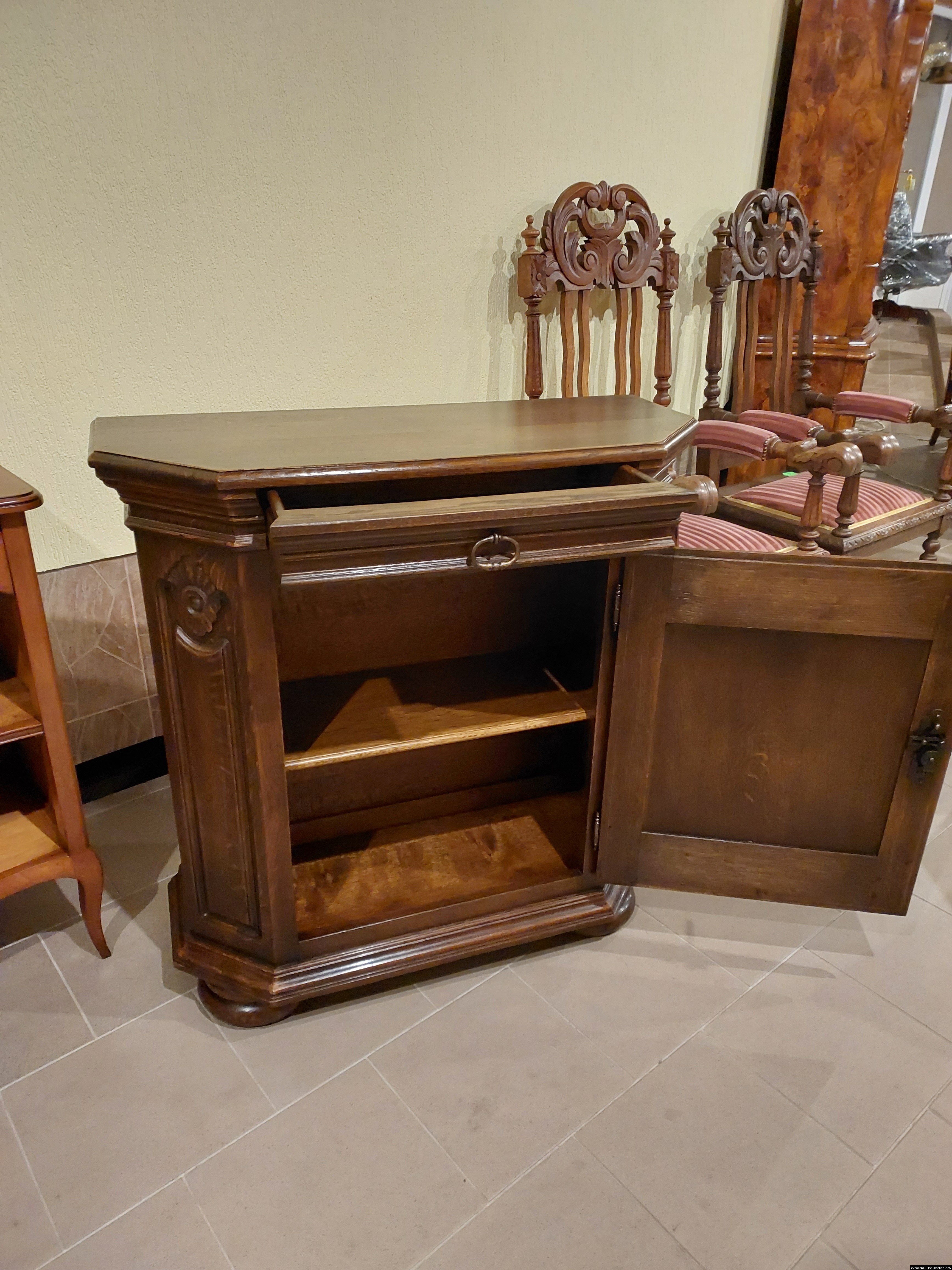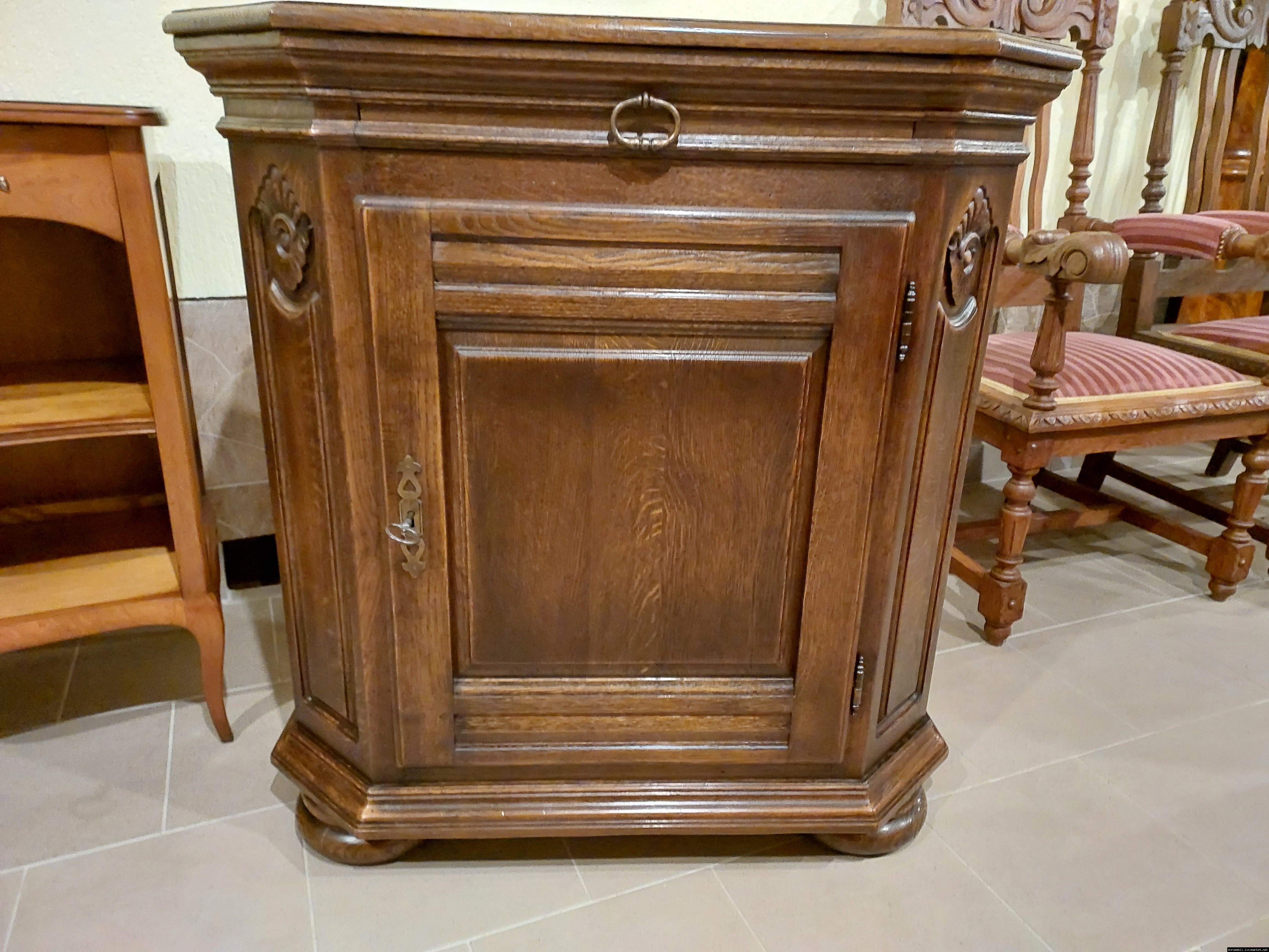Красива, деревяна, класична тумбочка. Тумбочка виготовлена з натурального дерева, темно- золотистий дуб, масив, має одну дверку та одну шухляду, в середині є деревяна поличка. Тумбочка в хорошому стані, декорована елементами різьби, привезена з Бельгії.
