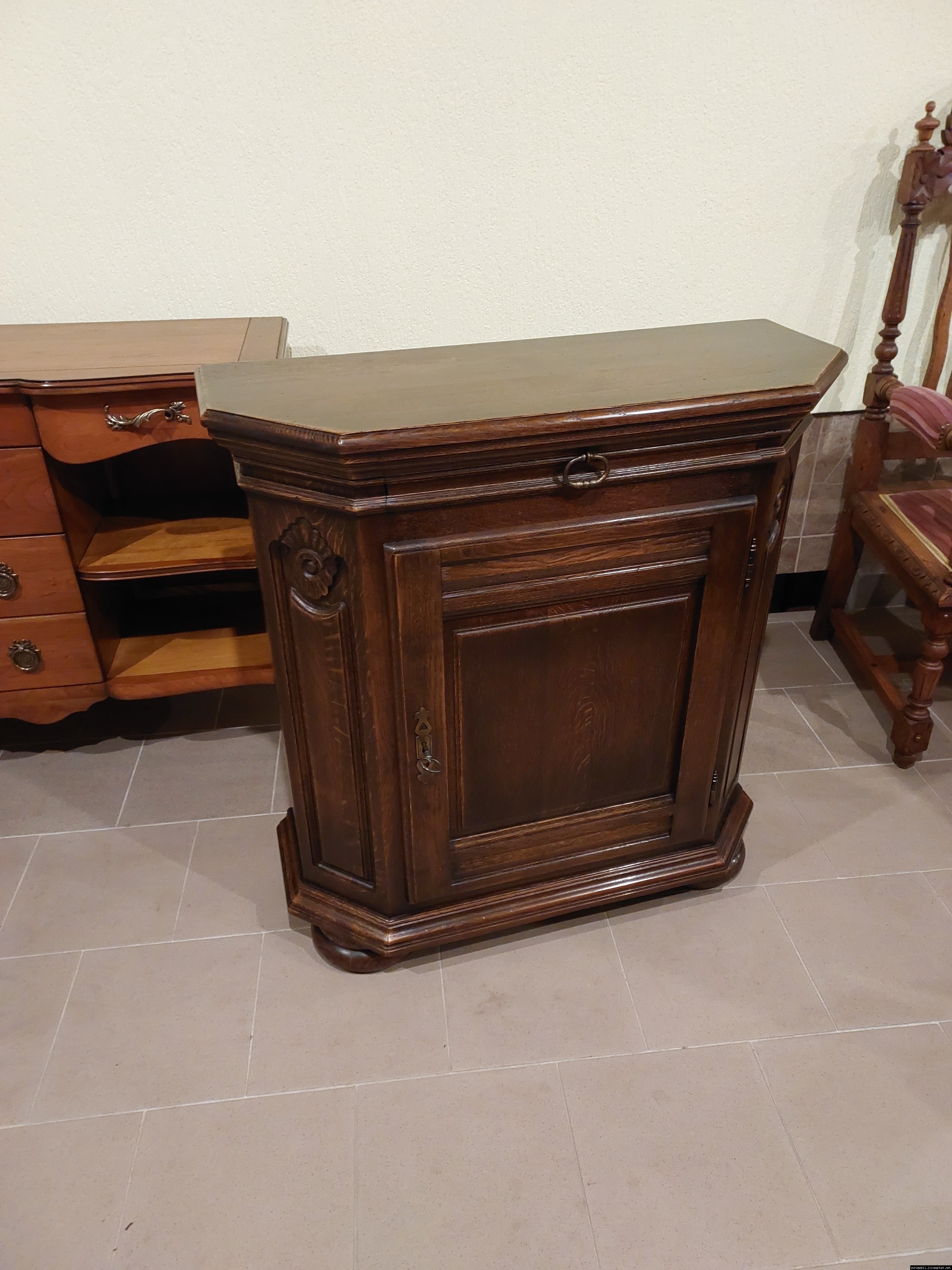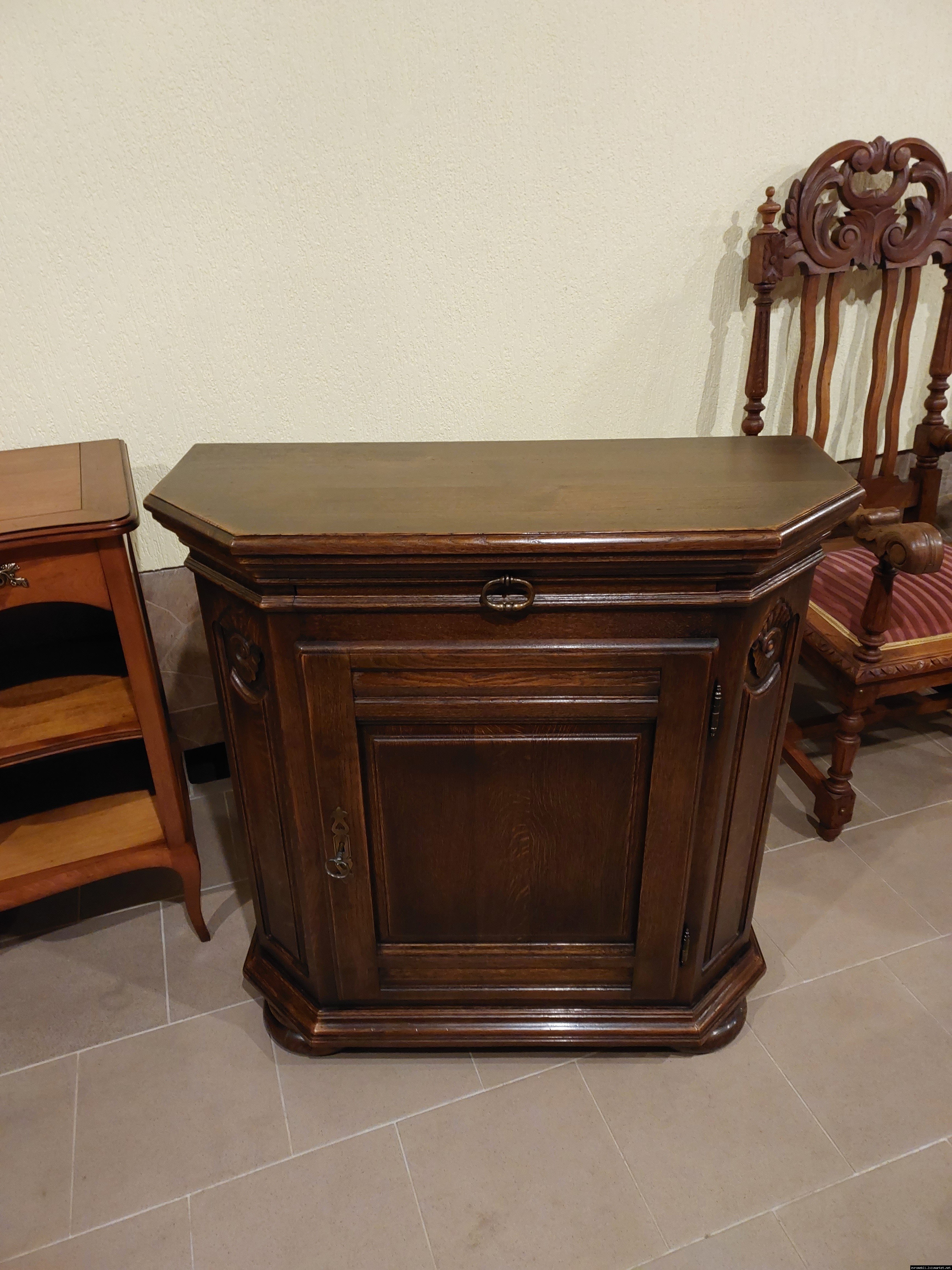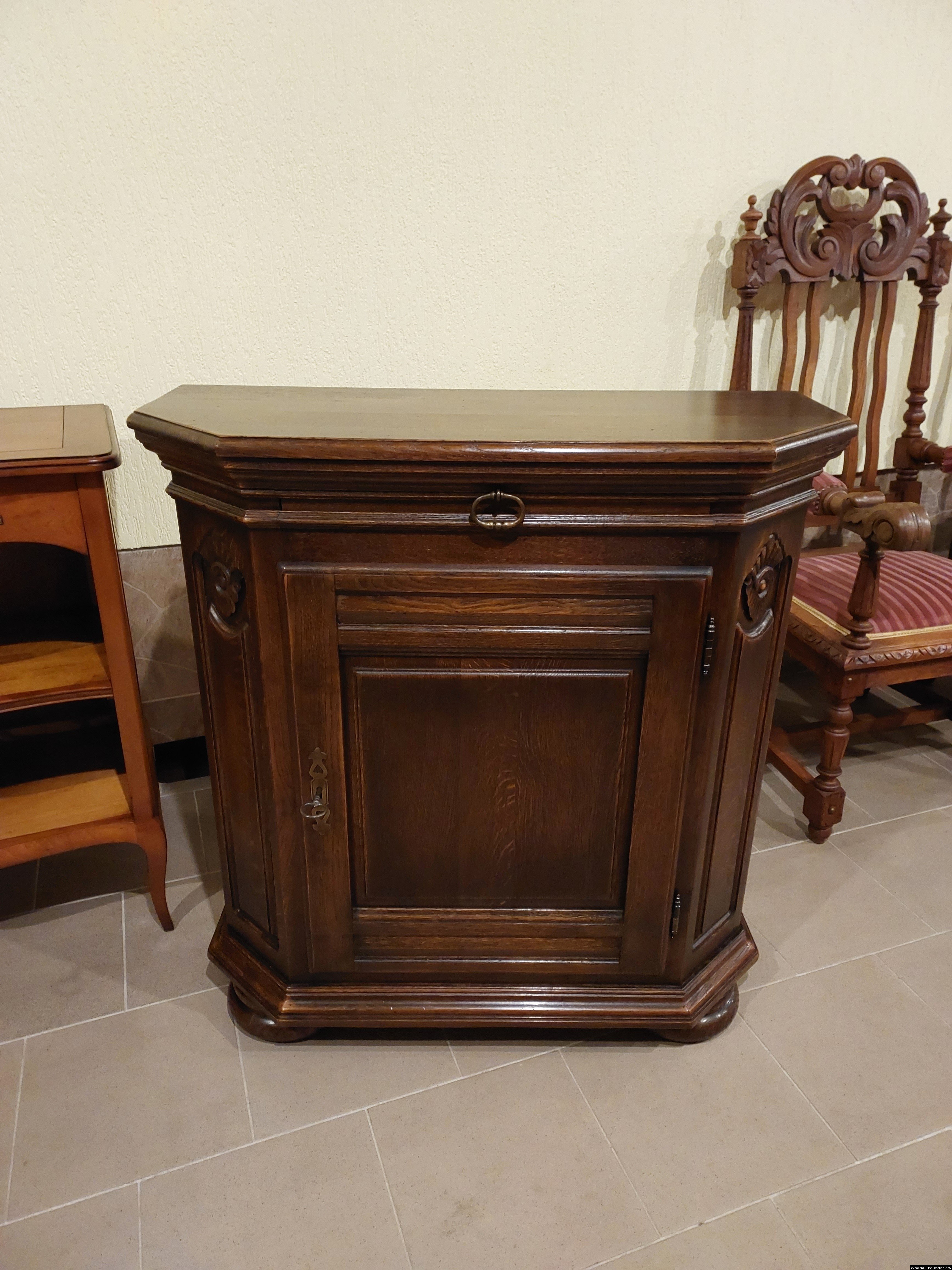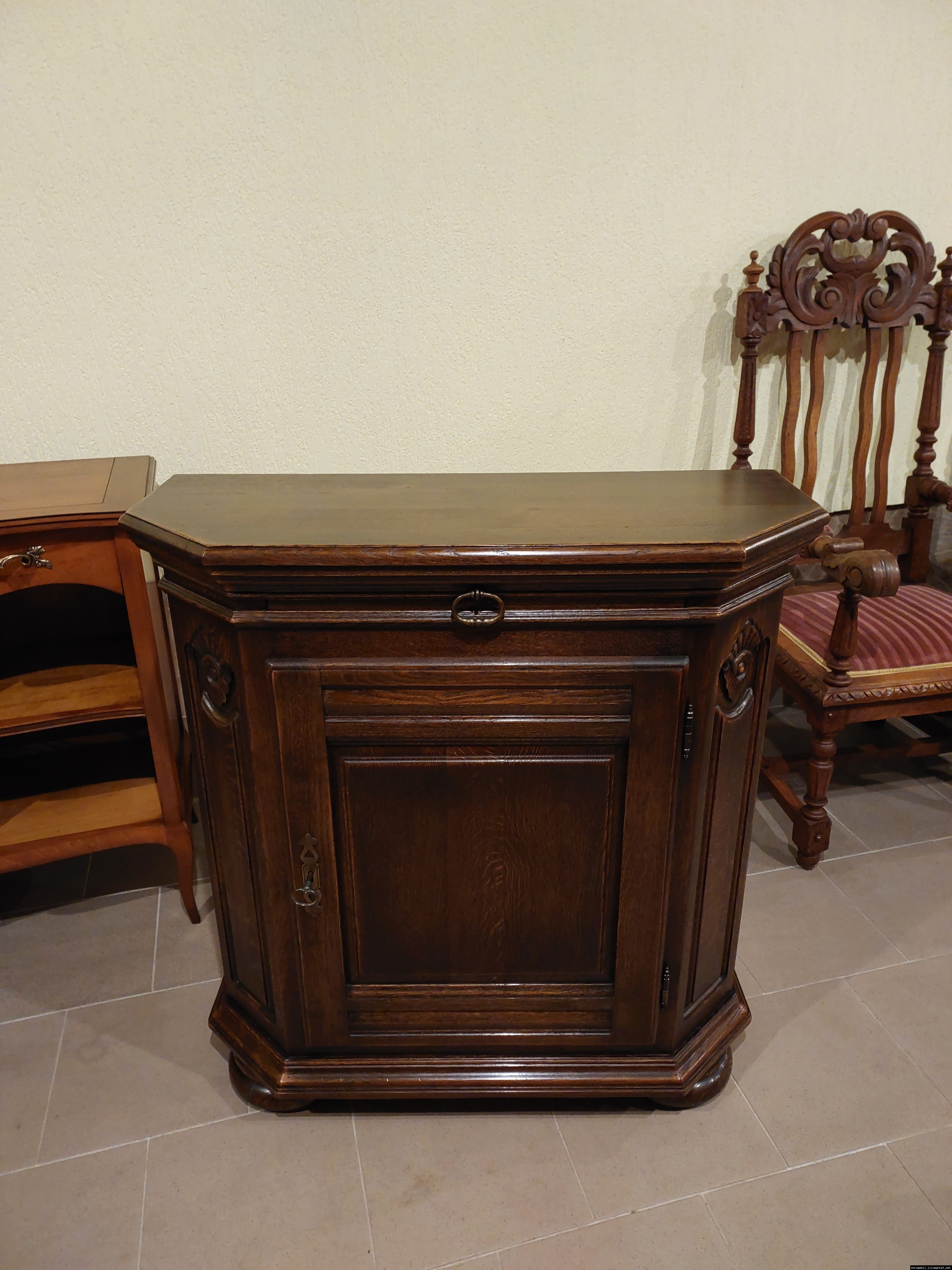 Красива, деревяна, класична тумбочка. Тумбочка виготовлена з натурального дерева, темно- золотистий дуб, масив, має одну дверку та одну шухляду, в середині є деревяна поличка. Тумбочка в хорошому стані, декорована елементами різьби, привезена з Бельгії.
