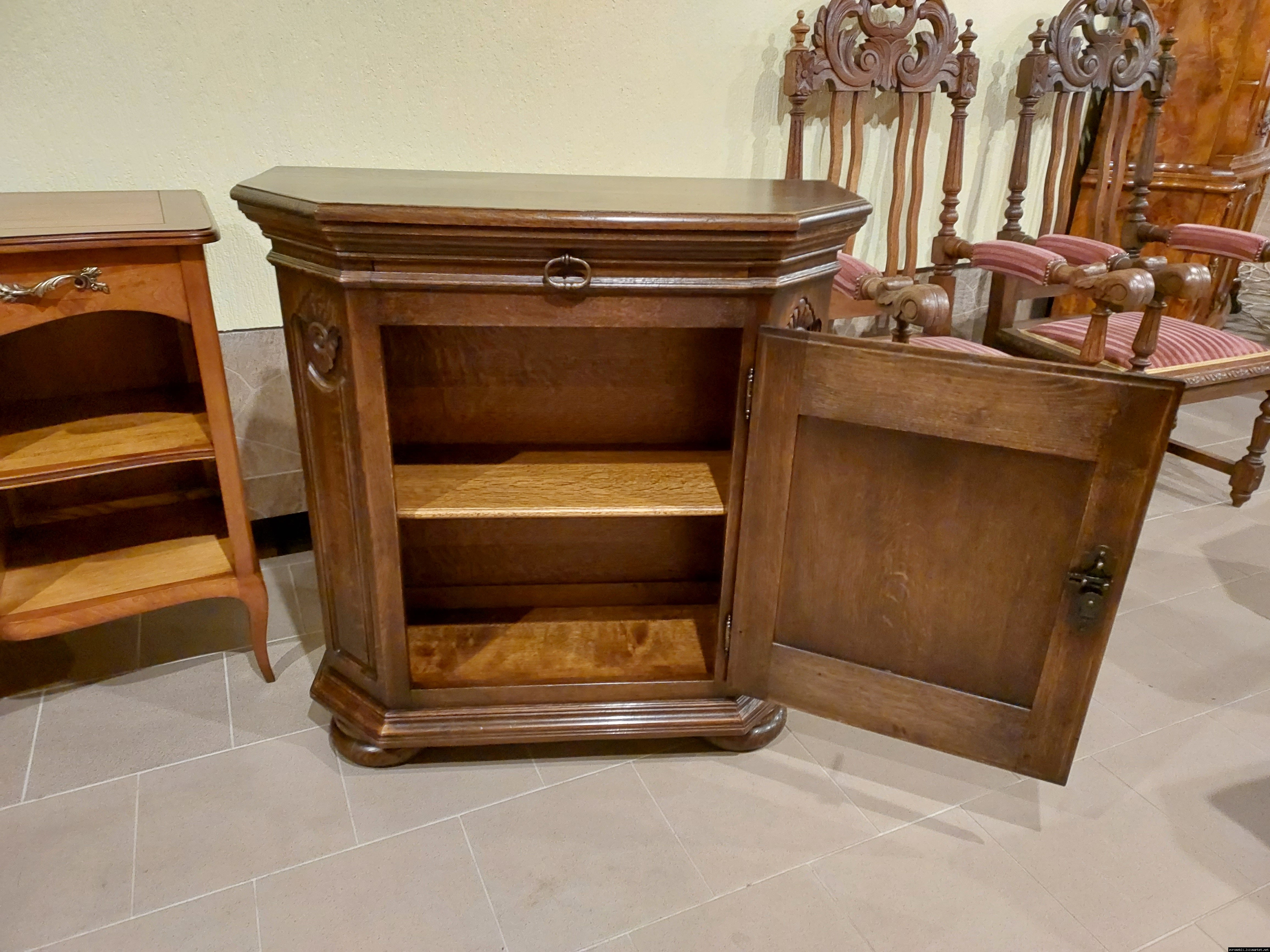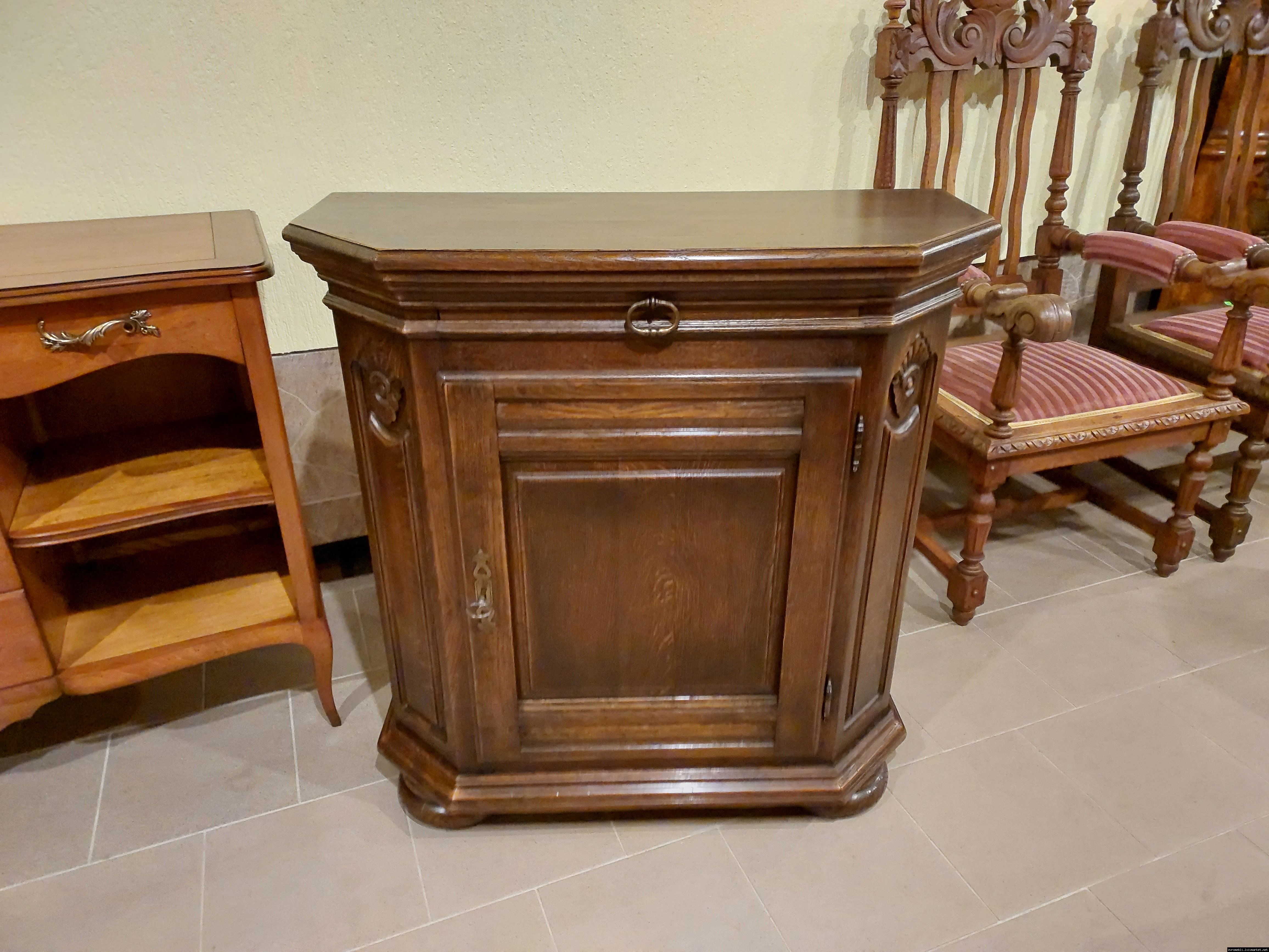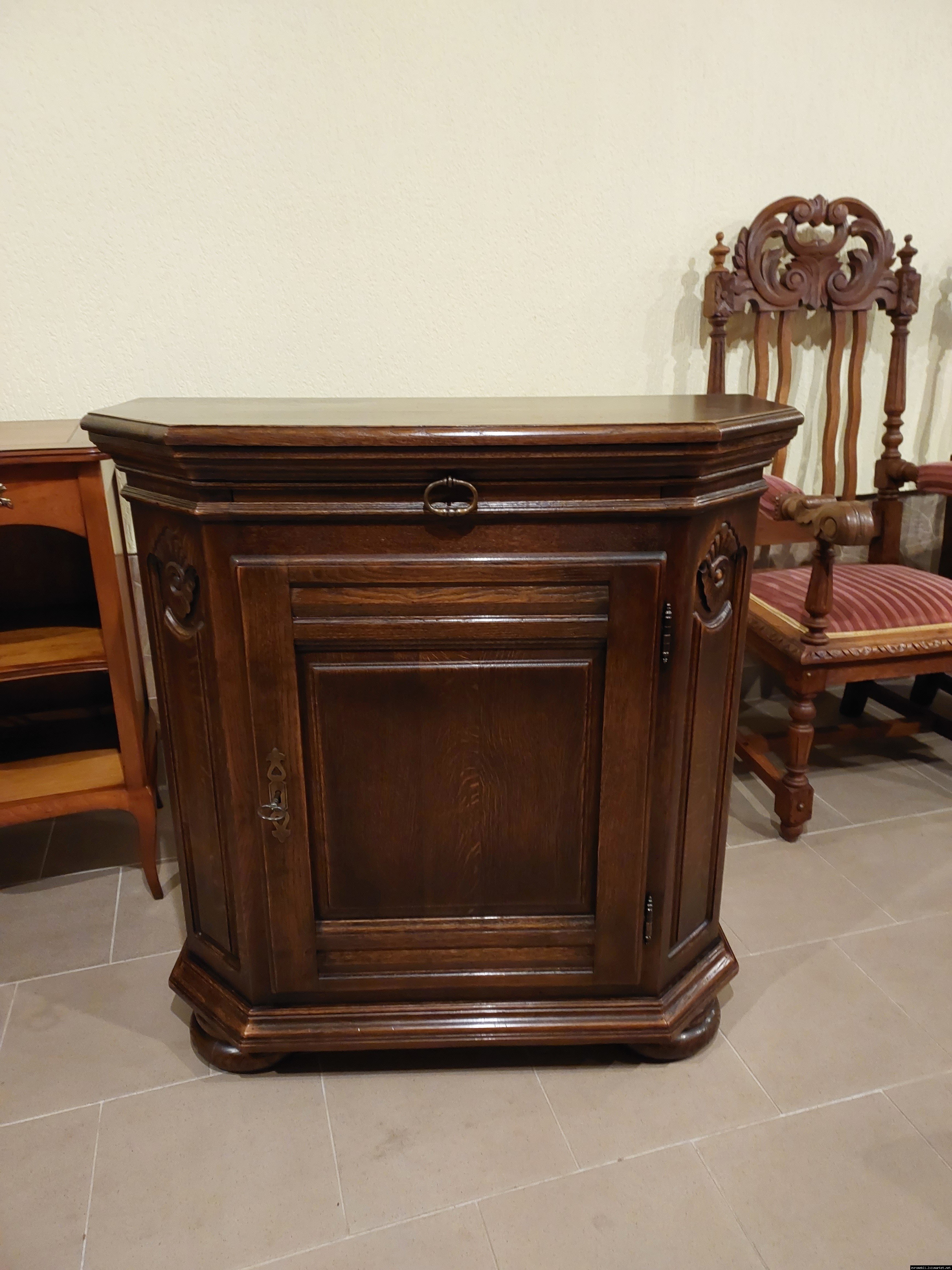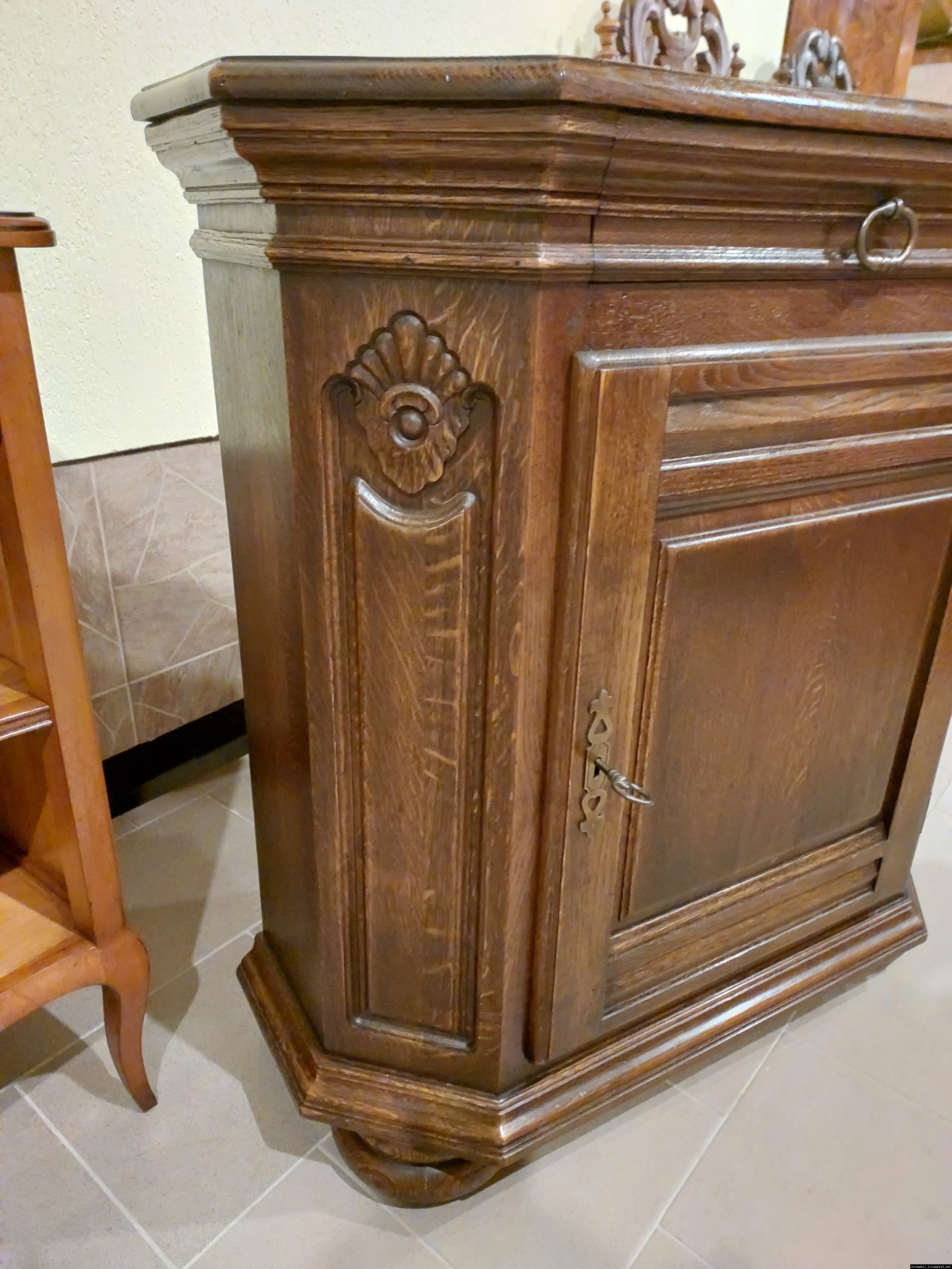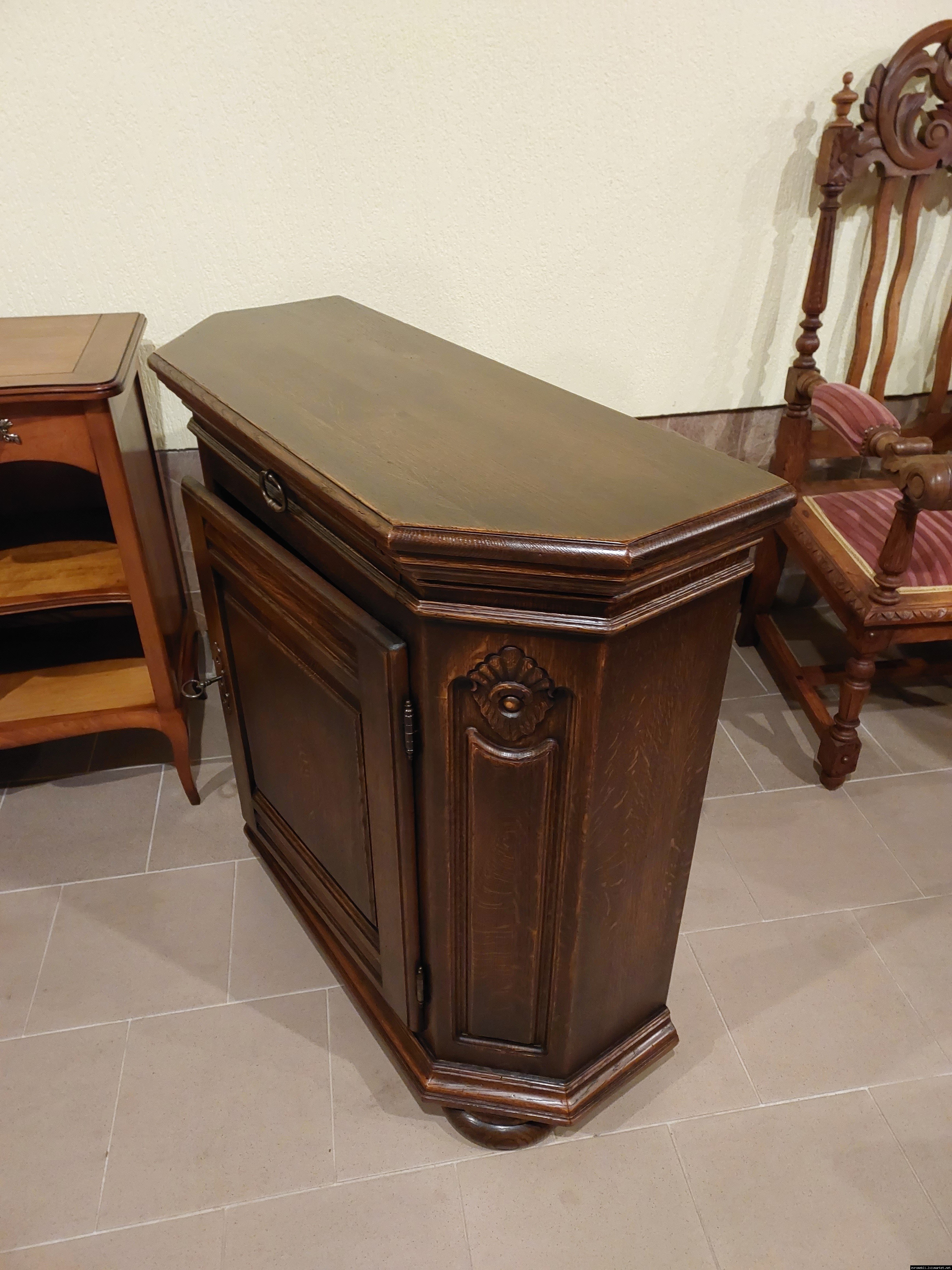 Красива, деревяна, класична тумбочка. Тумбочка виготовлена з натурального дерева, темно- золотистий дуб, масив, має одну дверку та одну шухляду, в середині є деревяна поличка. Тумбочка в хорошому стані, декорована елементами різьби, привезена з Бельгії.