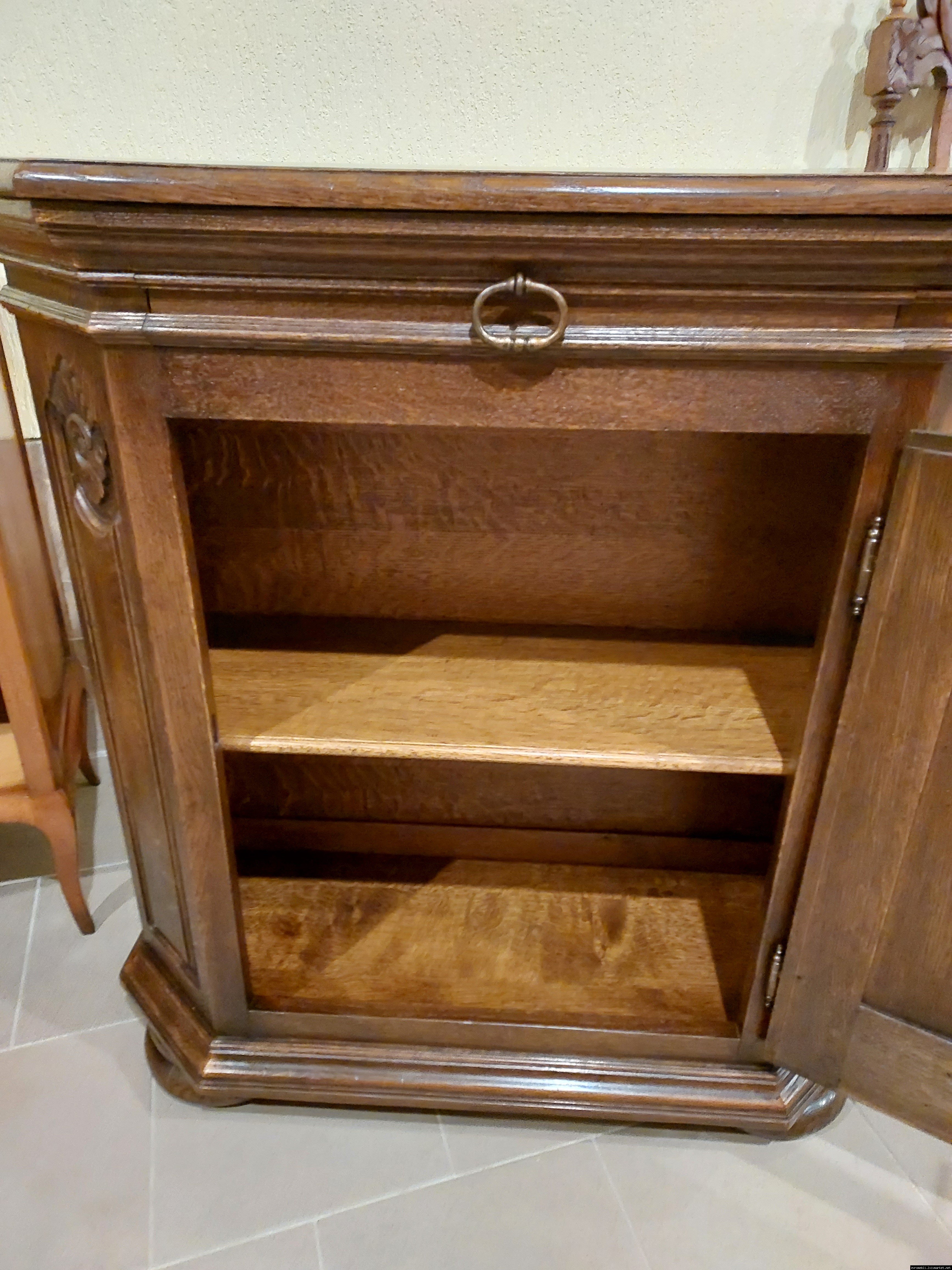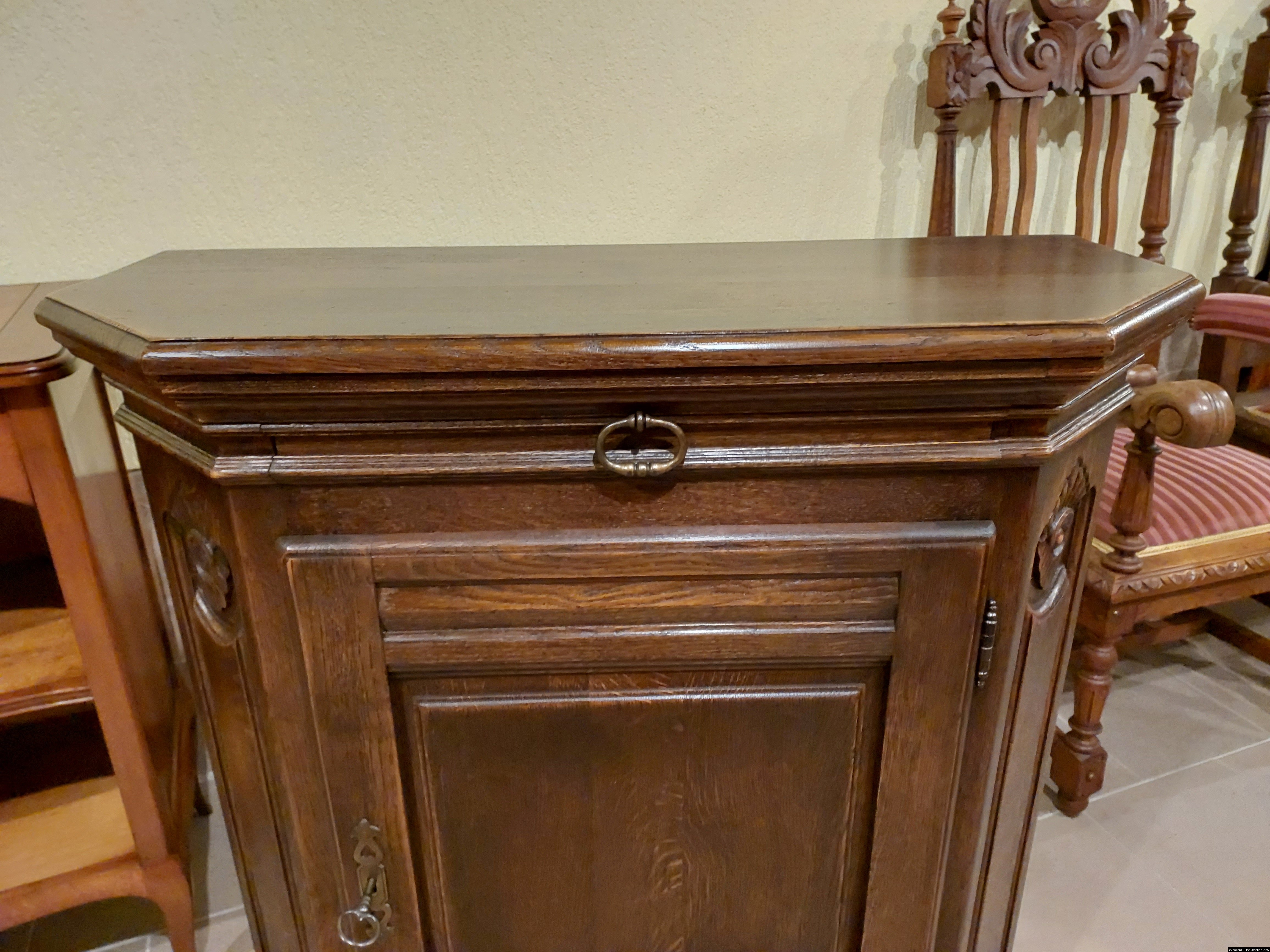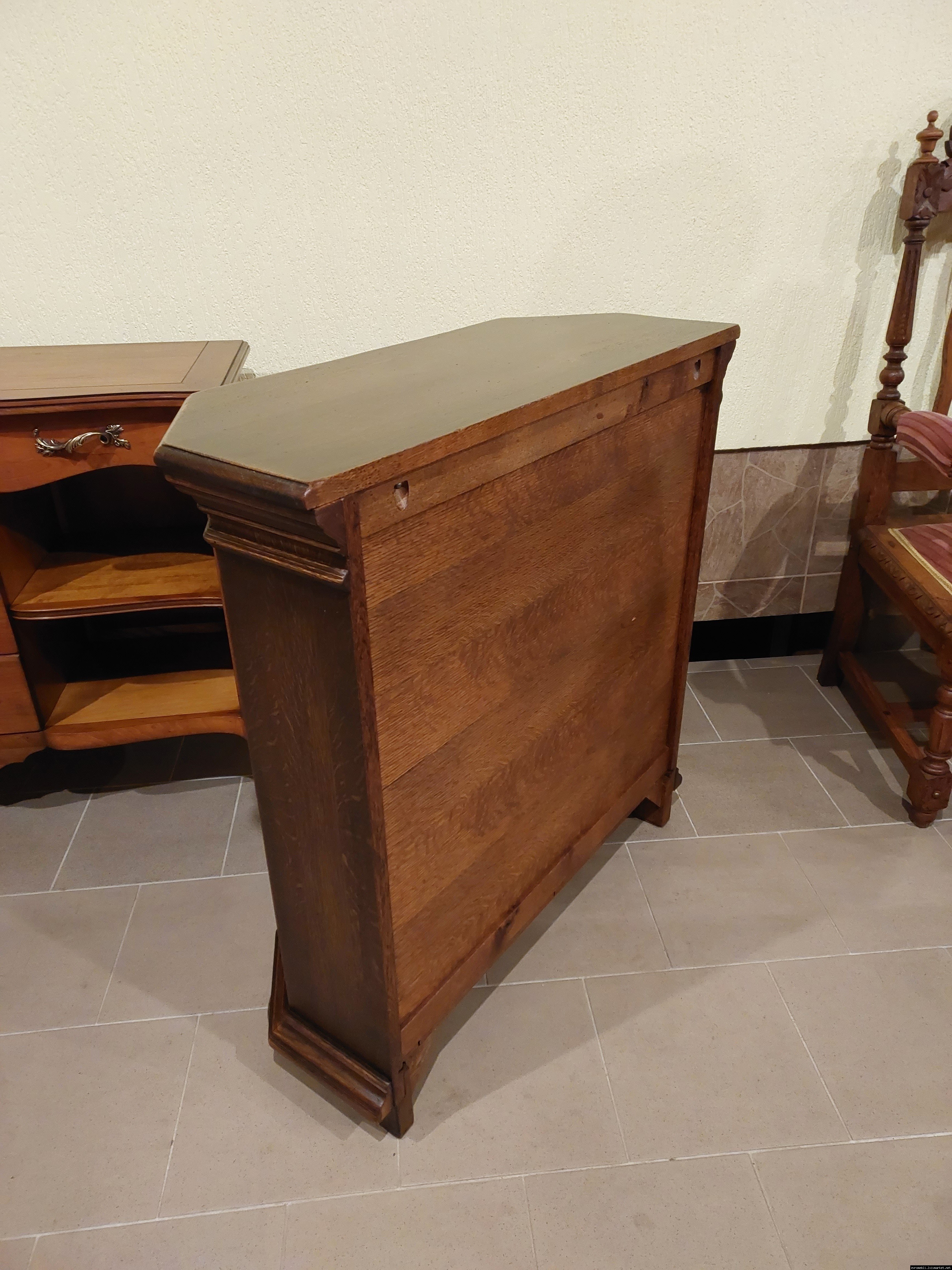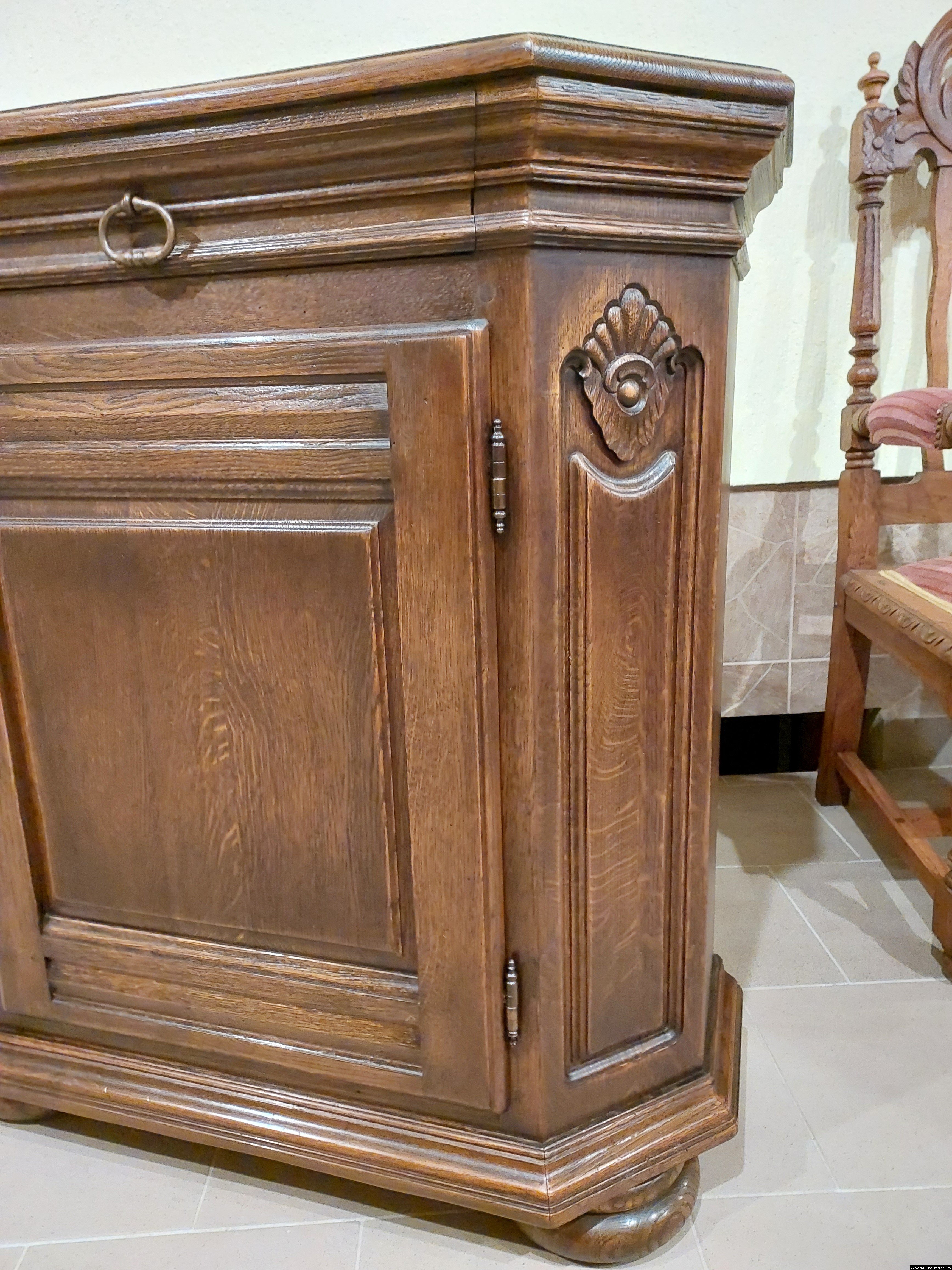 Красива, деревяна, класична тумбочка. Тумбочка виготовлена з натурального дерева, темно- золотистий дуб, масив, має одну дверку та одну шухляду, в середині є деревяна поличка. Тумбочка в хорошому стані, декорована елементами різьби, привезена з Бельгії.