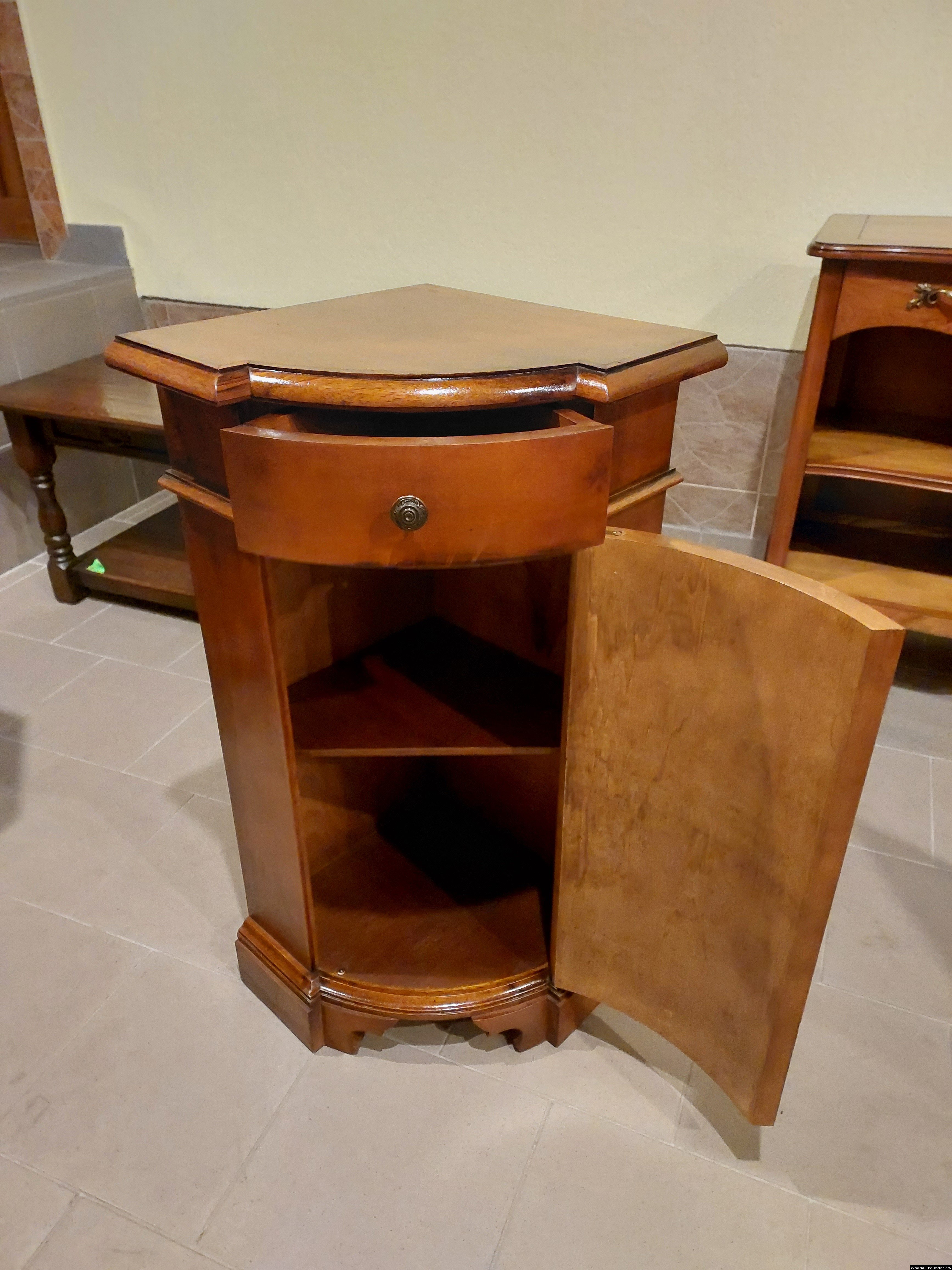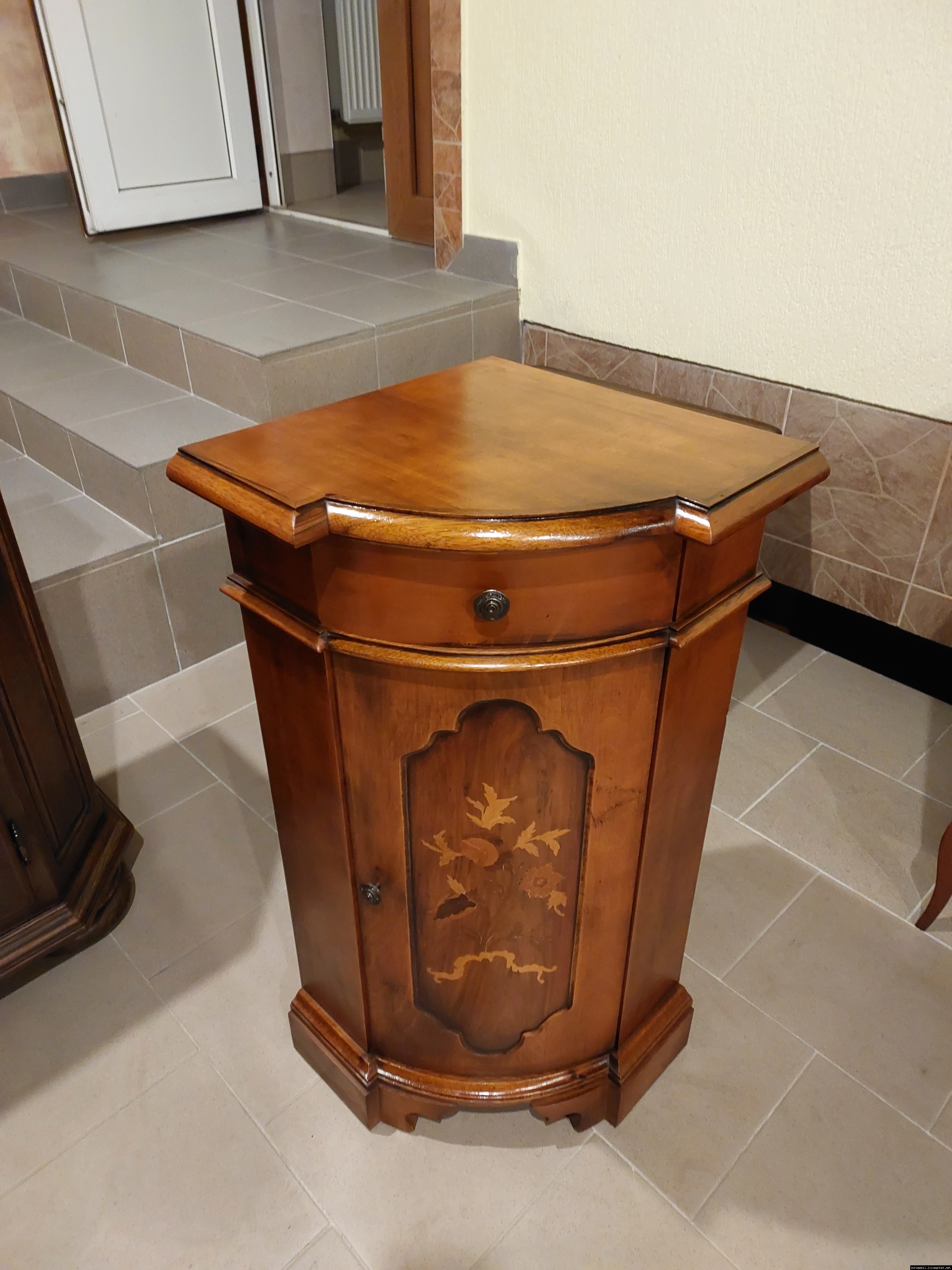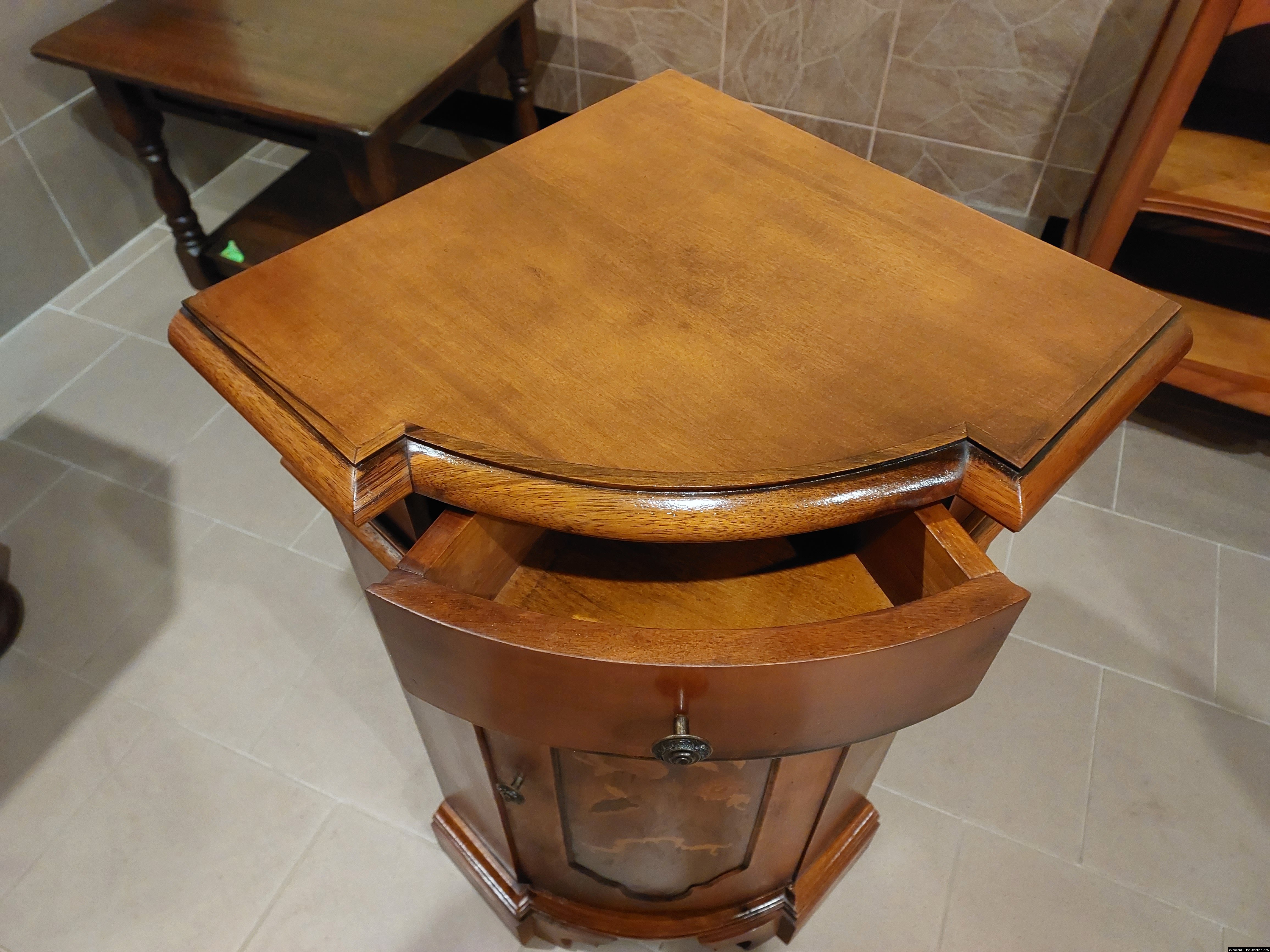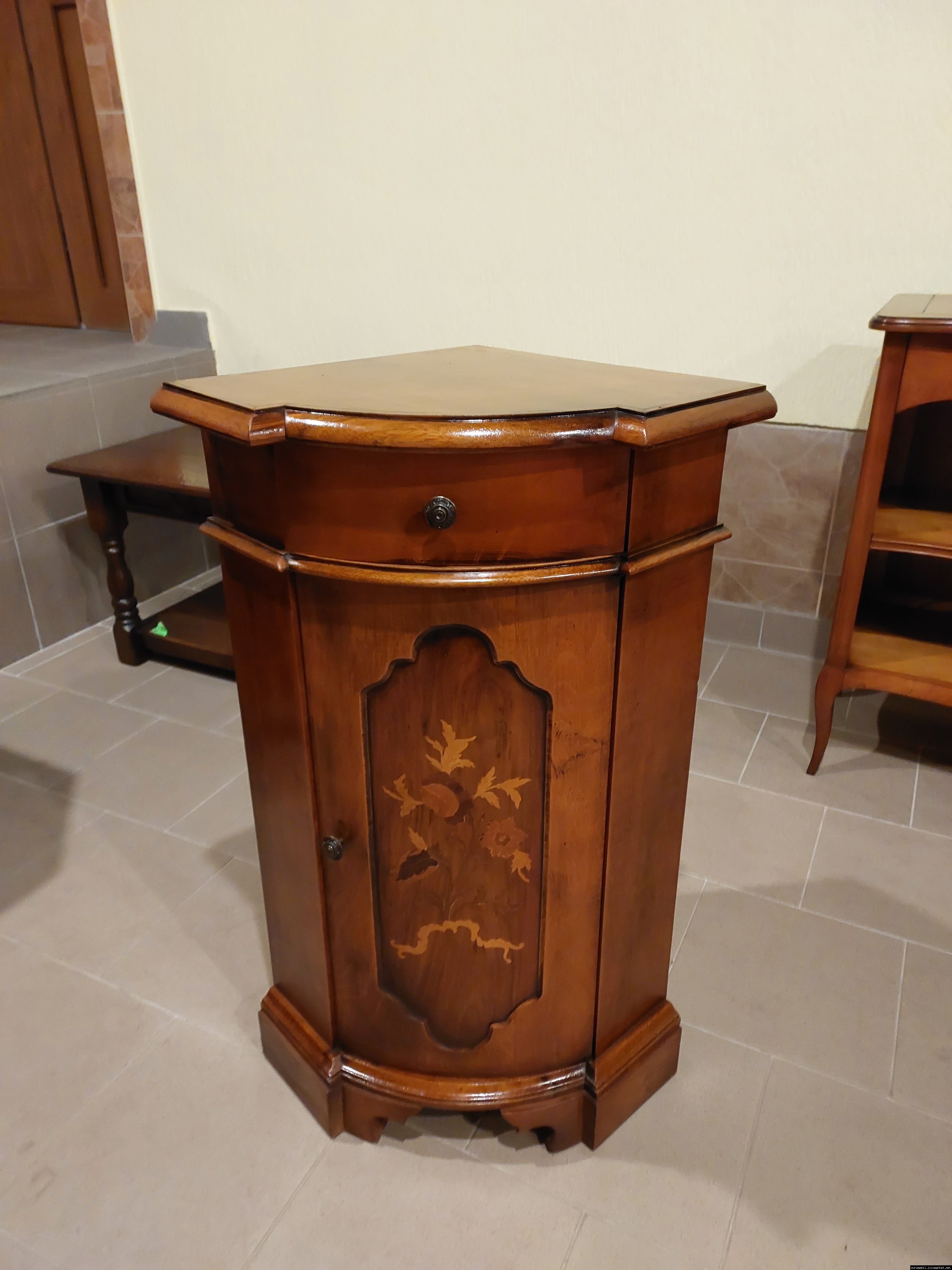 Красива, деревяна, кутова тумбочка в стилі Людовіка XVI. Італія. Тумбочка виготовлена з масиву натурального дерева, горіх, має одну дверку та одну шухляду, всередині є деревяна полиця. Тумбочка з латунними ручками, декорована інкрустацією, в хорошому стані, привезена з Бельгії.