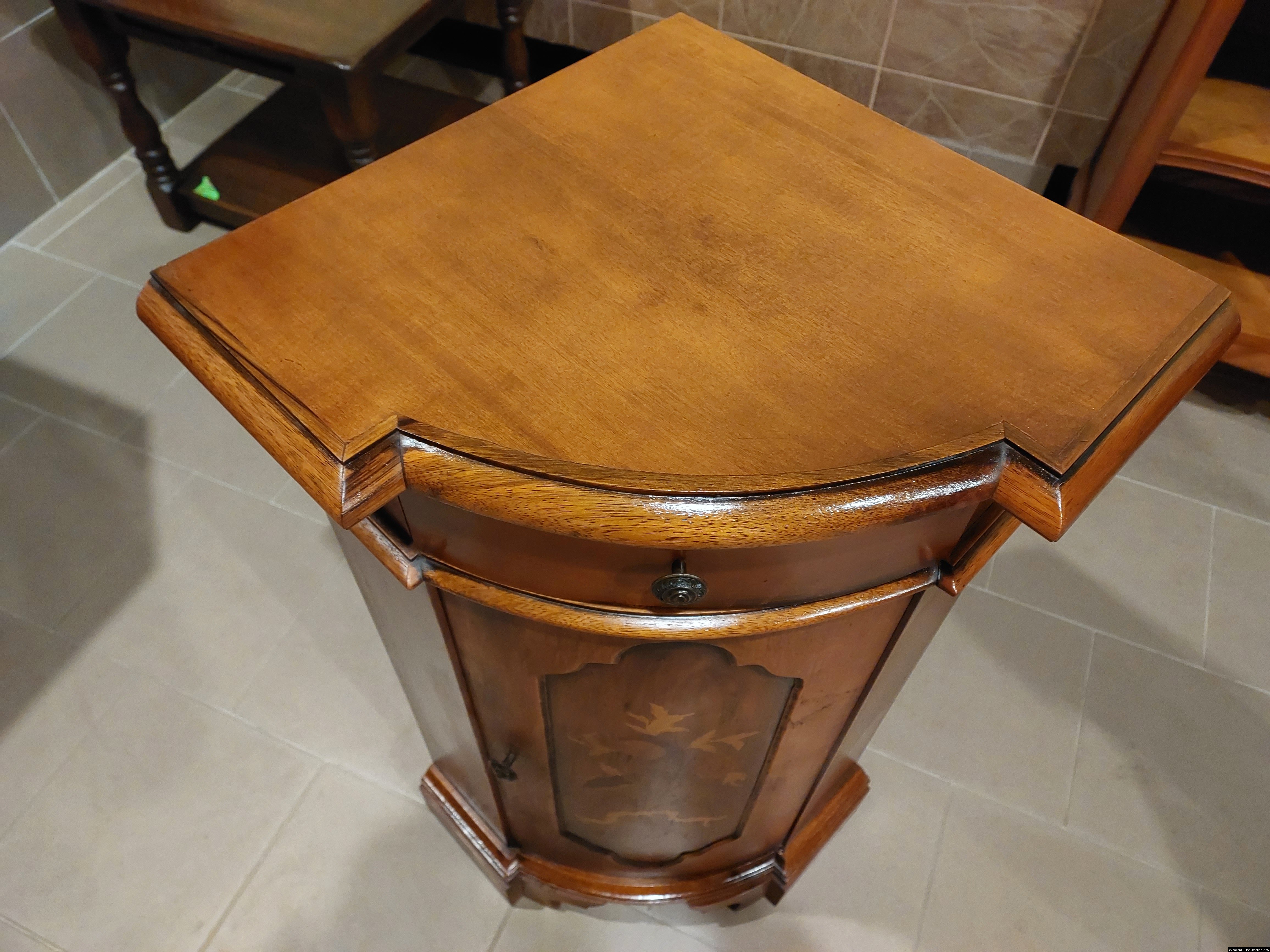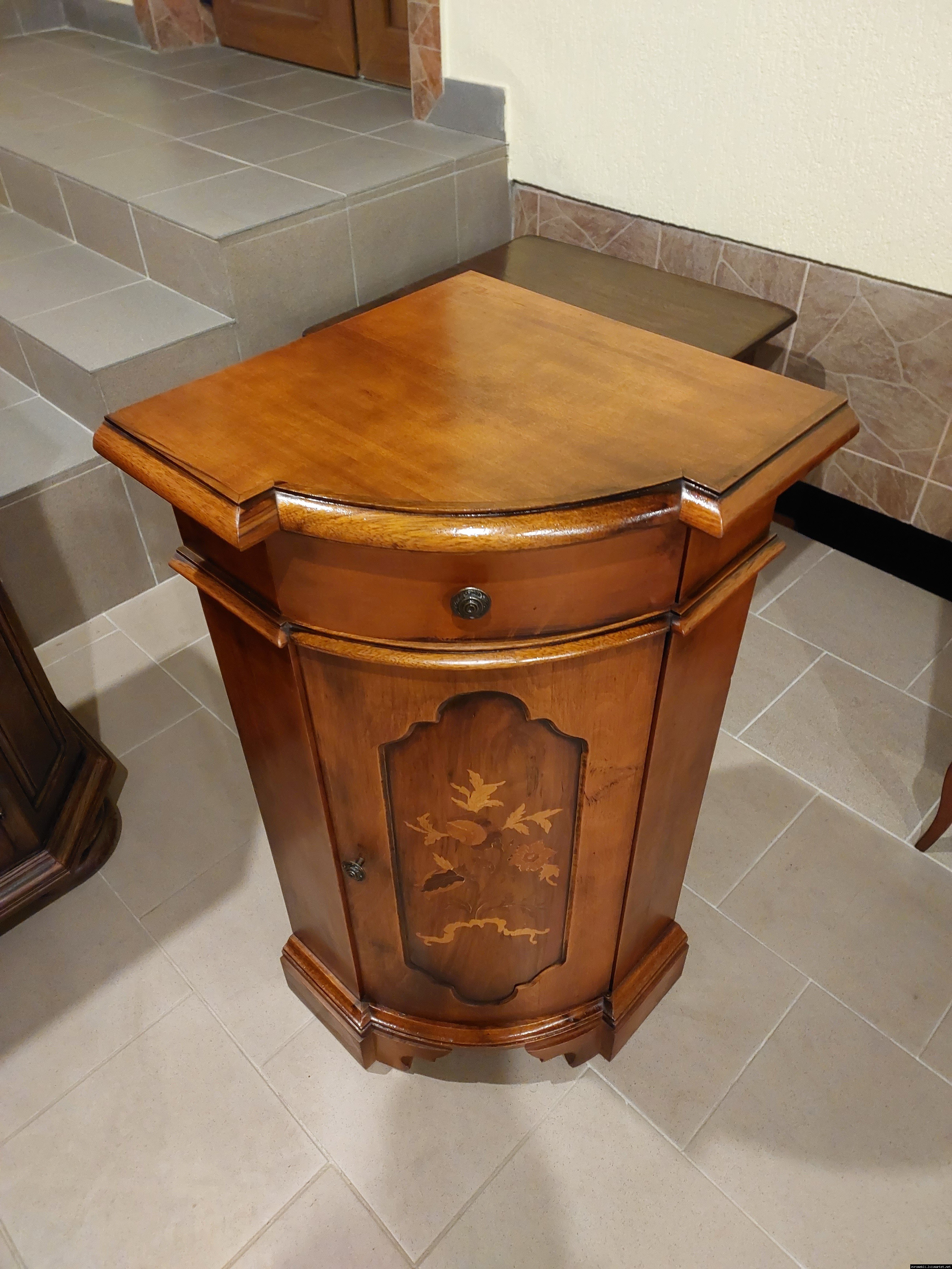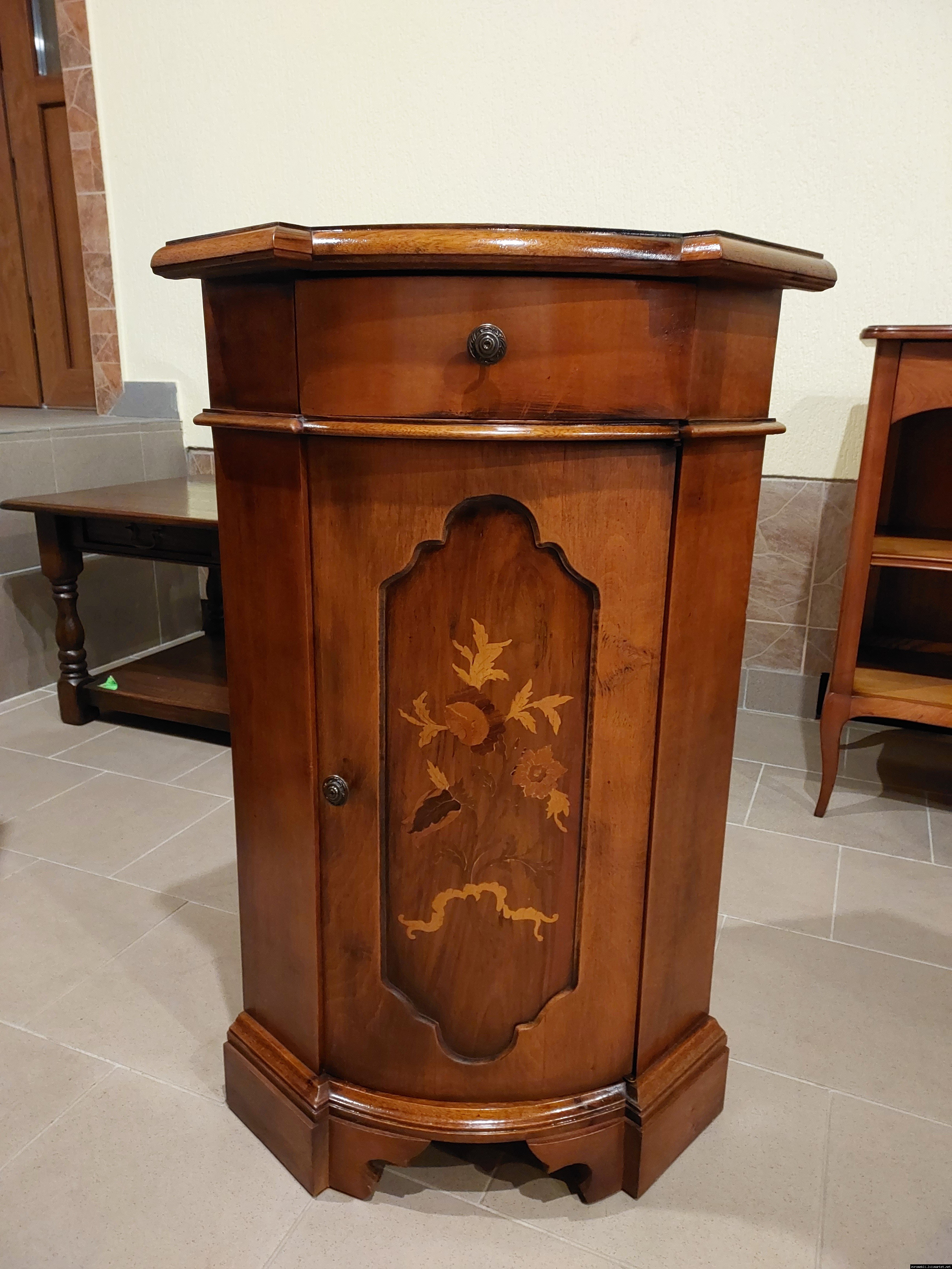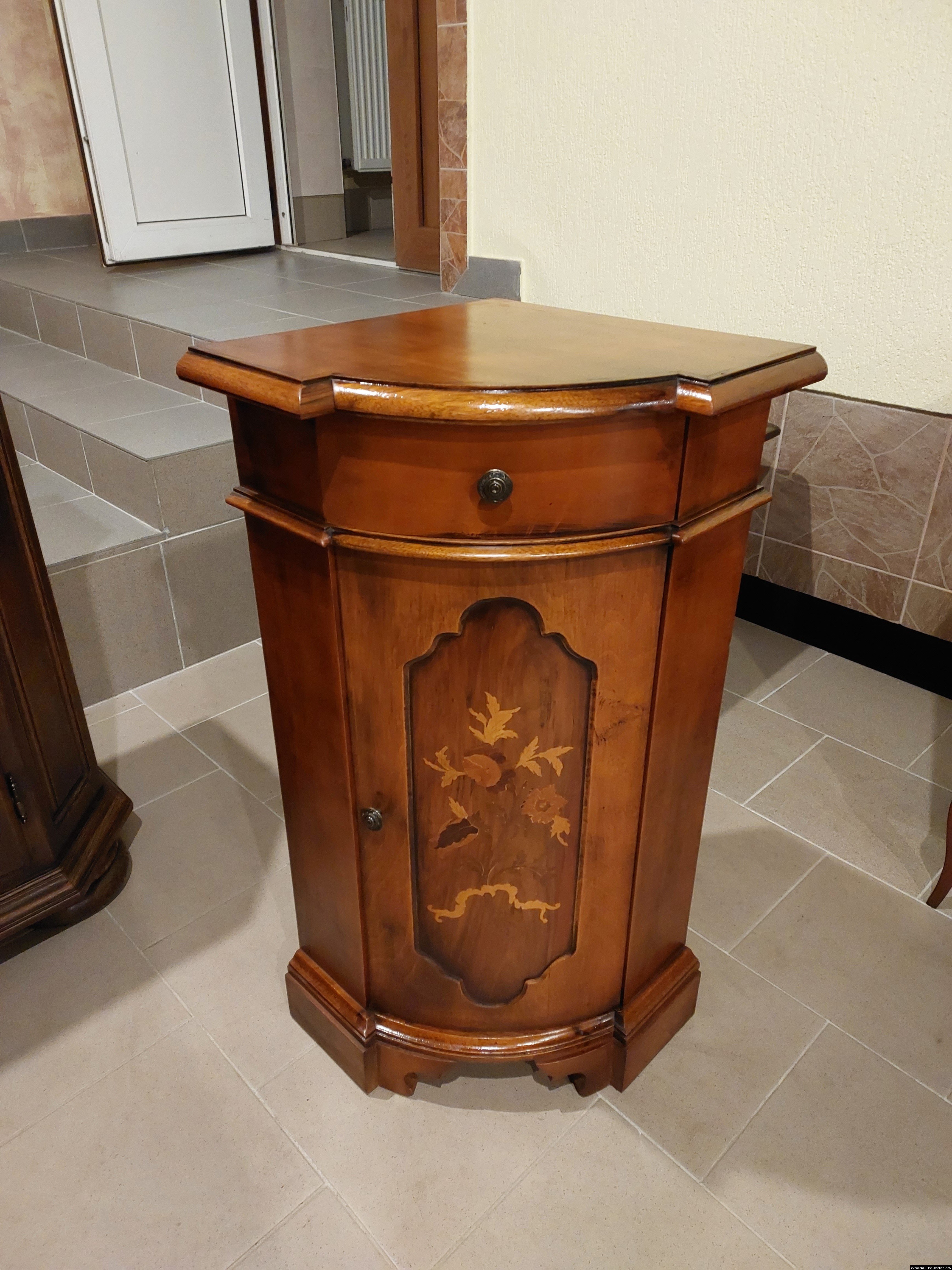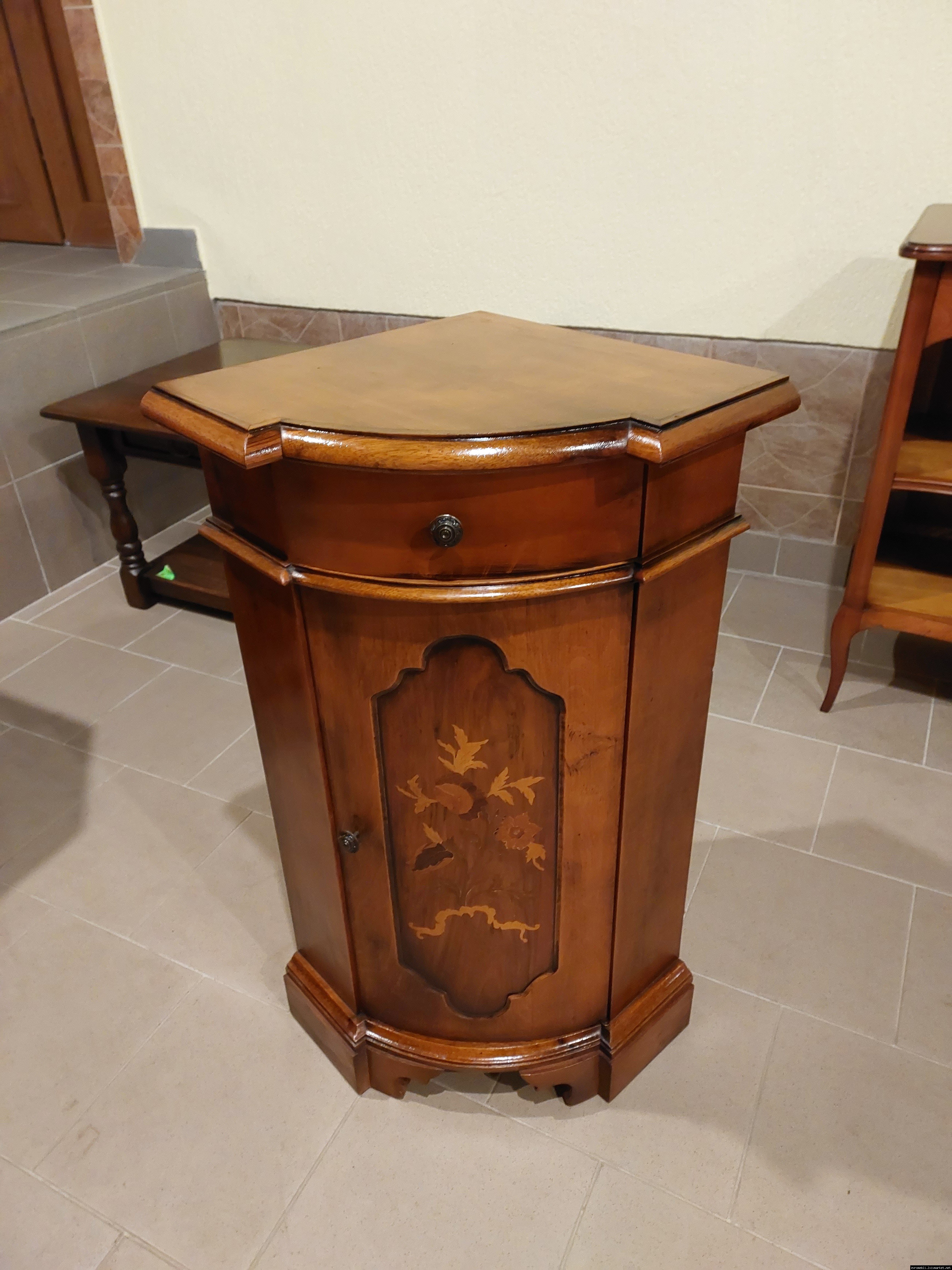Красива, деревяна, кутова тумбочка в стилі Людовіка XVI. Італія. Тумбочка виготовлена з масиву натурального дерева, горіх, має одну дверку та одну шухляду, всередині є деревяна полиця. Тумбочка з латунними ручками, декорована інкрустацією, в хорошому стані, привезена з Бельгії.