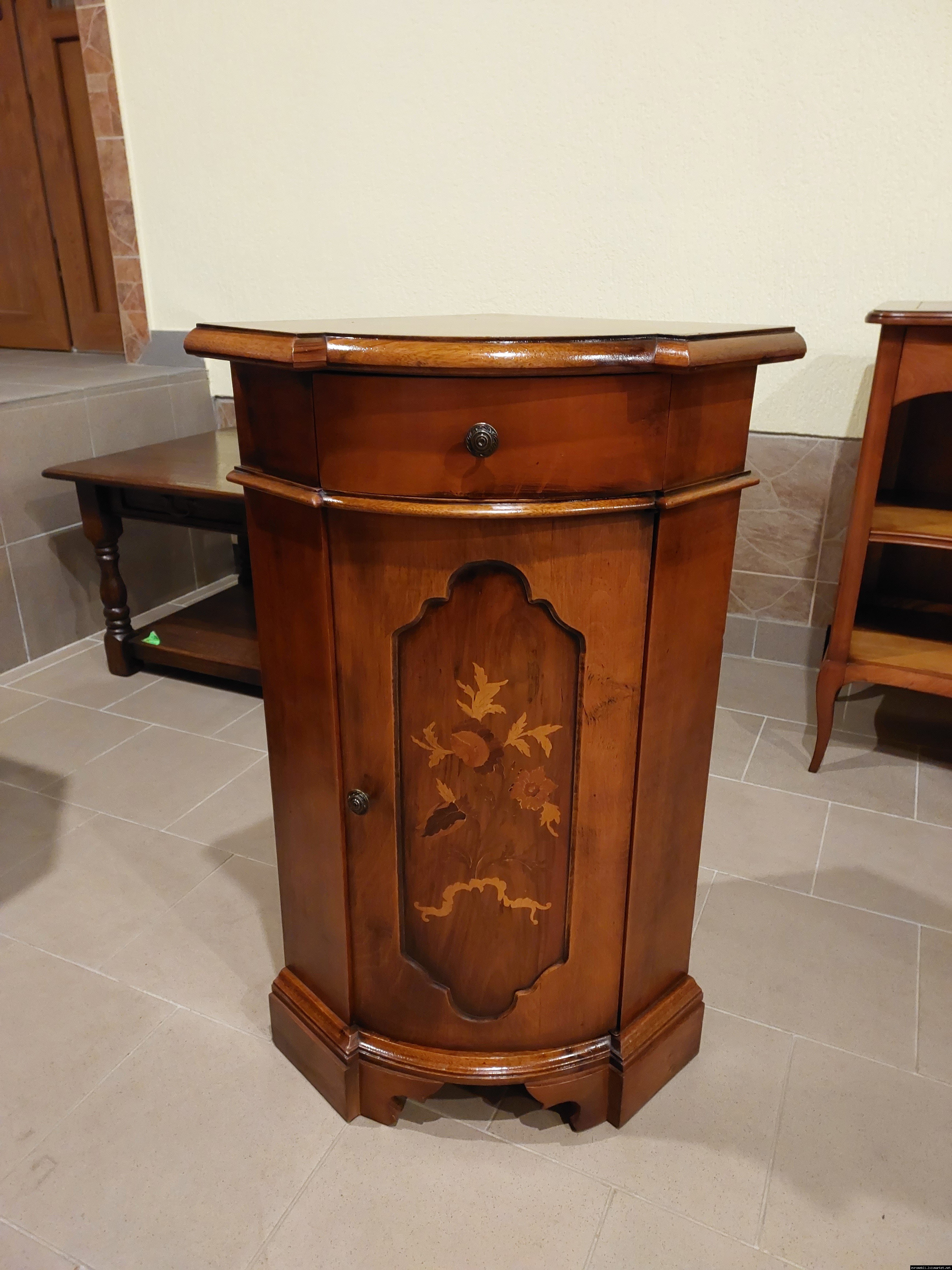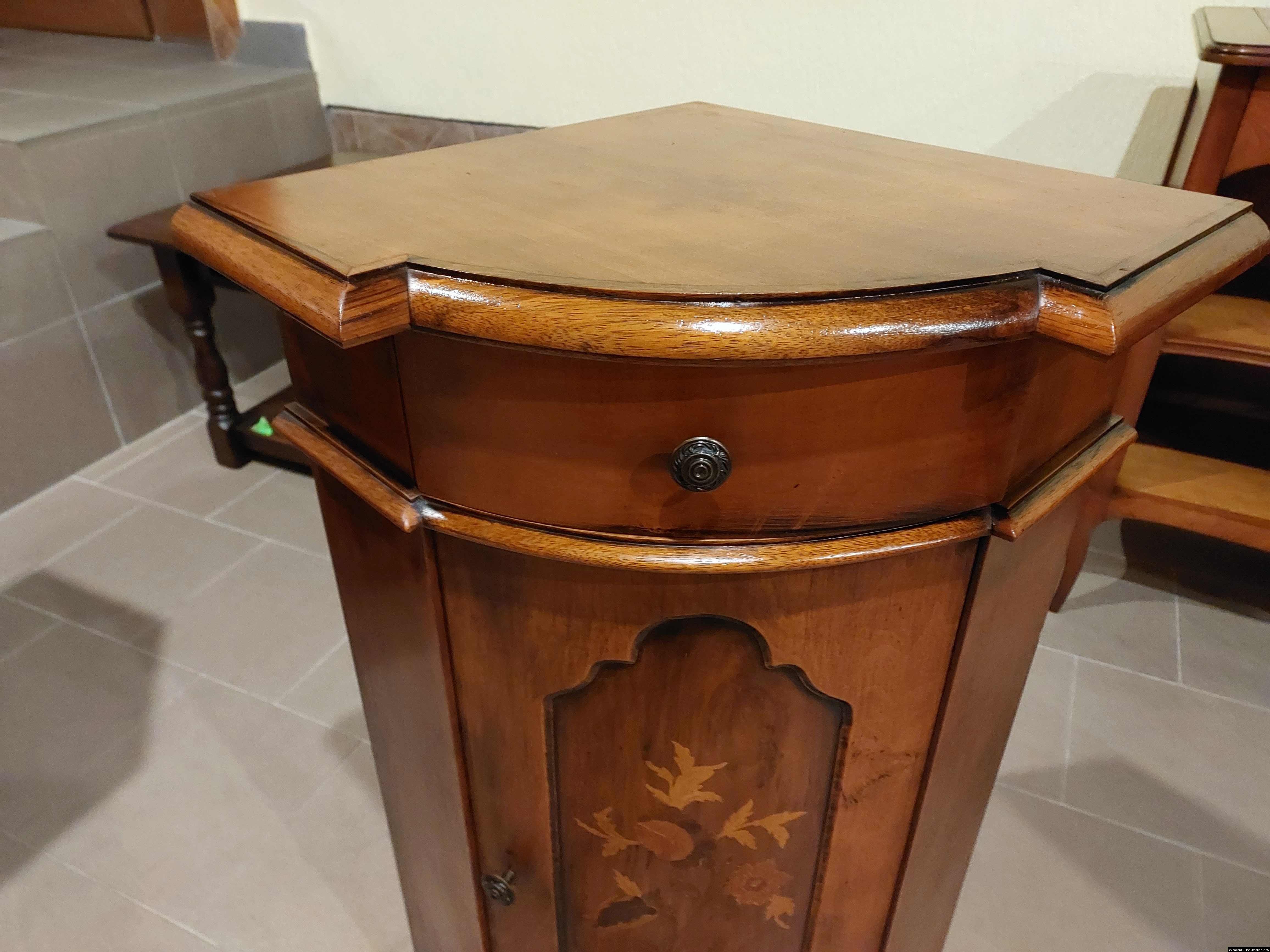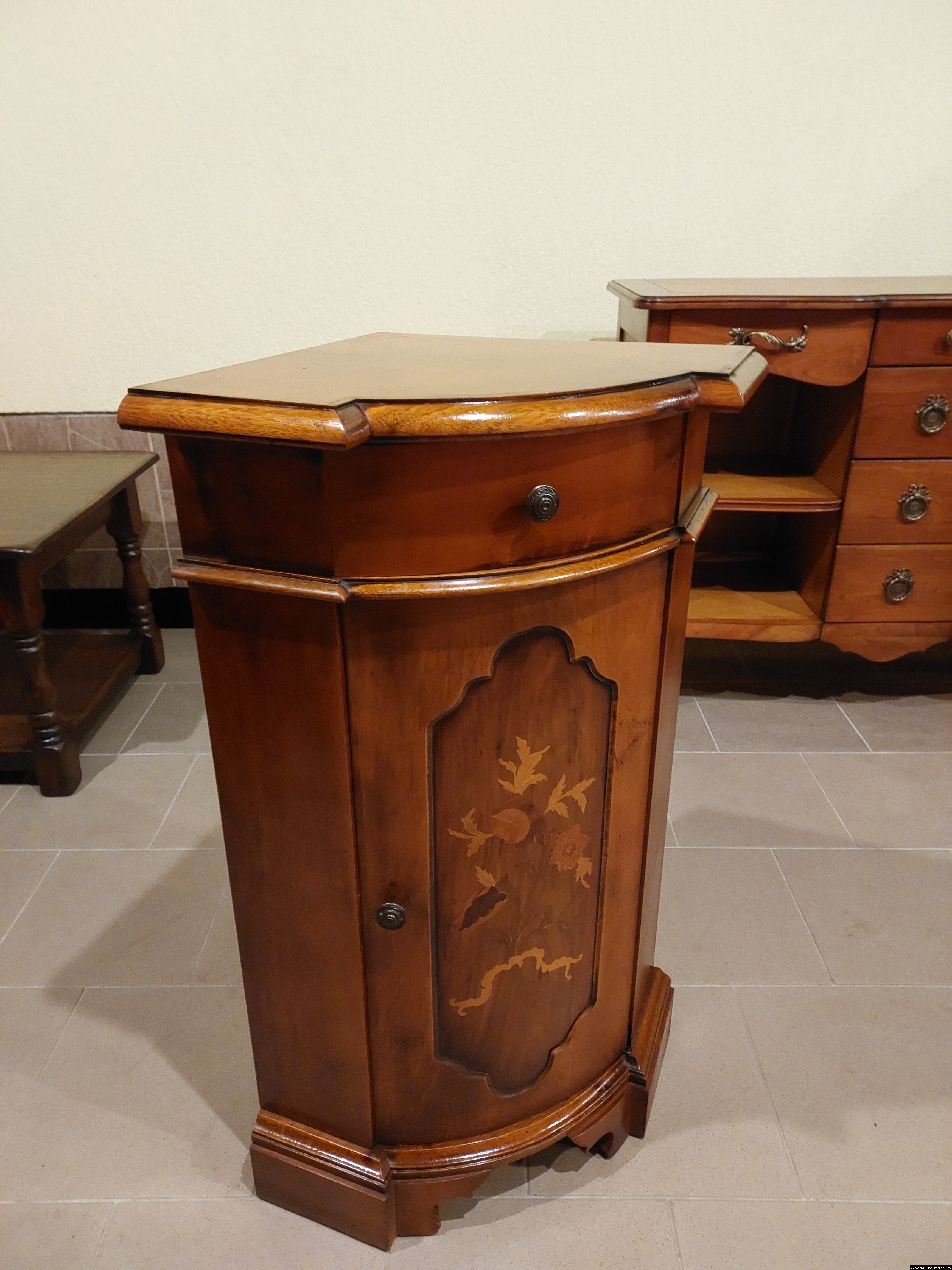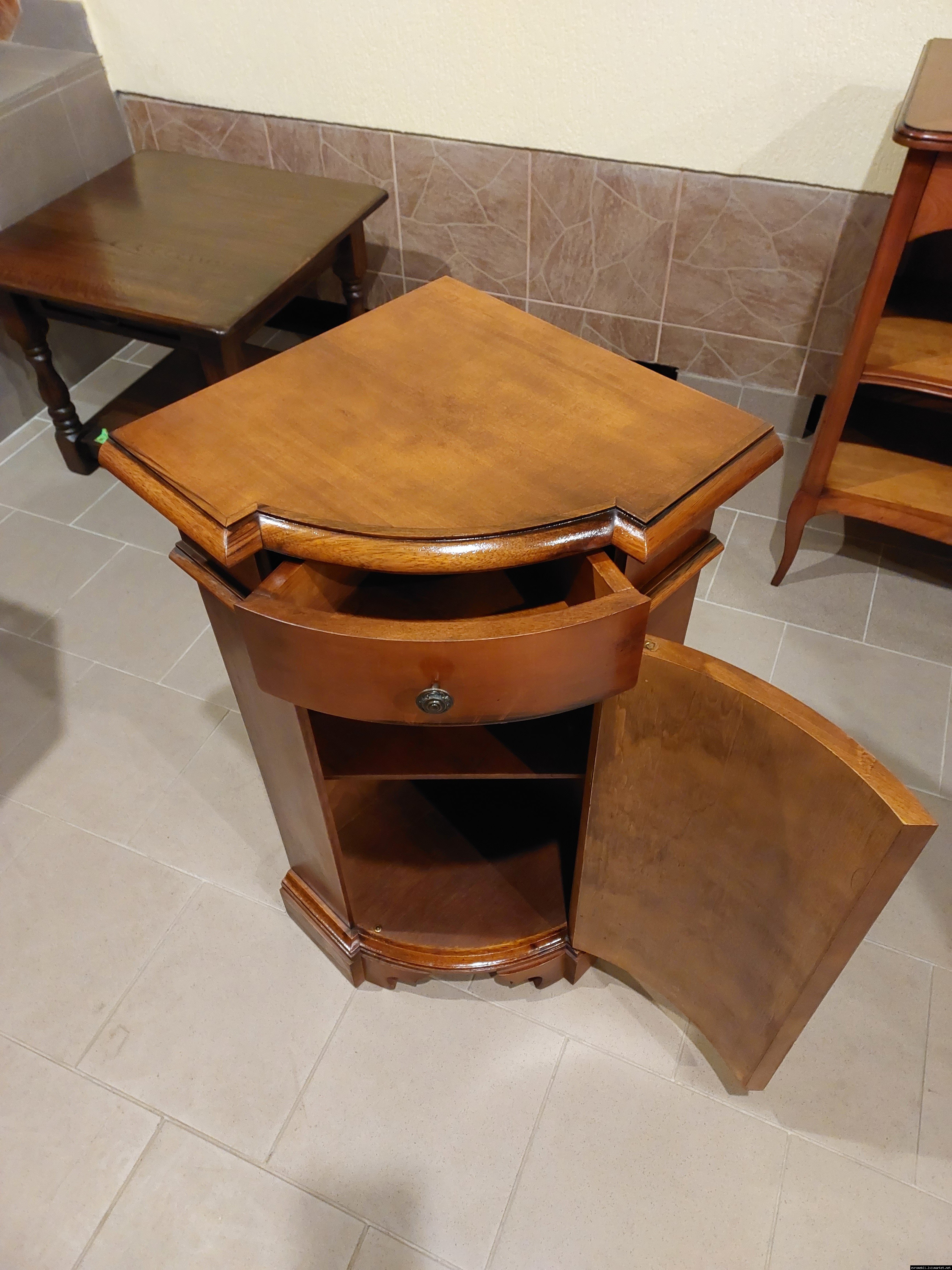 Красива, деревяна, кутова тумбочка в стилі Людовіка XVI. Італія. Тумбочка виготовлена з масиву натурального дерева, горіх, має одну дверку та одну шухляду, всередині є деревяна полиця. Тумбочка з латунними ручками, декорована інкрустацією, в хорошому стані, привезена з Бельгії.