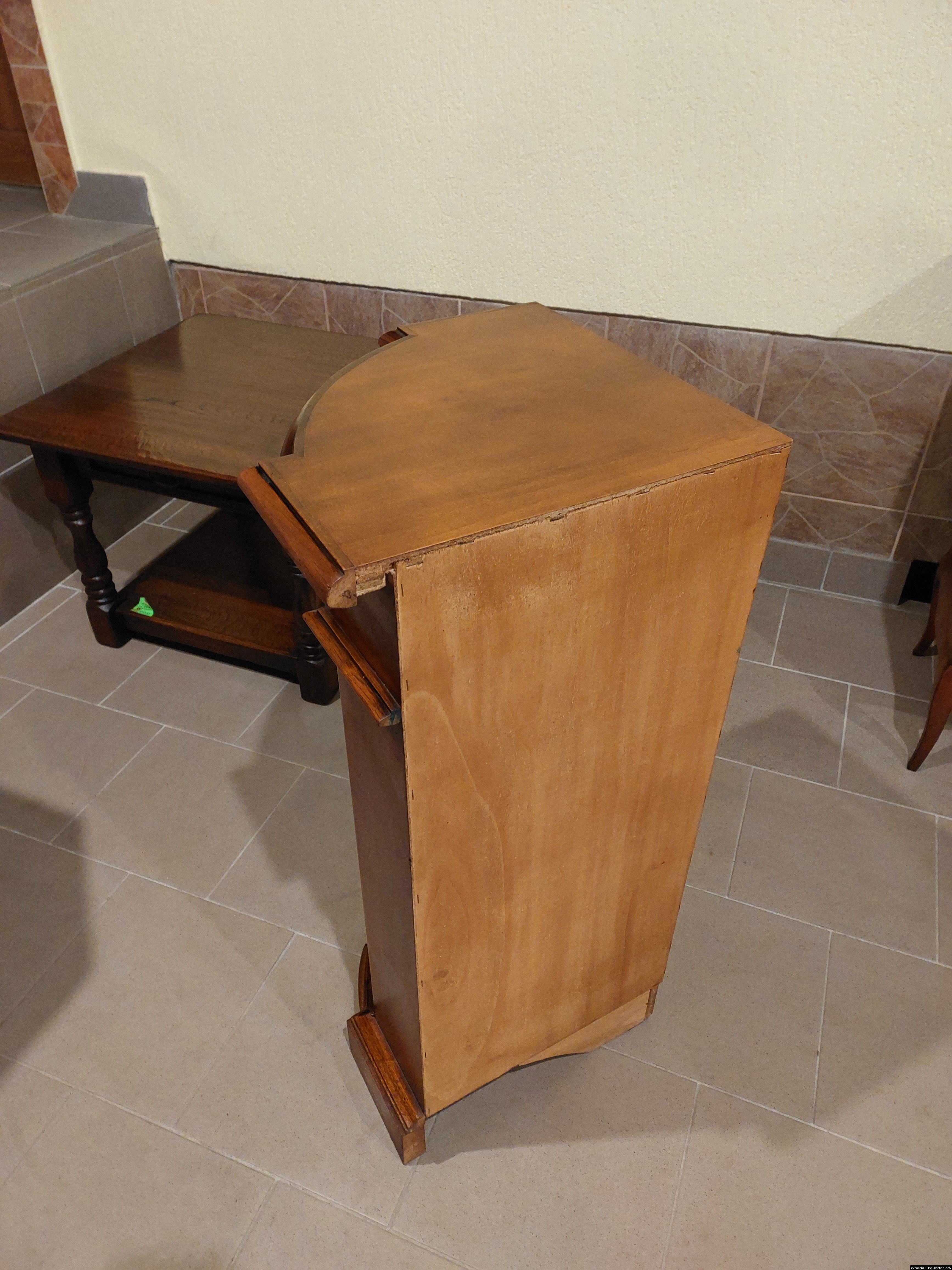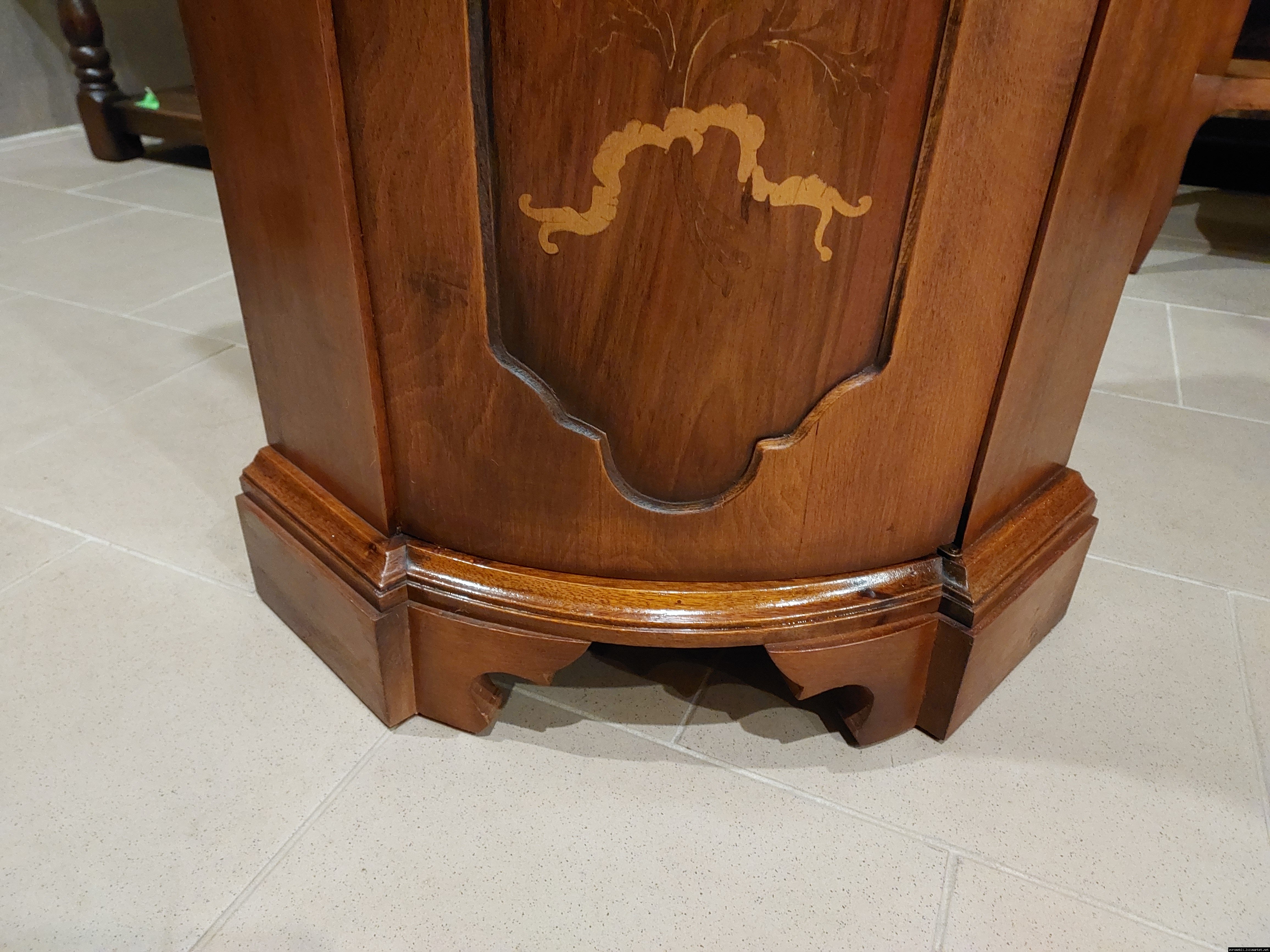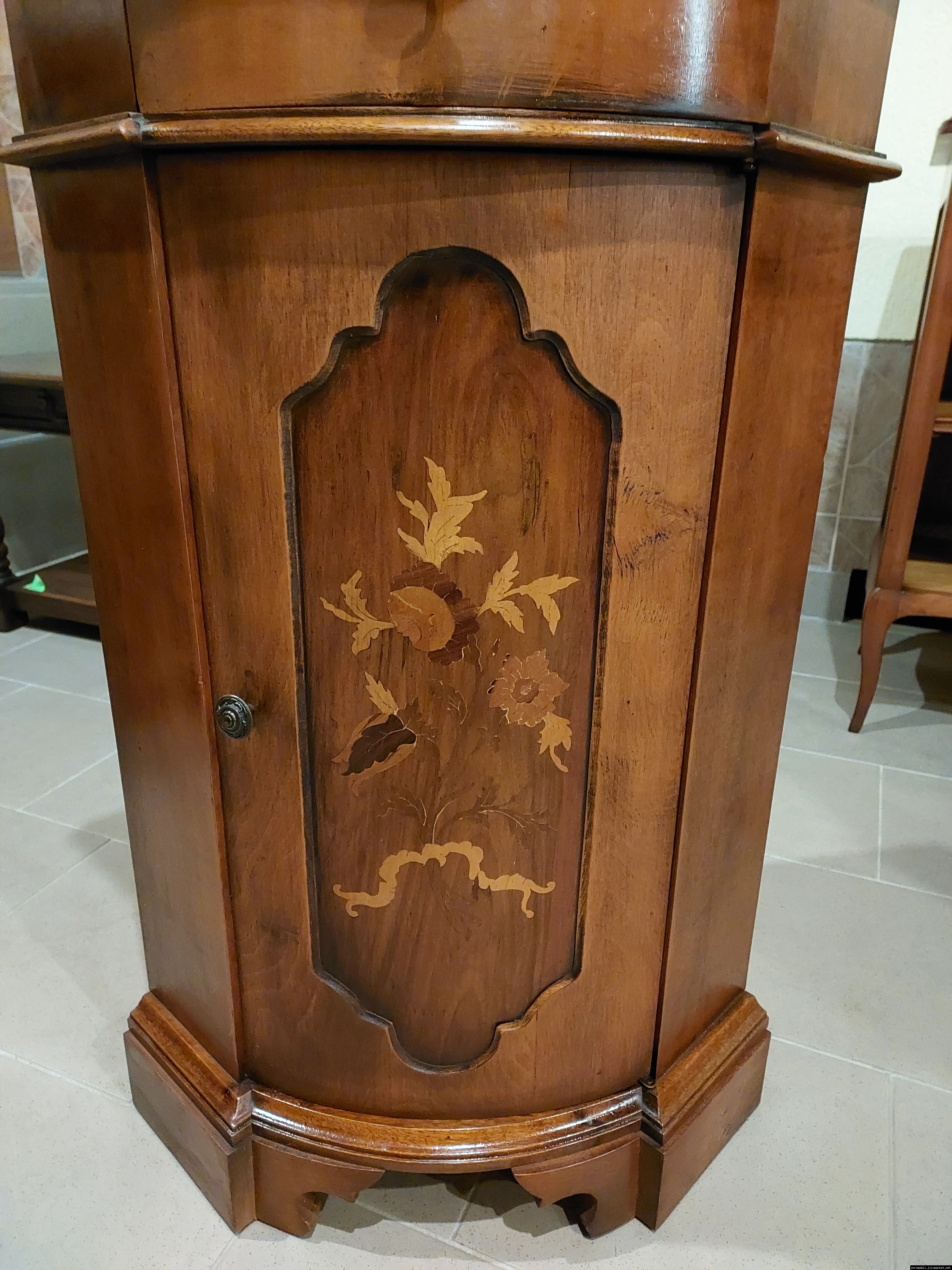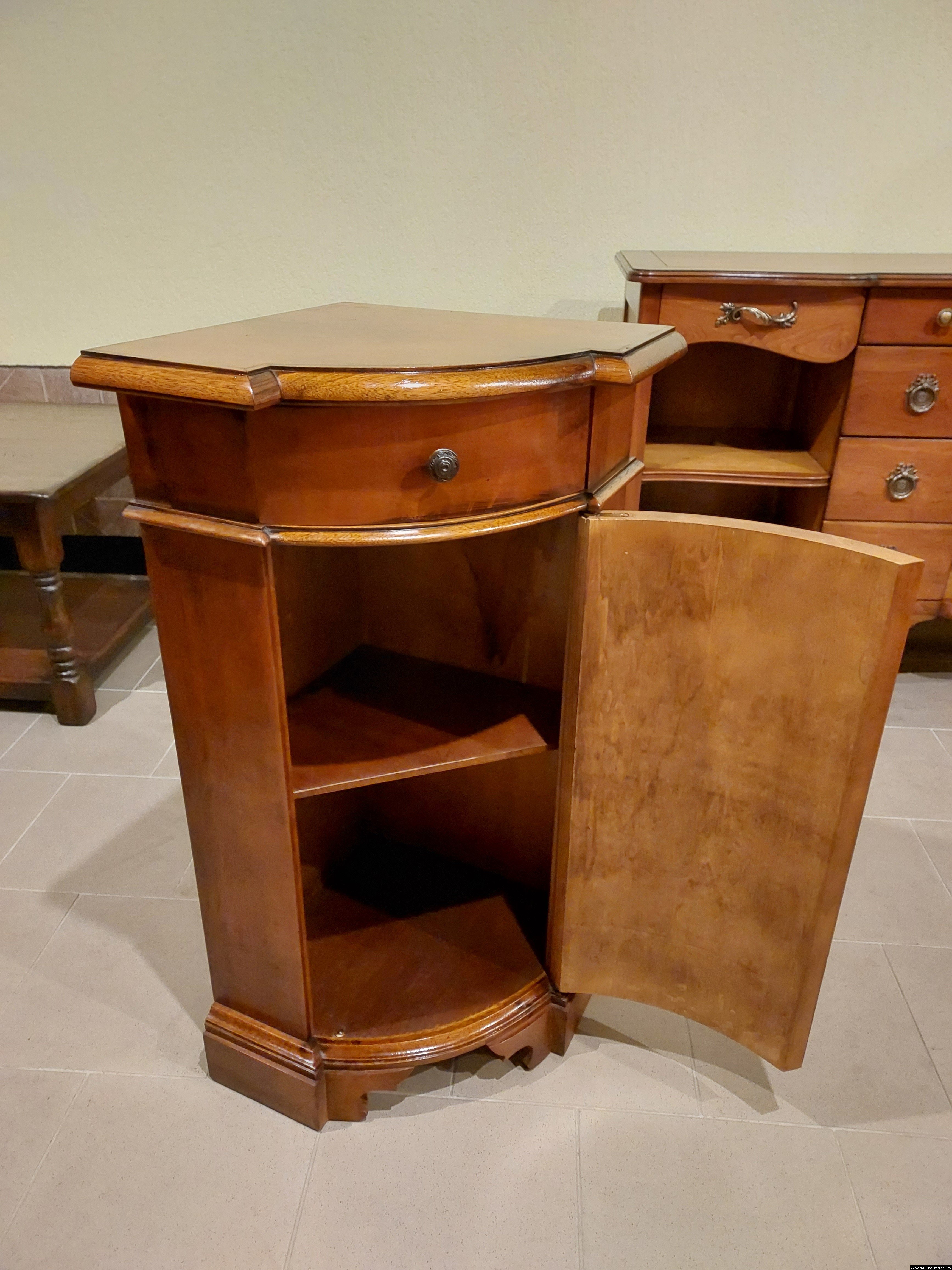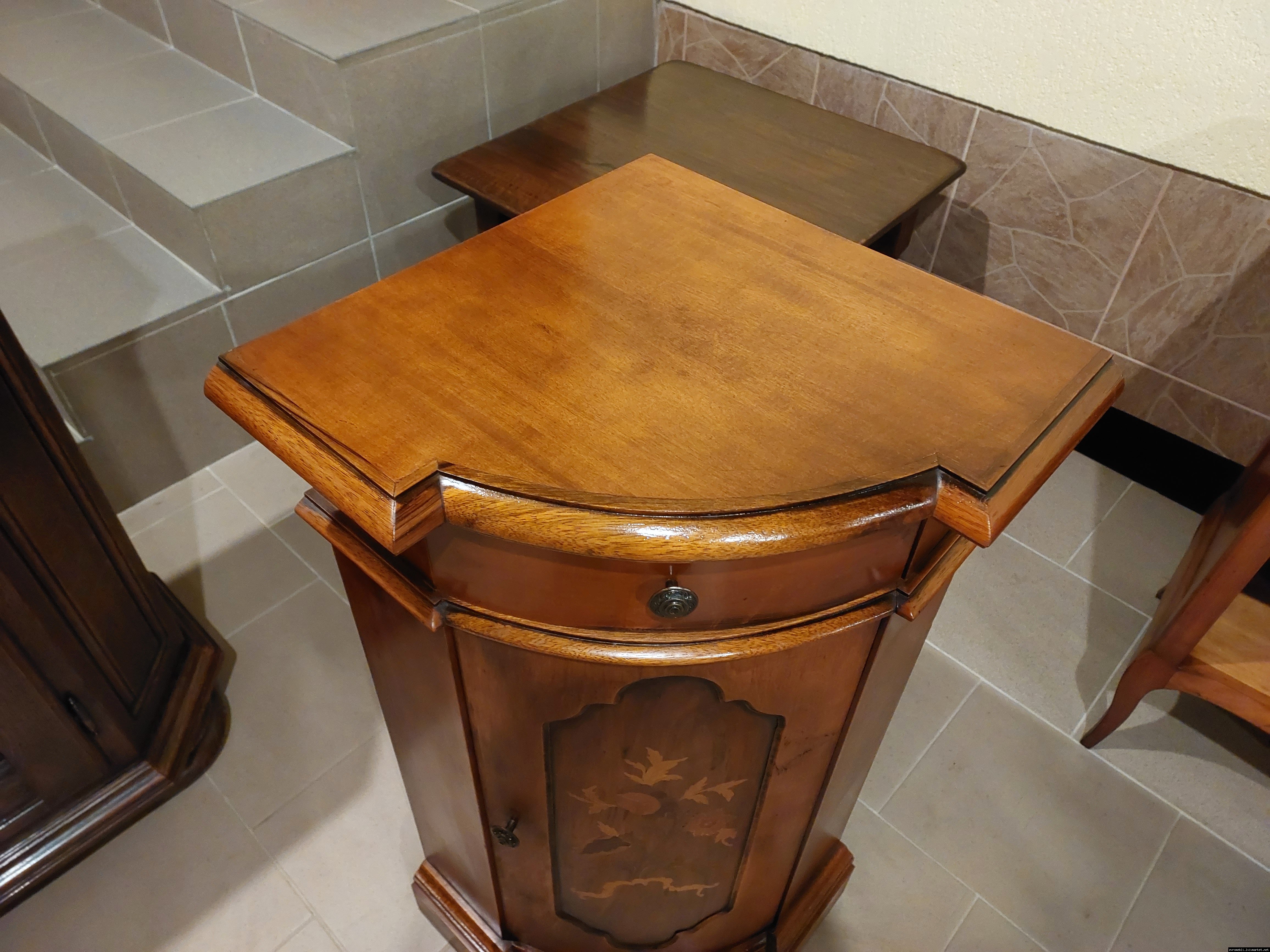 Красива, деревяна, кутова тумбочка в стилі Людовіка XVI. Італія. Тумбочка виготовлена з масиву натурального дерева, горіх, має одну дверку та одну шухляду, всередині є деревяна полиця. Тумбочка з латунними ручками, декорована інкрустацією, в хорошому стані, привезена з Бельгії.
