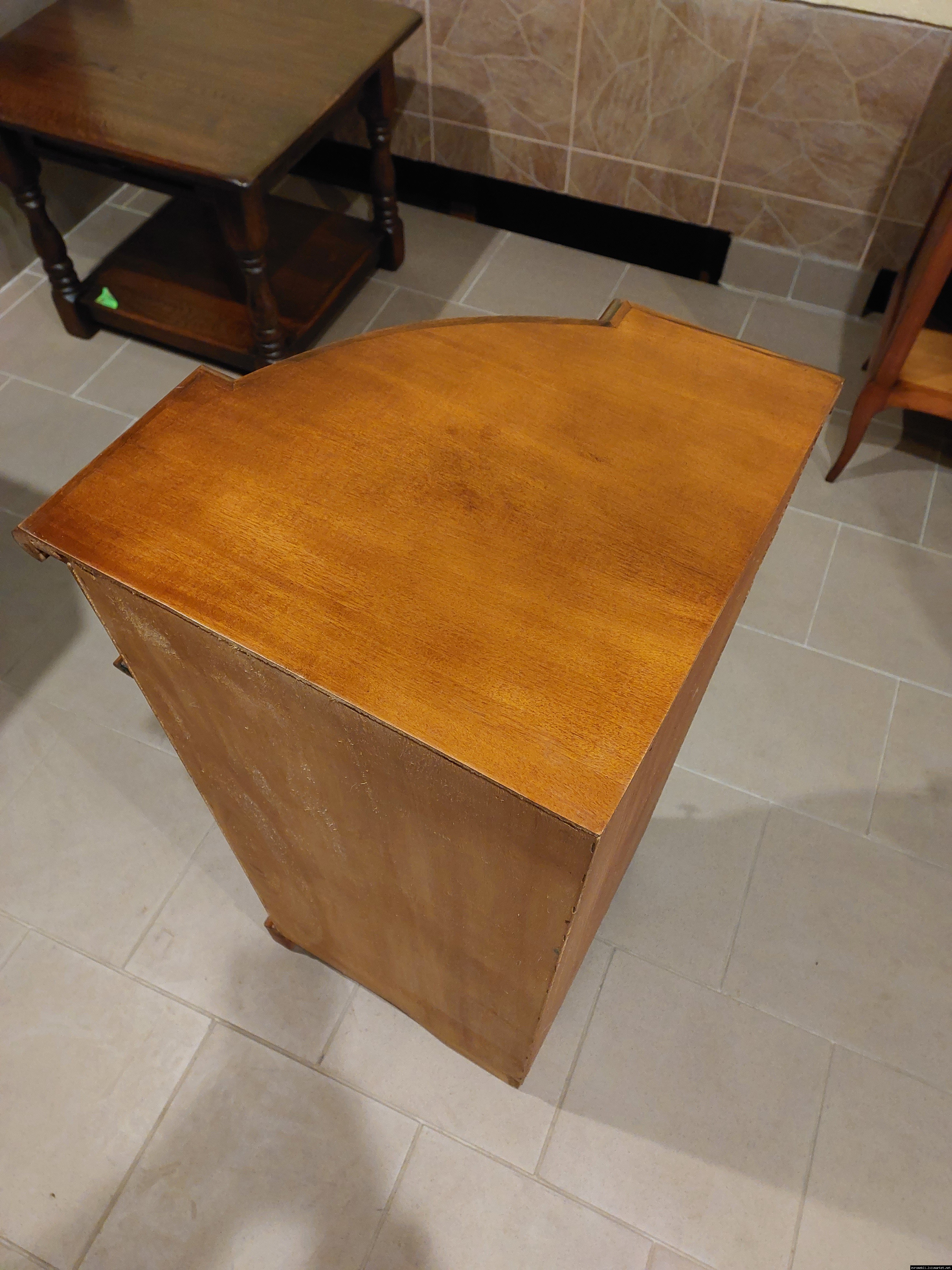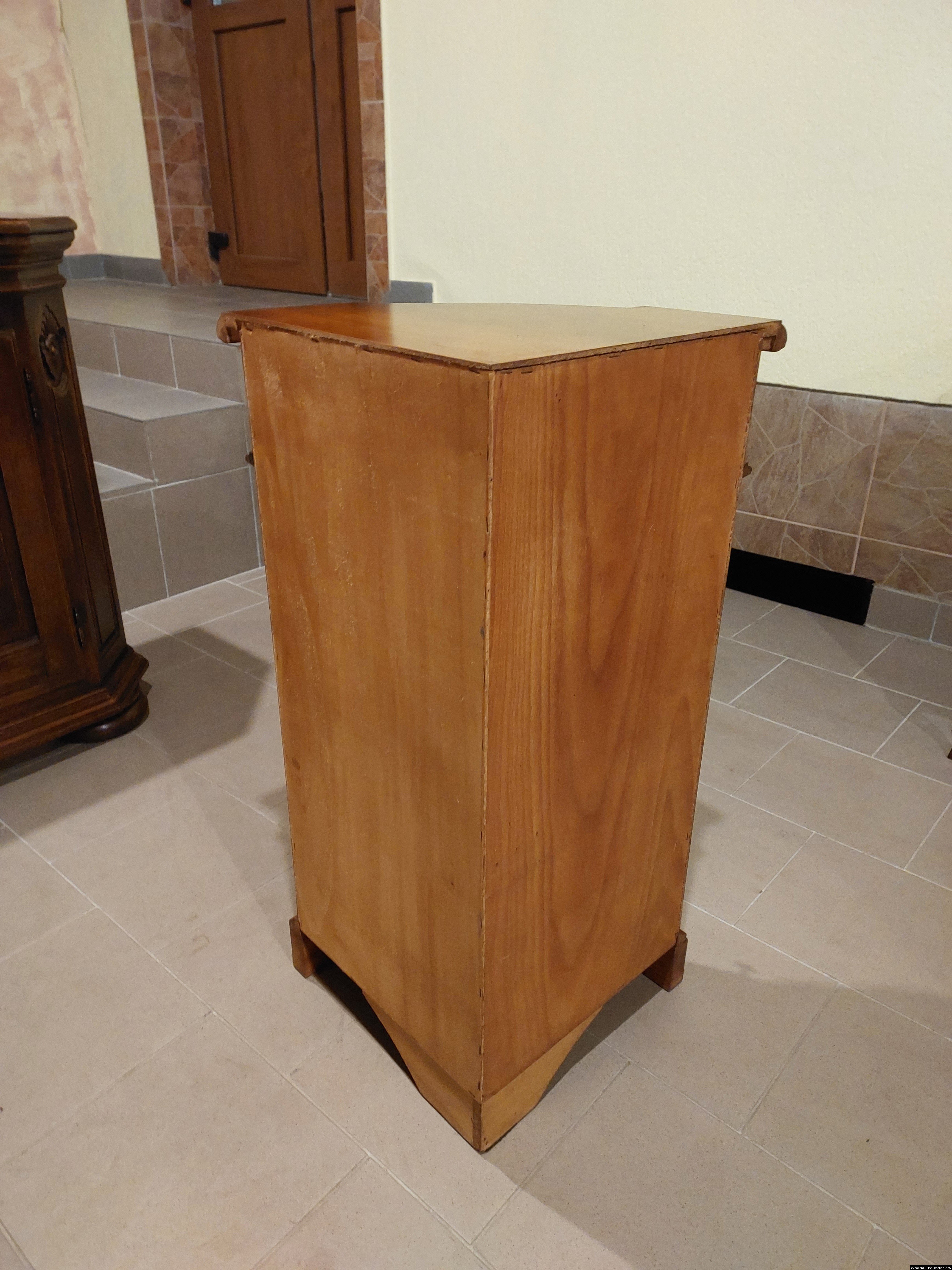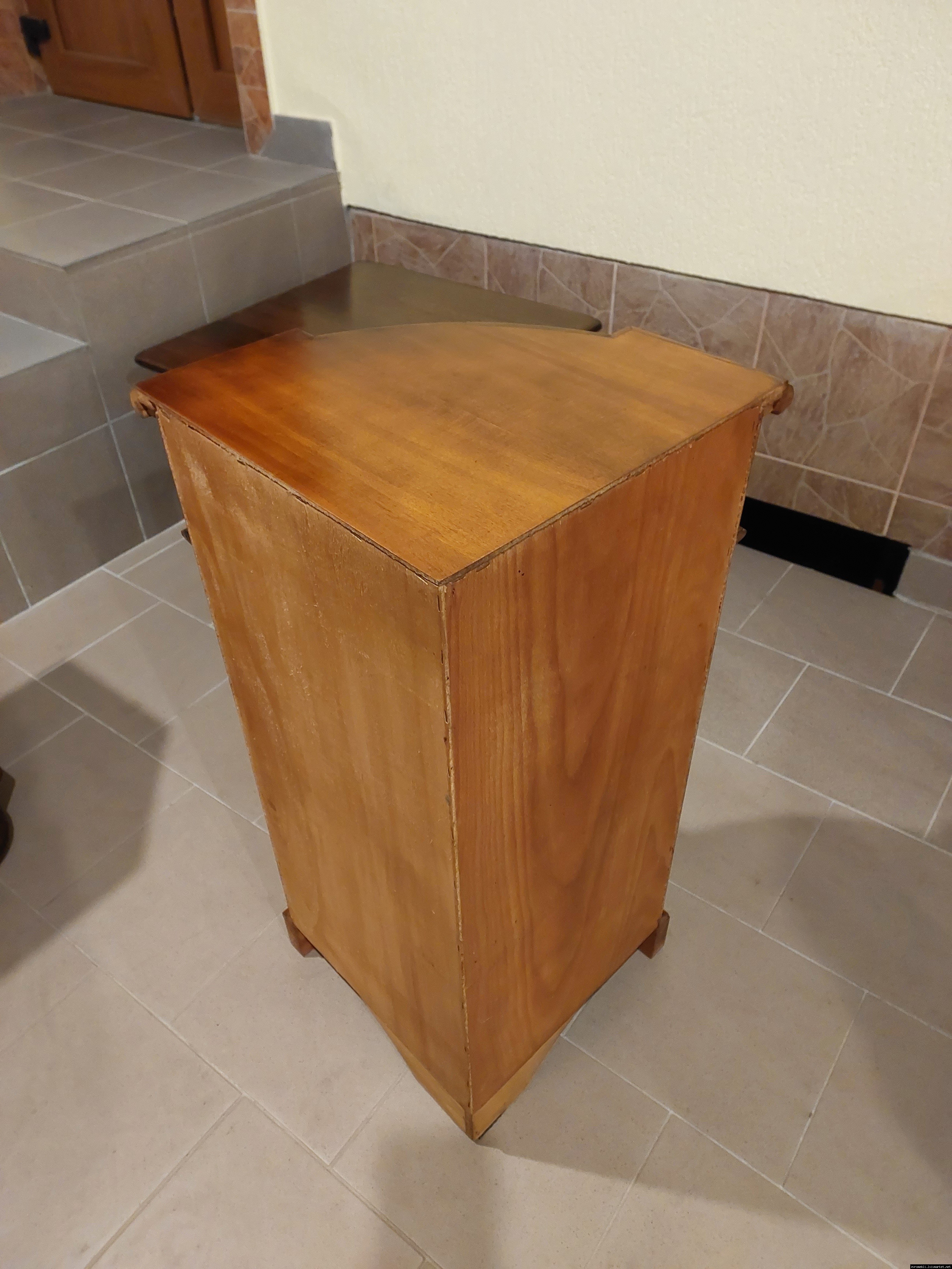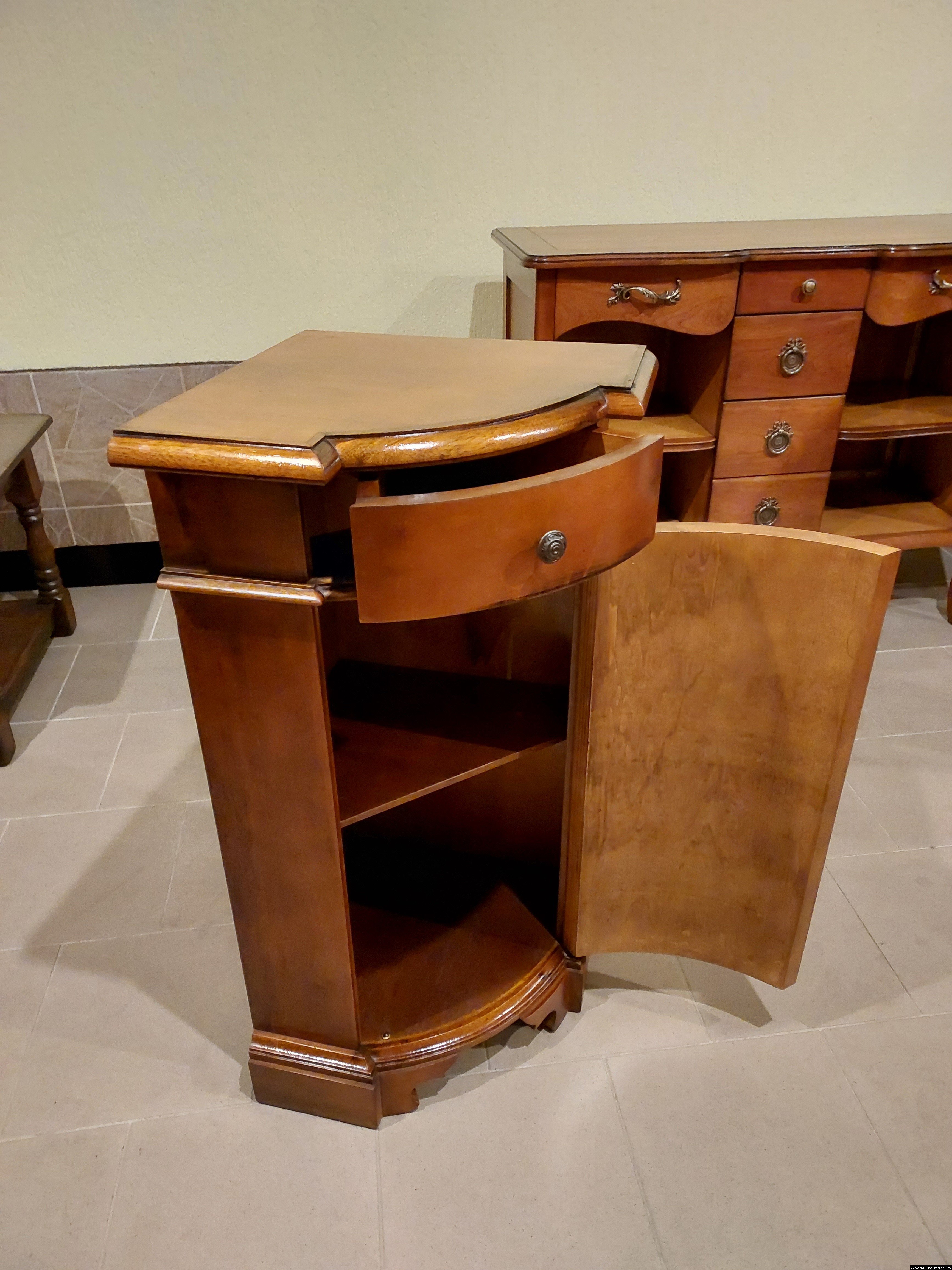 Красива, деревяна, кутова тумбочка в стилі Людовіка XVI. Італія. Тумбочка виготовлена з масиву натурального дерева, горіх, має одну дверку та одну шухляду, всередині є деревяна полиця. Тумбочка з латунними ручками, декорована інкрустацією, в хорошому стані, привезена з Бельгії.