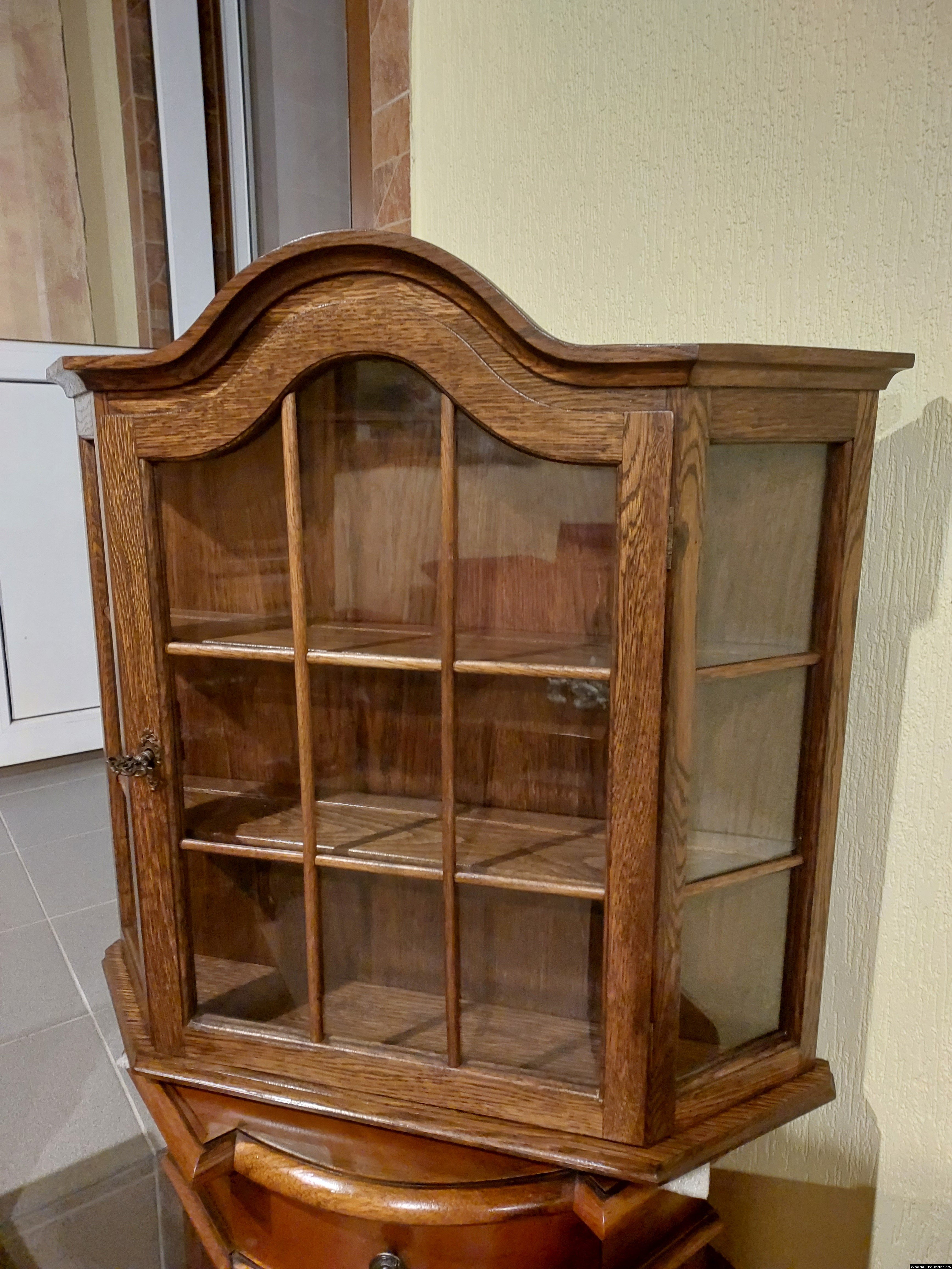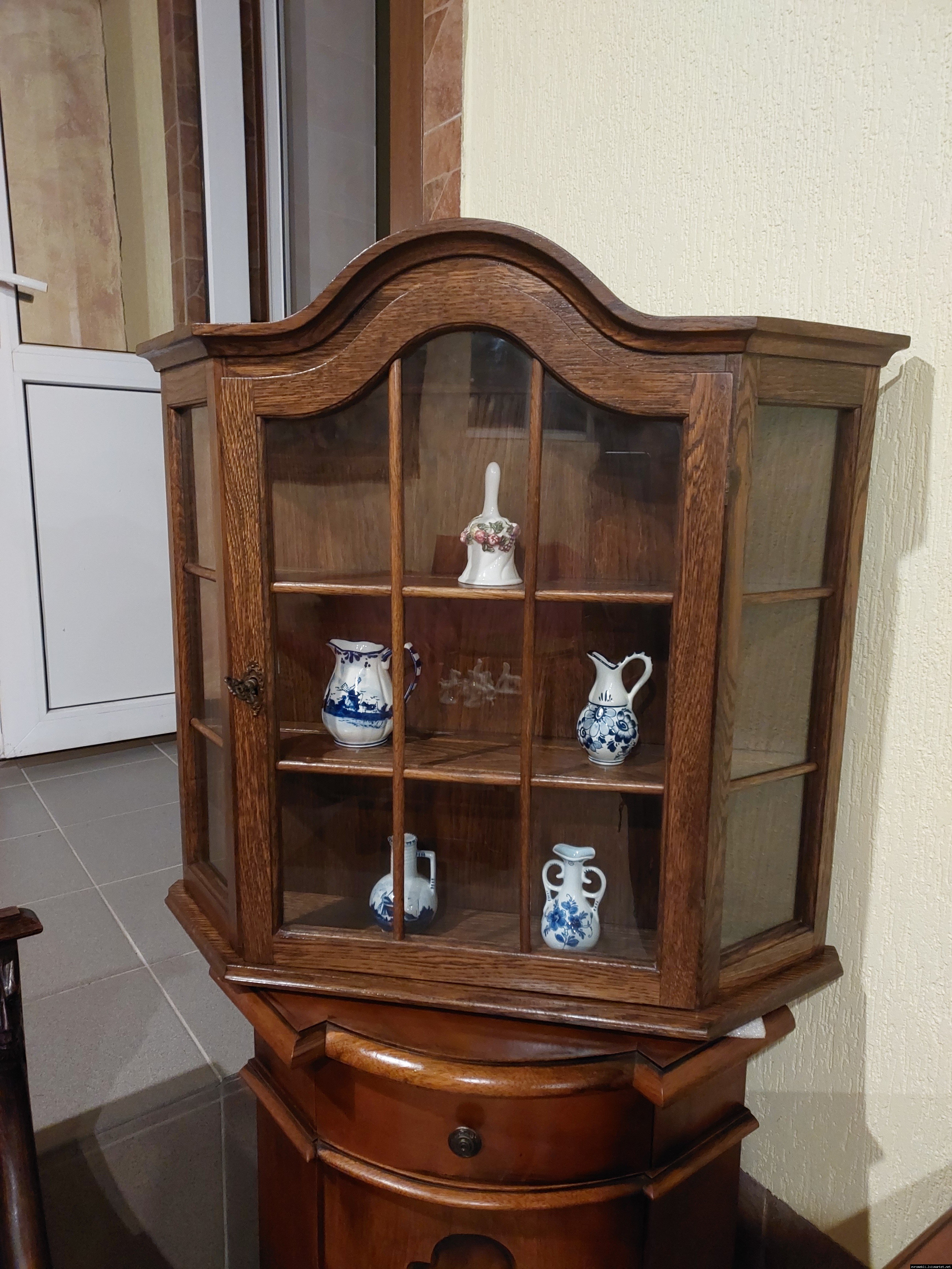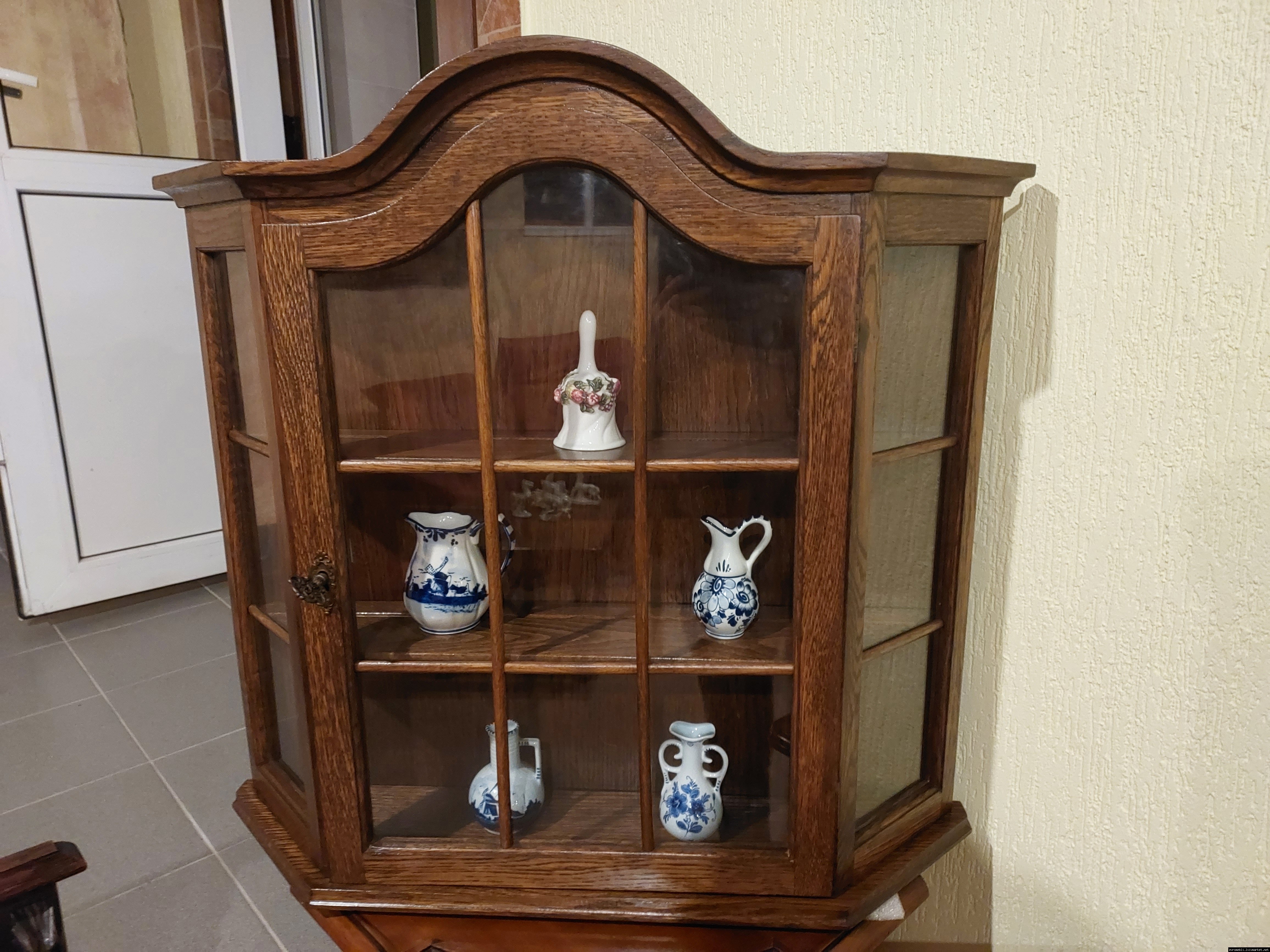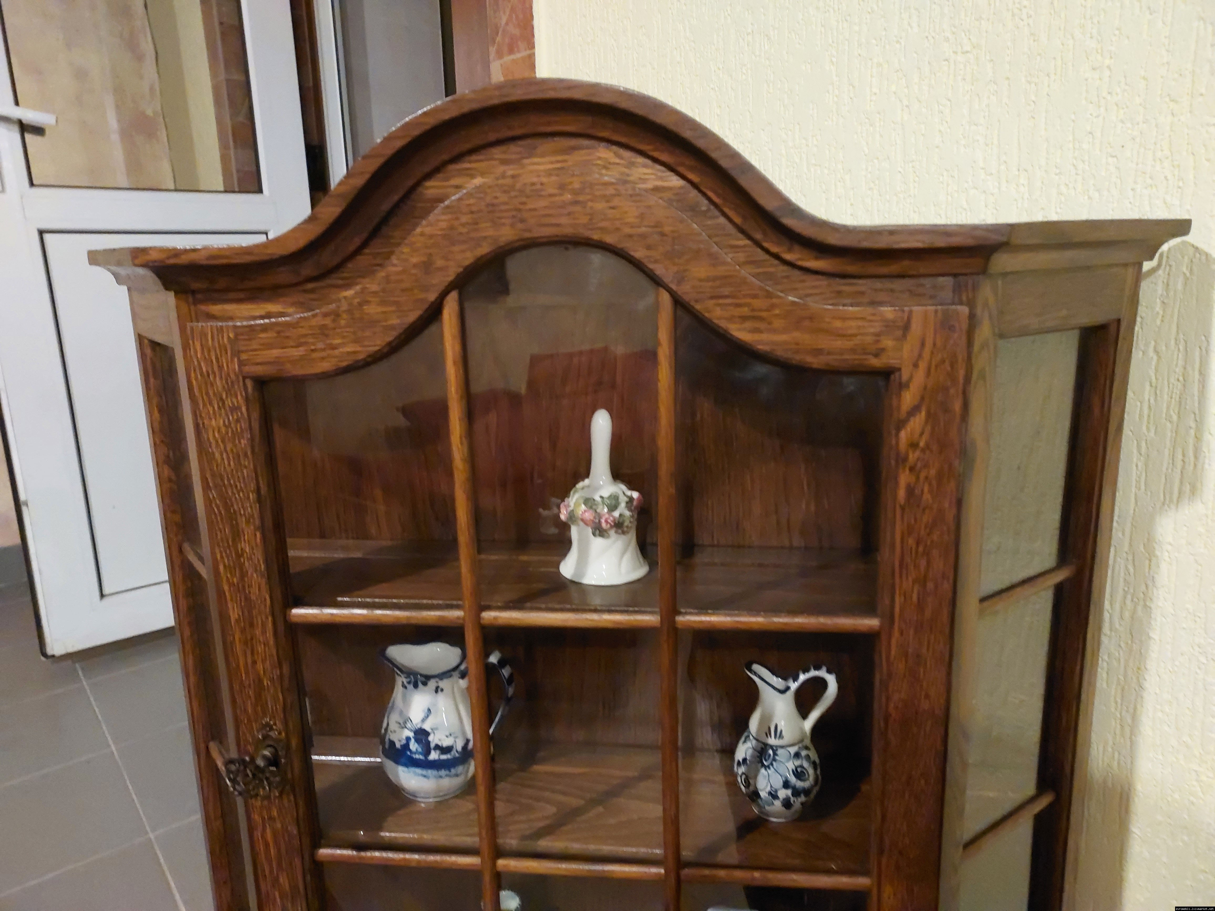 Красива, маленька, деревяна, підвісна вітринка. Вітрина виготовлена з масиву натурального дерева, темно- золотистий дуб, має одну дверку зі ском. Вітрина меленька та компактна, в хорошому стані, привезена з Бельгії.