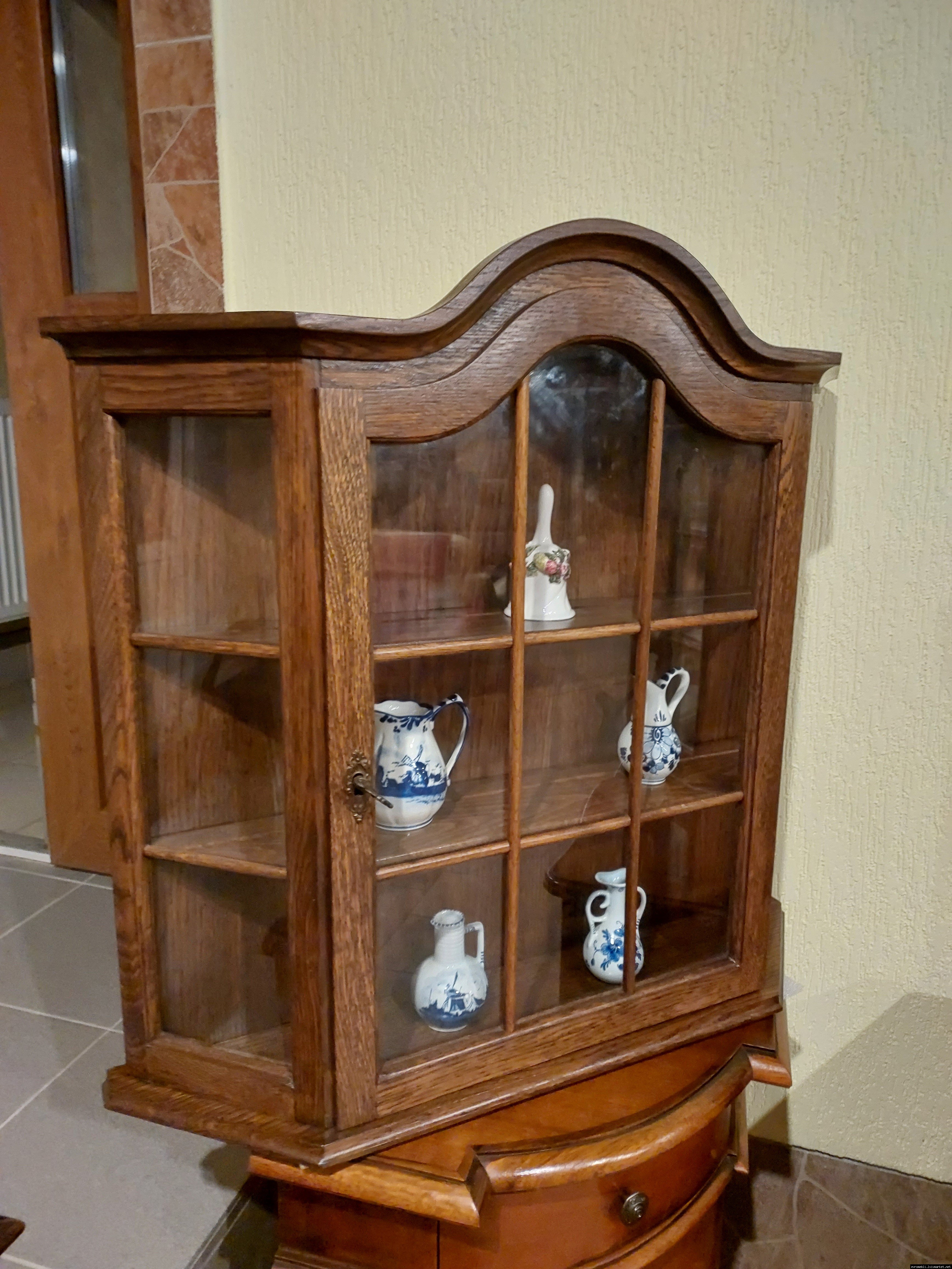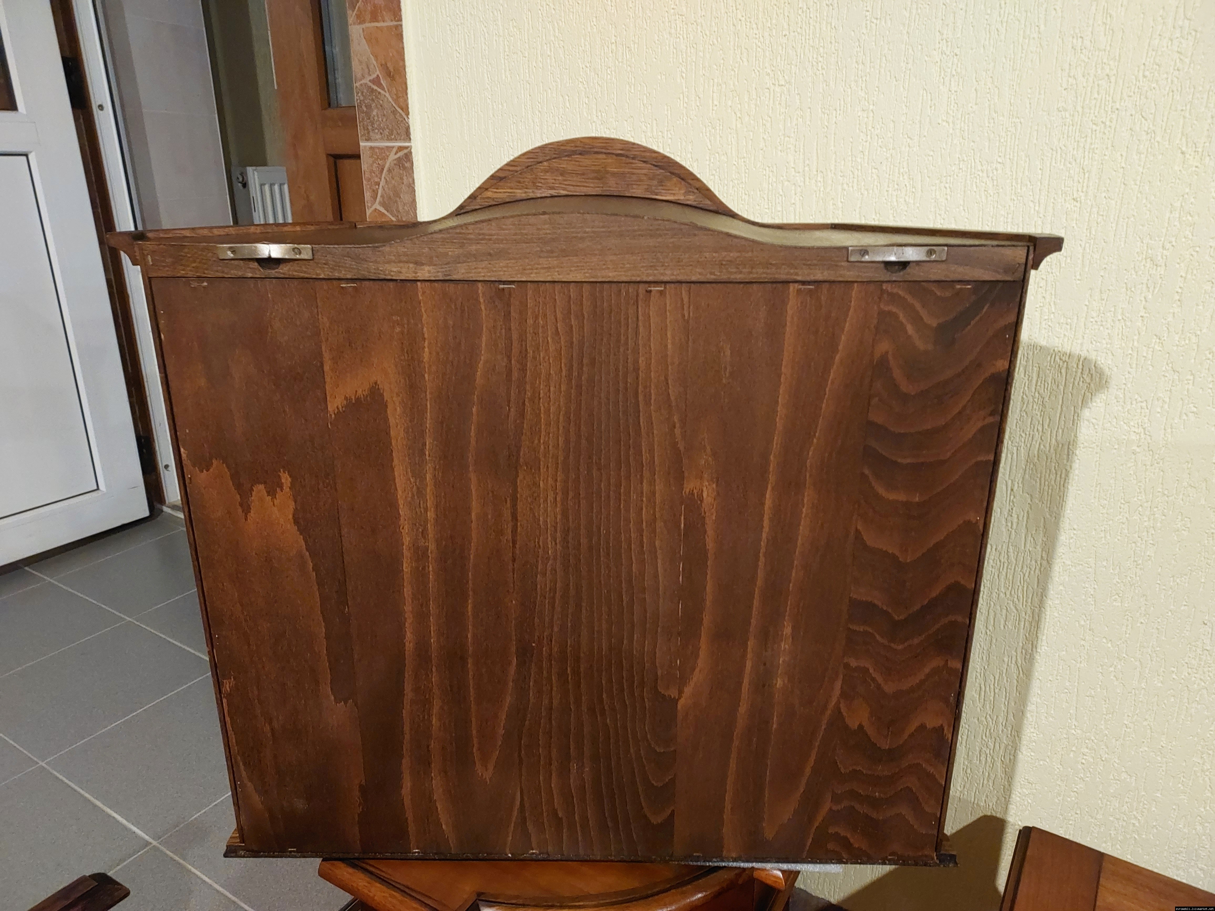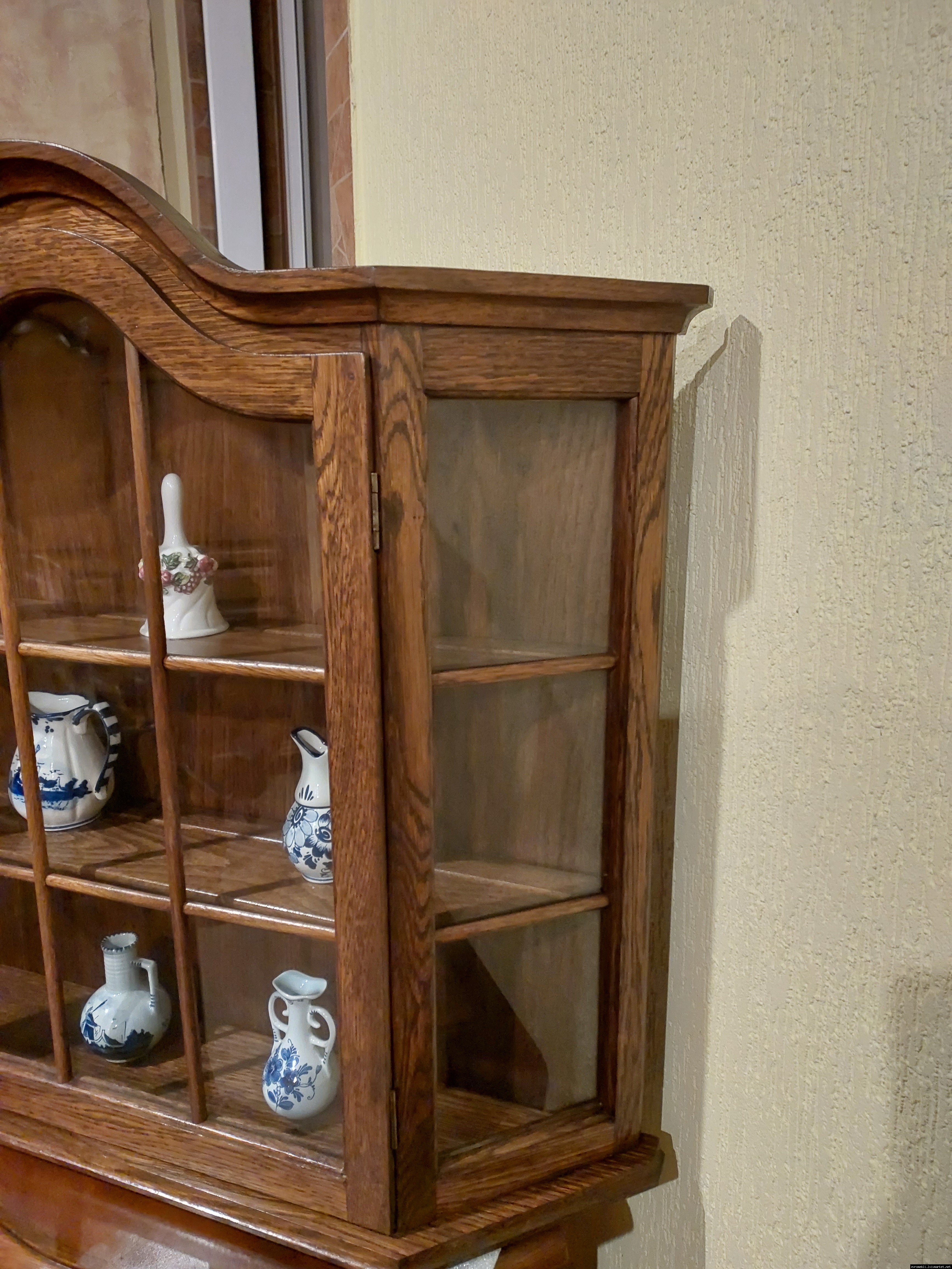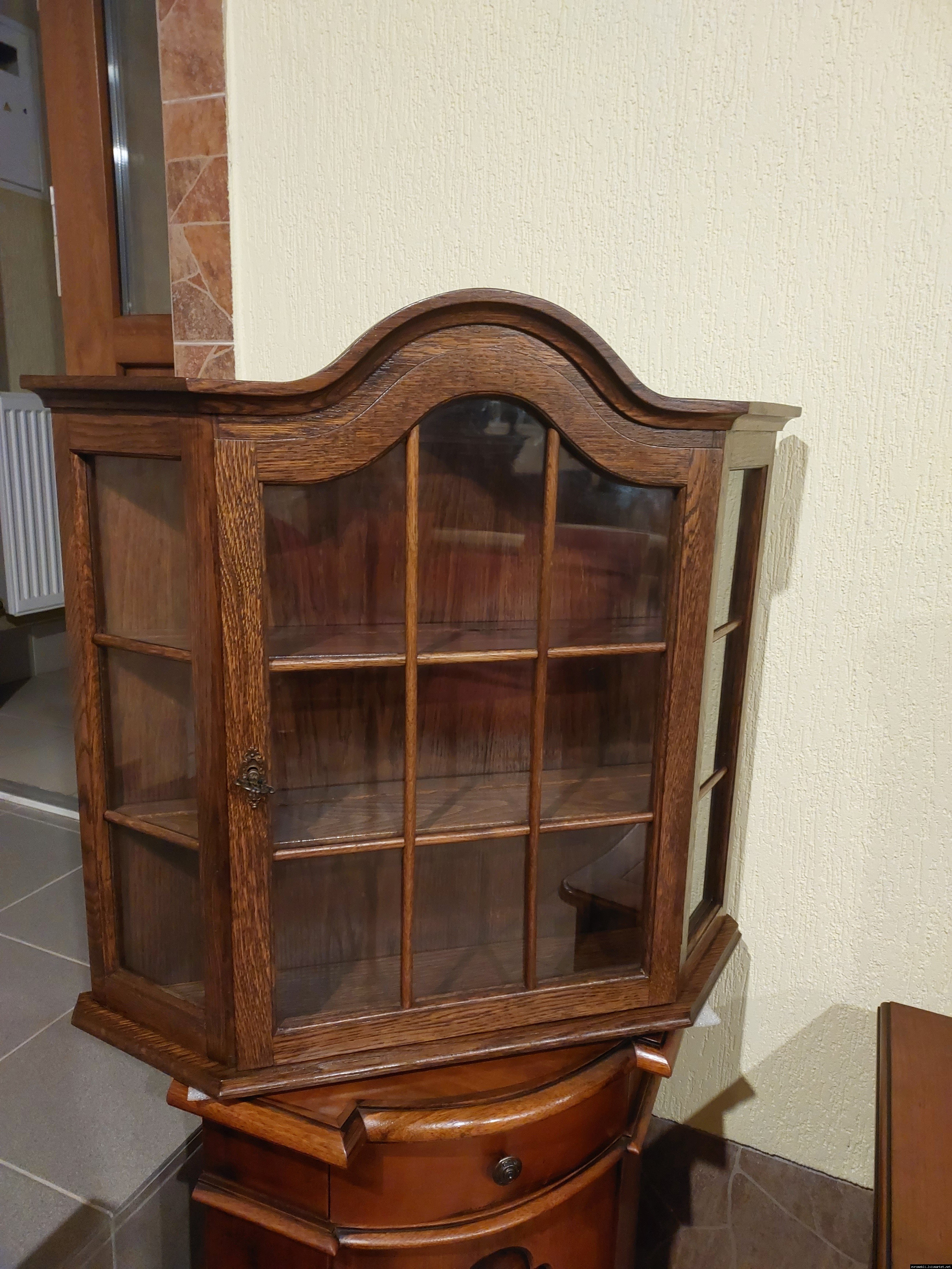 Красива, маленька, деревяна, підвісна вітринка. Вітрина виготовлена з масиву натурального дерева, темно- золотистий дуб, має одну дверку зі ском. Вітрина меленька та компактна, в хорошому стані, привезена з Бельгії.