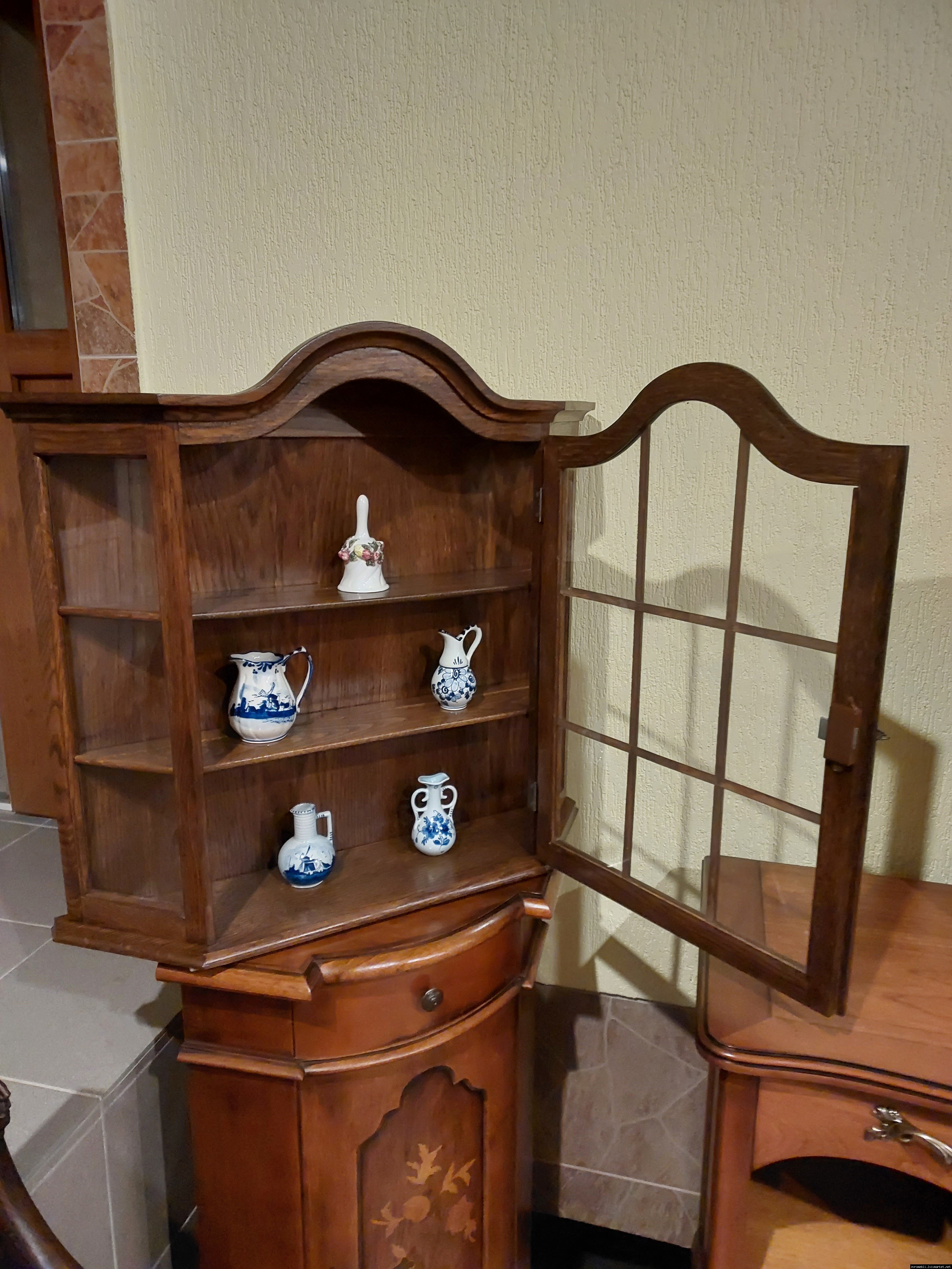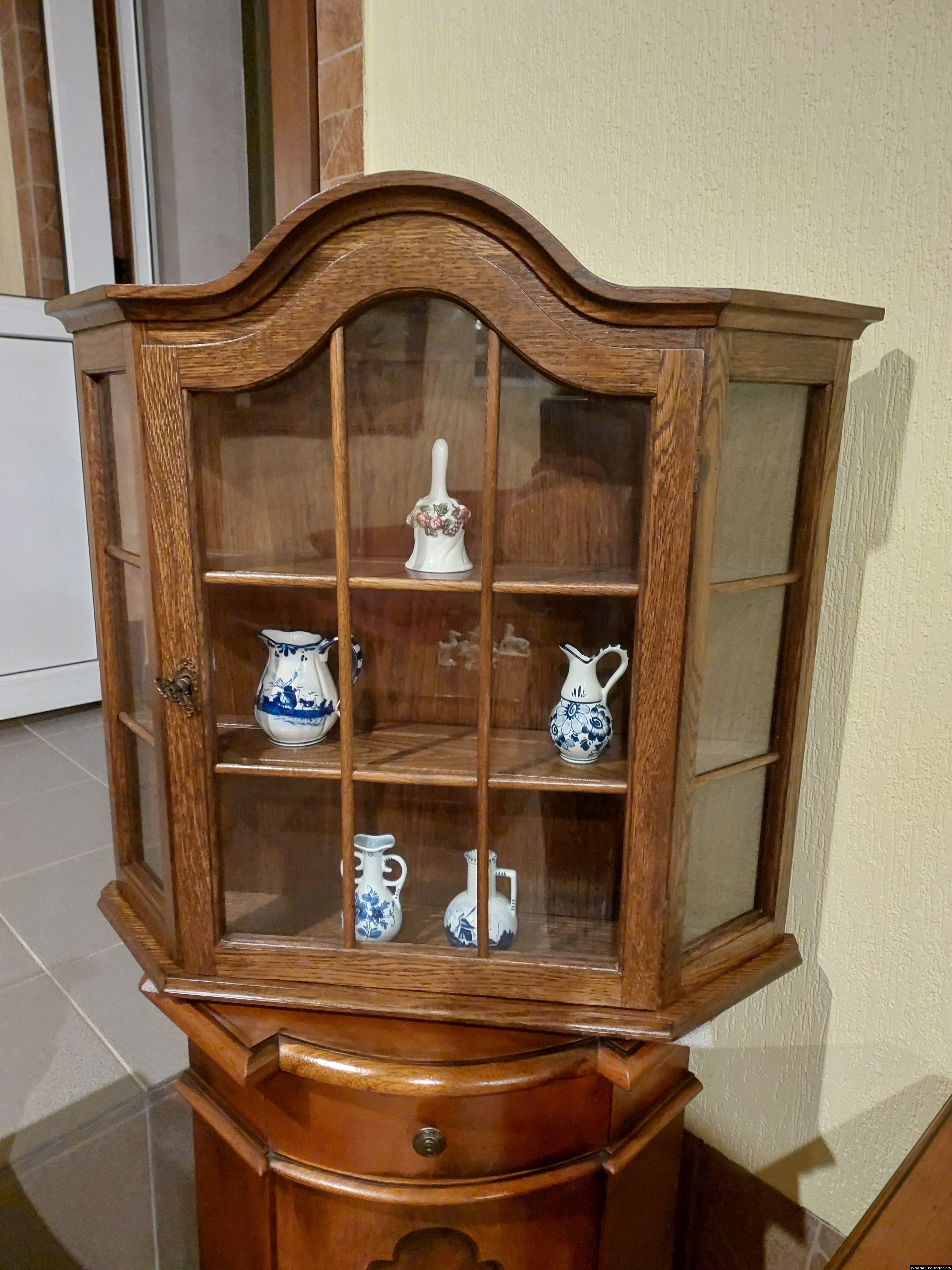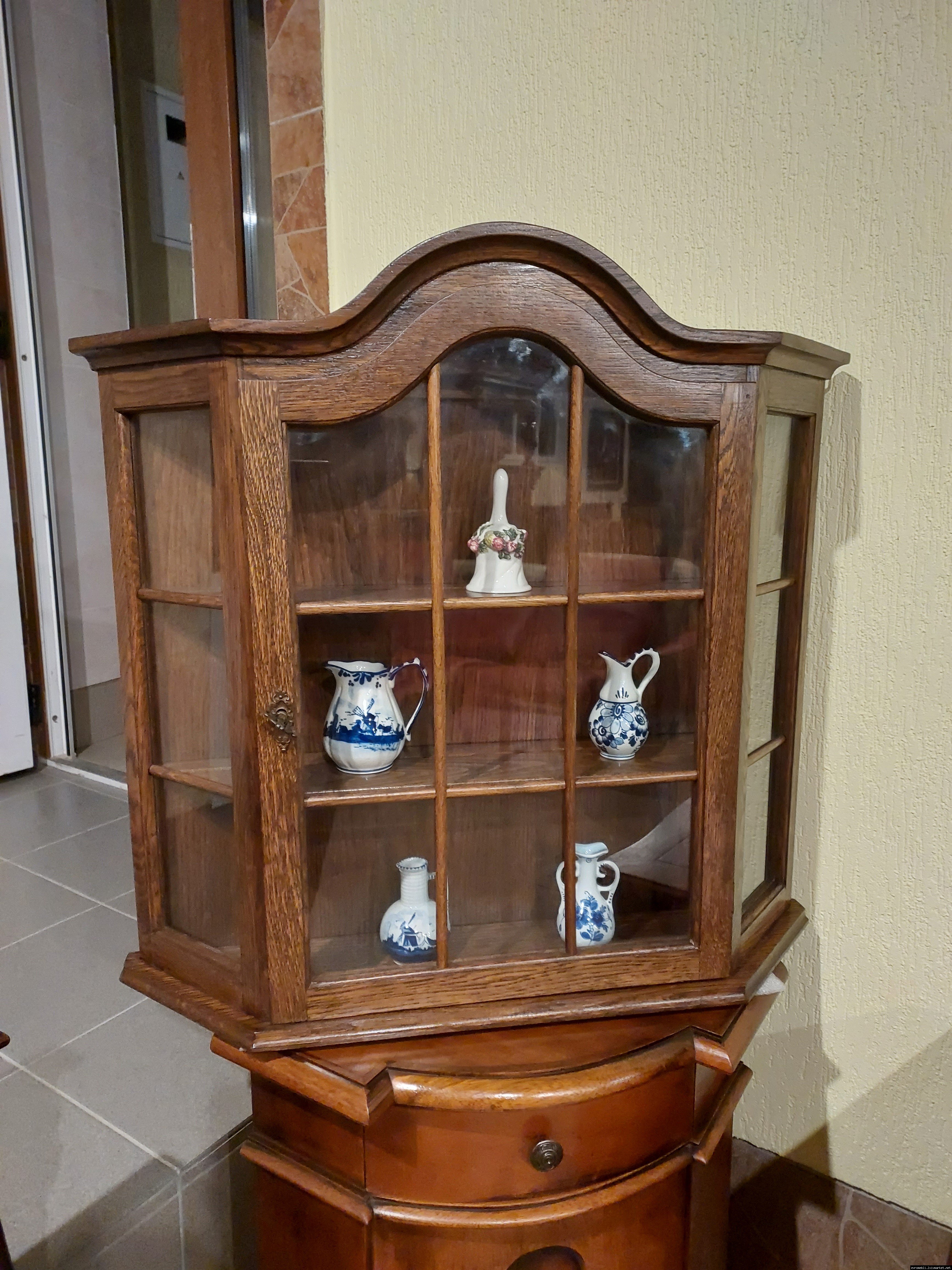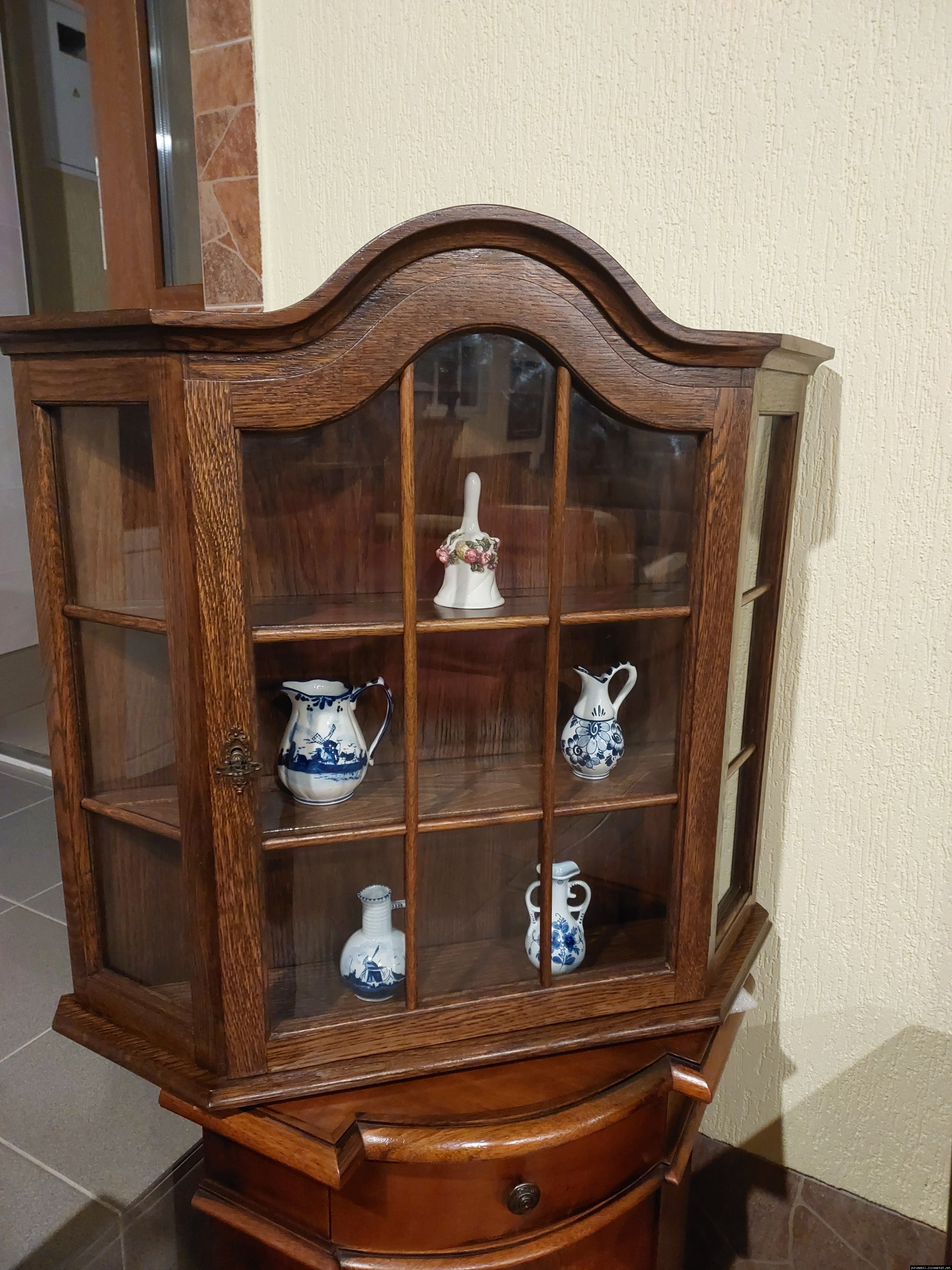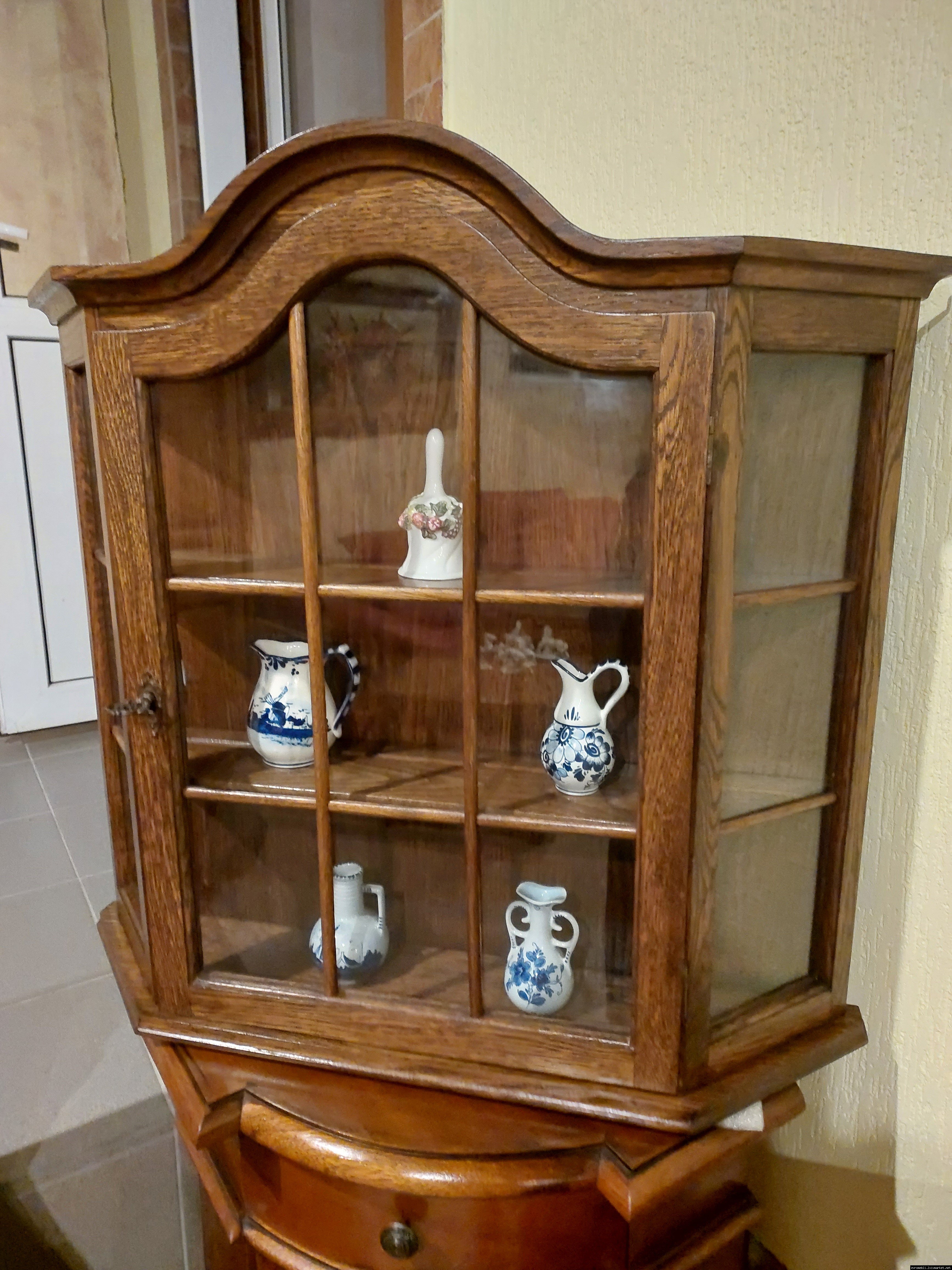 Красива, маленька, деревяна, підвісна вітринка. Вітрина виготовлена з масиву натурального дерева, темно- золотистий дуб, має одну дверку зі ском. Вітрина меленька та компактна, в хорошому стані, привезена з Бельгії.