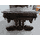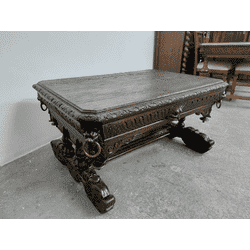 Неймовірно красивий антикварний журнальний стіл в стилі Вікторіанської епохи, неоготика. Стіл деревяний на чотирьох різьблених ніжках, виготовлений з масиву натурального дерева, французький дуб 1880-х років, щедро декорований різьбою ручної роботи, столешня прямокутної форми зі зрізаними кутиками, кути столу прикрашають левині голови з кільцем у пащі, ніжки столу мають форму гротескних химерних дельфінів. Стіл з вусувною шухлядою, повністю масивний, в дуже хорошому стані для свого віку, привезений з Бельгії.