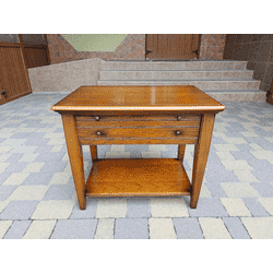 Класичний журнальний стіл в англійському стилі. Стіл деревяний, на чотирьох точених ніжках, виготовлений з масиву натурального дерева, має одну відкидну дверку та велику відкриту полицю, столешня столика прямокутної форми. Стіл в хорошому стані, повністю масивний, привезений з Бельгії.