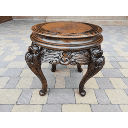 Красивий, старовинний журнальний столик в східному стилі. Столик на чотирьох масивних, точених ніжках, виготовлений з масиву натурального дерева, декорований масивною обємною різьбою ручної роботи, стільниця круглої форми. Столик в хорошому стані, привезений з Бельгії. Цей досить цікавий предмет з легкістю впишеться в інтерєр приміщення, виконуючи одночасно декоративну і практичну функції. Столик може використовуватися в якості підставки під вази, квіти або освітлювальні прилади.